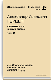 В первый том Сочинений А. И. Герцена, русского революционного демократа, философа-материалиста, включены философские произведения периода 1832—1847 гг.— «Дилетантизм в науке», «Письма об изучении природы» и др. Во второй том Сочинений входят работы 1848—1870 гг.: «С того берега», «Русский народ и социализм», «Концы и начала» и другие.