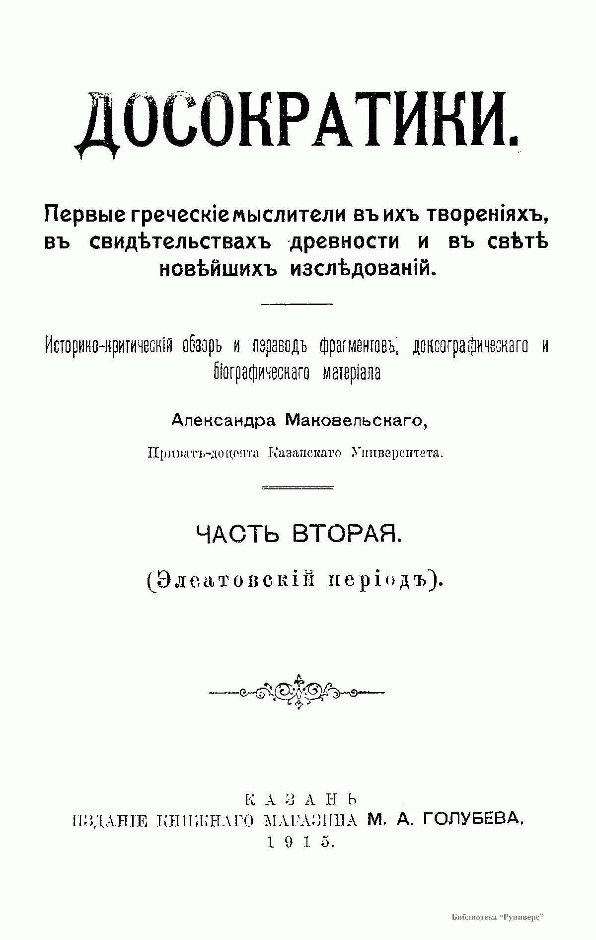 Досократики. Первые греческие мыслители в их творениях, в свидетельствах древности и в свете новейших исследований. Историко-критический обзор и перевод фрагментов, доксографического и биографического материала Александра Маковельского, приват-доцента Казанского Университета.