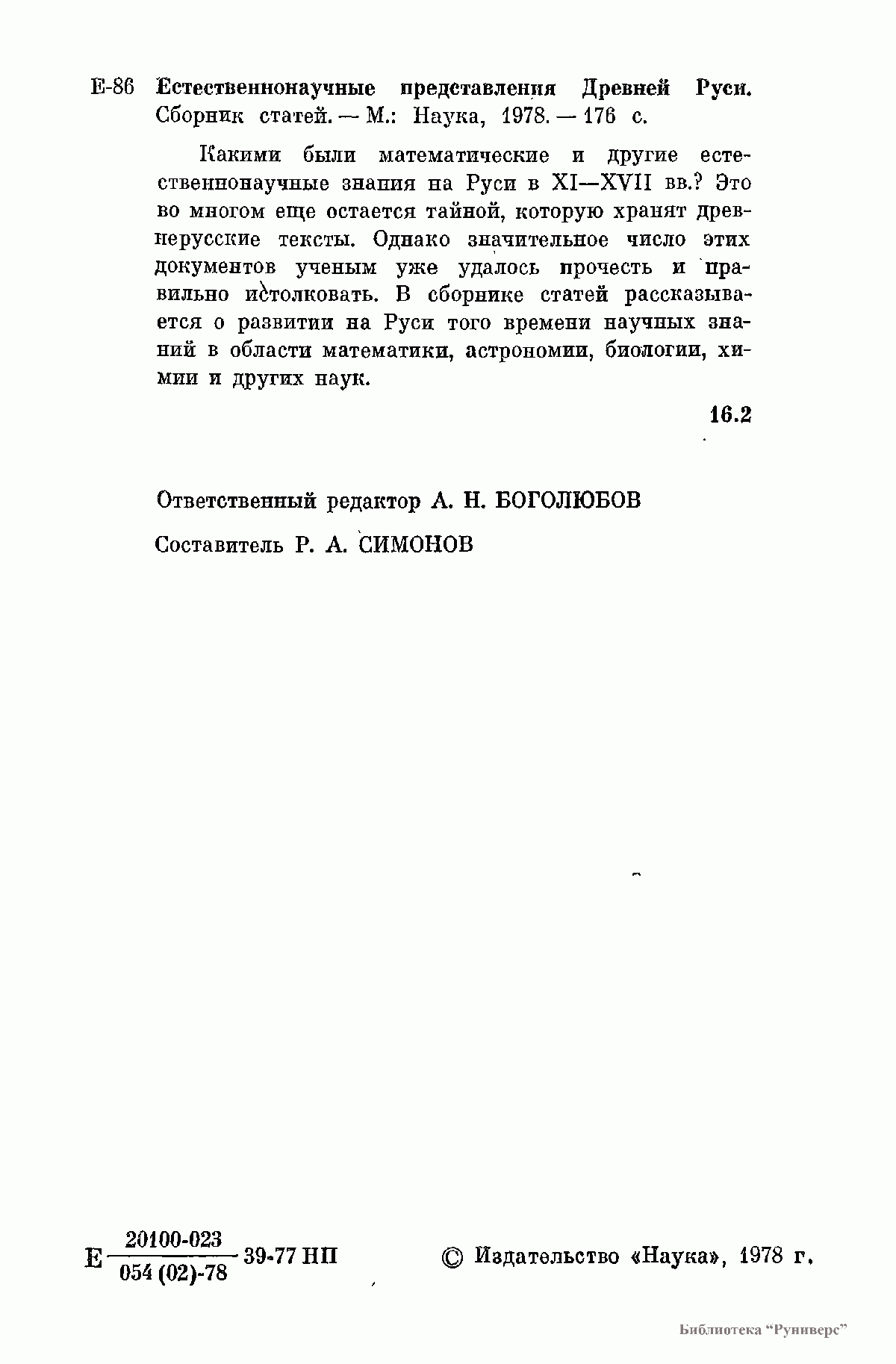 Какими были математические и другие естественнонаучные знания на Руси в XI—XVII вв. Это во многом еще остается тайной, которую хранят древнерусские тексты. Однако значительное число этих документов российским ученым уже удалось прочесть и правильно истолковать. В сборнике статей специалистов, представляющих различные дисциплины и направления исследований, рассказывается о развитии на Руси того времени научных знаний в области математики, астрономии, биологии, химии и других наук. Сборник статей. Боголюбов А.Н. (отв. ред.), Симонов Р.А. (сост.)