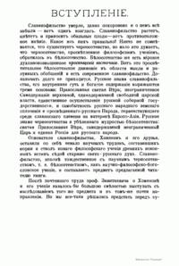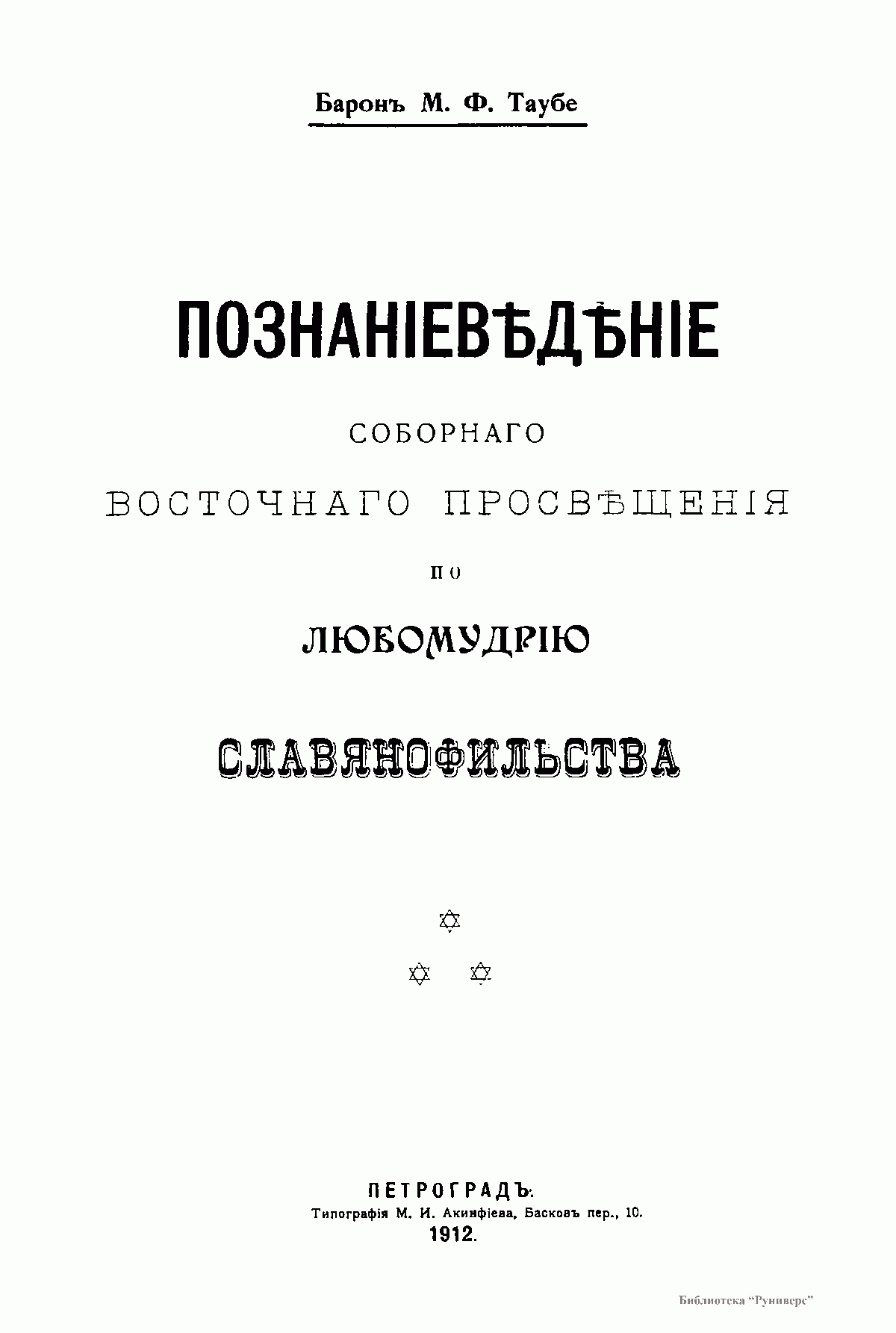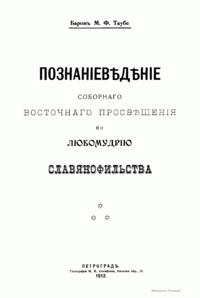 Два обстоятельства побудили автора издать исследование по "старому славянофильству": 1) то, что исследователи славянофильского любомудрия не привели его в строго соразмерный и обработанный уклад, который охватывал бы его учение целикомъ и со всех сторон; 2) что нет еще писателя, который сравнил бы славянофильство, как философское учение, в его целом, со всею совокупностью западно-европейской учености и определил точно, научно и философски: в чем заключается отличие основ восточного просвещения от начал западной культуры и цивилизации и где сосредоточивается вся философская суть этого различия. Решение этих двух вопросов — цель усилий Михаила Фердинандовича Таубе, который нe будучи вполне уверенным, что выполнил задачу с "желательною удовлетворительностью", тем не менее полагает, что его попытка поставить и разрешить хотя-бы приблизительно "коренные вопросы всемирного просвещеня", указанные славянофильством, можетъ быть полезна сама по себе.