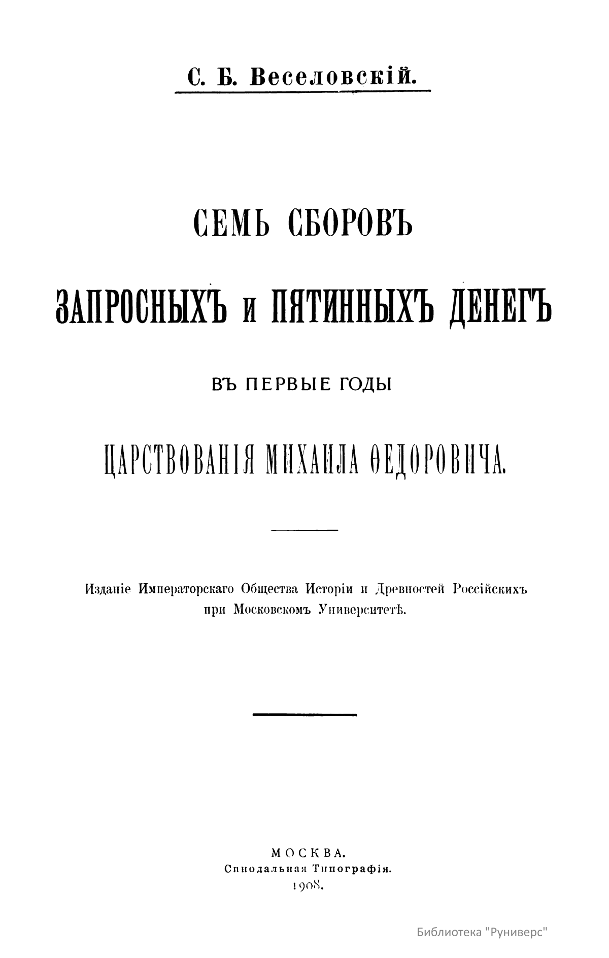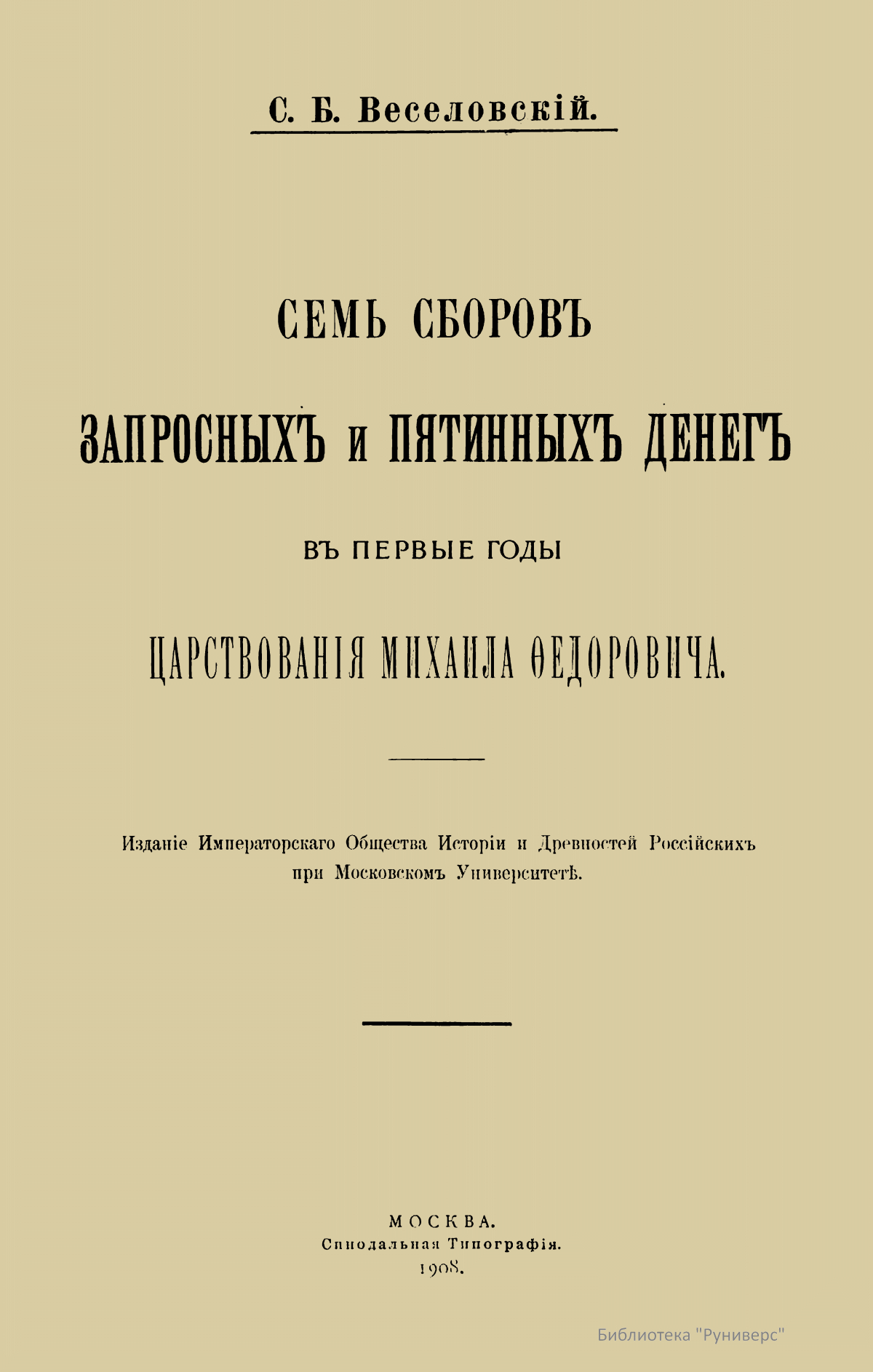 СЕМЬ СБОРОВЪ ЗАПРОСНЫХЪ и ПЯТИННЫХЪ ДЕНЕГЪ въ первые годы ЦАРСТВОВАНІЯ МИХАИЛА ѲЕОДОРОВИЧА.