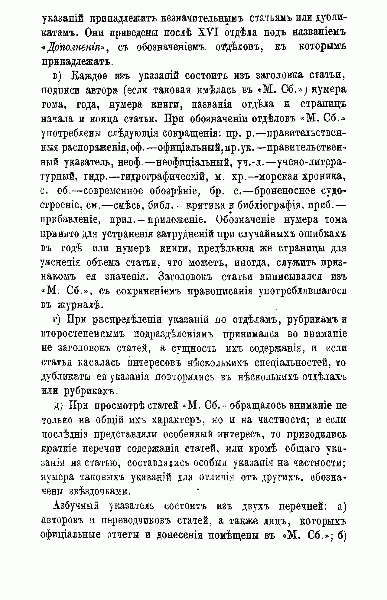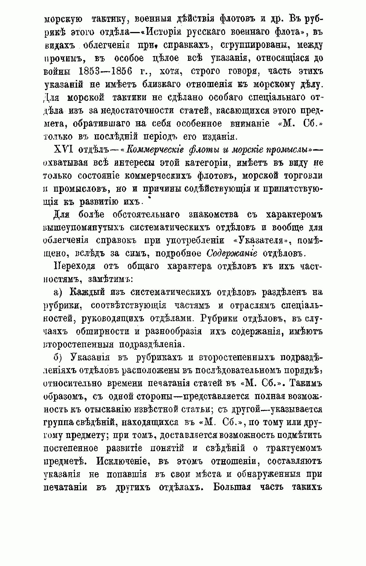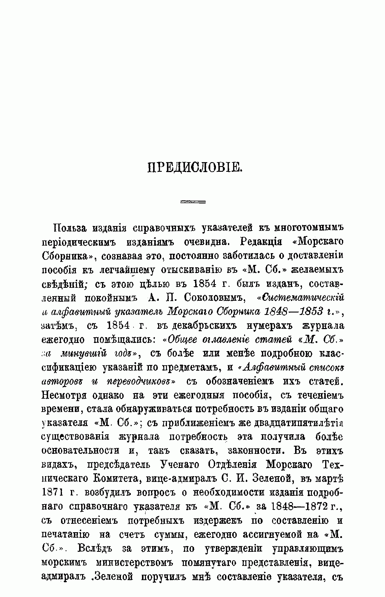 Журнал «Морской сборник» является старейшим периодическим изданием по истории морского дела, который без перерывов и переименования выходит в нашей стране более 160 лет. Журнал всегда был официальным органом военно-морского ведомства России, в котором публиковались правительственные распоряжения о деятельности учреждений флота, личном составе; отчеты о плаваниях, маневрах, учениях и многое другое. С начала 1860-х гг. на страницах журнала широко обсуждались коренные преобразования в армии и на флоте, наблюдалось преобладание статей по военно-морскому искусству, технике, истории, обзоров литературы, в том числе и художественной. На протяжении всей своей истории журнал неоднократно становился важнейшим научно-публицистическим изданием, освещающим острые социально-политические вопросы. В «Морском сборнике» публиковались статьи по истории флота А.П. Соколова, С.И. Елагина, Ф.Ф. Веселаго, В.Ф. Головачёва, публицистические статьи и художественные произведения таких выдающихся российских писателей как И.А. Гончаров, А.Ф. Писемский и К.М. Станюкович. В числе видных ученых-авторов журнала можно также назвать хирурга Н.И. Пирогова, одного из создателей педагогики К.В. Ушинского, энциклопедиста и автора знаменитого толкового словаря В.И. Даля. Авторами статей выступали такие прославленные флотоводцы и ученые как Ф.Г. Толь, Э.Х. Ленц, Б.С. Якоби, Е.В. Путятин, С.О Макаров, Г.И. Бутаков, А.Н. Крылов, С.К. Джевецкий. Для более удобного пользования материалами, опубликованными в «Морском сборнике» в середине 1870-х гг., были подготовлены библиографические указатели, помещаемых в нем статей. Эти указатели до сих пор представляют собой значительный интерес для историков флота. Как указывал в своём предисловии автор-составитель библиографического справочника за 1848-1872 гг. подполковник И.И. Петров: «Польза издания указателей к многотомным периодическим изданиям очевидна. Редакция «Морского сборника», сознавая это, постоянно заботилась о доставлении пособия к легчайшему отысканию… желаемых сведений». Фактически же первая библиография военно-морских изданий «Русская морская библиотека», вышедшая в 1847-1852 гг., была составлена капитаном 2-го ранга, замечательным морским офицером и историографом русского флота А.П. Соколовым. Затем на страницах «Морского сборника» Н. Минин поместил систематический обзор морской литературы, выходившей за период с 1851 по 1853 г. С 1854 г. в декабрьских номерах журнала ежегодно помещались «Общий указатель статей за минувший год». Наконец, в 1875 г. И.И. Петров издал систематический указатель статей «Морского сборника», охватывавший содержание этого издания за первые 25 лет его существования.