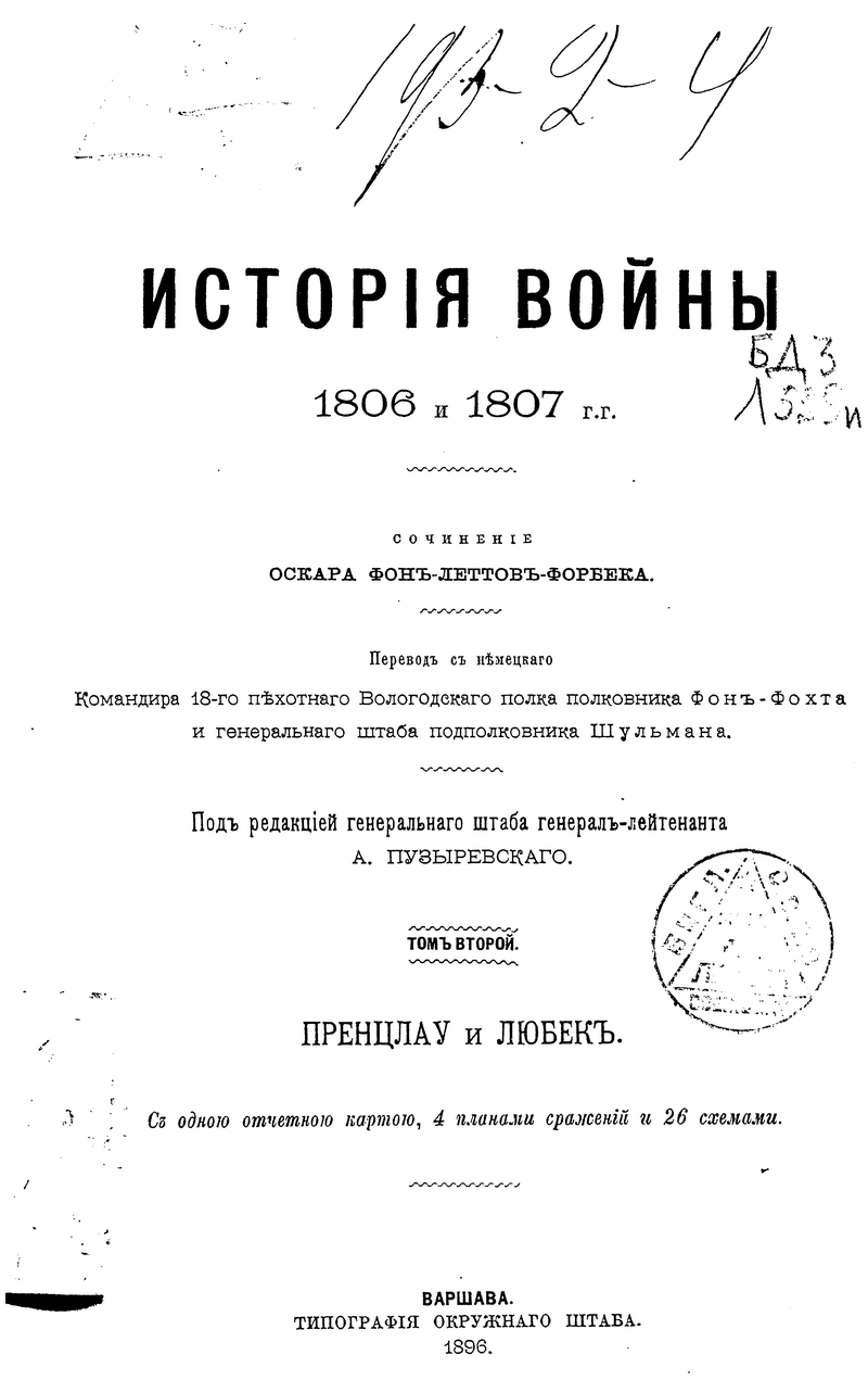 Перевод на русский язык фундаментального многотомного военно-исторического труда по истории войны русско-прусского союза с Наполеоном в 1806-1807 годах, написанного немецким военным историком Оскаром фон Леттов-Форбеком, был подготовлен при штабе Варшавского военного округа под руководством генерал-лейтенанта Генерального штаба, профессора военной истории академии Генерального штаба А.К. Пузыревского, получив при этом одобрение Военного министерства. Деятельность А.К. Пузыревского как одного из выдающихся военных педагогов и просветителей получила в России широкую известность. Представленное им исследование немецкого военного писателя, снабженное многочисленными картами и схемами боевых действий, сих пор представляет научный интерес. Одним из важнейших достоинств данного исследования является то, что автор широко использовал богатейший документальный массив как прусских, так и французских военных архивов, создав объективную картину одного из сложнейших этапов эпохи наполеоновских войн. Русско-прусско-французская война 1806-1807 гг. война между 4-й коалицией европейских держав (Великобритания, Россия, Пруссия, Саксония, Швеция) и наполеоновской Францией. Фактически эти две кампании являлась продолжением русско-австро-французской войны 1805 г. Не имея общего плана войны, союзники действовали несогласованно, что позволило Наполеону разбить их поочерёдно. Так 2 (14) октября 1806 г. в масштабном сражении под Йеной и Ауэрштадтом французская армия разгромила прусско-саксонские войска, после чего наполеоновские войска оккупировали большую часть Пруссии и 12 (24) октября заняли Берлин. Русская армия в составе трёх корпусов (около 160 тыс. чел.) под командованием генерал-фельдмаршала М. Ф. Каменского сосредоточилась в районе Пултуск, Остроленка, Брест-Литовск, выдвинув передовые отряды к Висле. 16 (28) ноября французские войска заняли Варшаву. Наполеон предпринял попытку окружить главные силы русских войск, но 14 (26) декабря в сражении под Пултуском русские войска сорвали этот план, нанеся поражение корпусу маршала Ж. Ланна. Затем русская армия отошла в район Тыкоцина, а наполеоновские войска расположились на зимние квартиры. 4 (16) января 1807 русская армия под командованием нового командующего генерал-адъютанта Л.Л. Беннигсена начала наступление из района Бялы в Восточную Пруссию с целью не допустить занятия французами Кенигсберга и Пиллау и нанести поражение изолированным корпусам Нея и Бернадота. Наполеон, узнав о продвижении русских войск, 20 января (1 февраля) направил главные силы на север, пытаясь обойти левый фланг русской армии и отрезать экспедиционные силы русских от России. Русские войска, ведя арьергардные бои, отошли к Прейсиш-Эйлау, где 26–27 января (7– 8 февраля) произошло встречное упорное сражение, в котором русские войска успешно отразили удары наполеоновской армии. 2 (14) июня 1807 г. в сражении под Фридландом русская армия, проявив чудеса героизма и мужества, вследствие неадекватных мер командования, была вынуждена отступить. В июне 1807 г. состоялось свидание Наполеона с императором Александром I в Тильзите и был подписан тяжёлый для России вынужденный союзный договор с наполеоновской Францией. Все эти военно-исторические события детально изложены в данном труде.