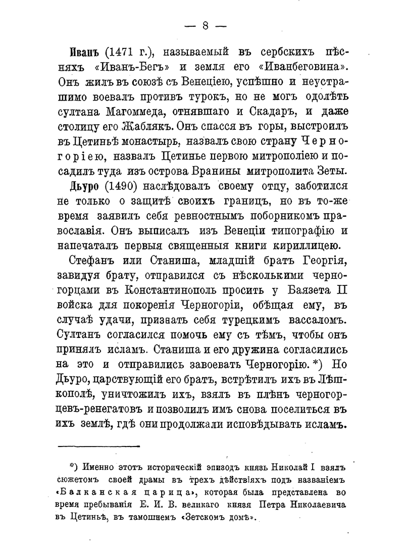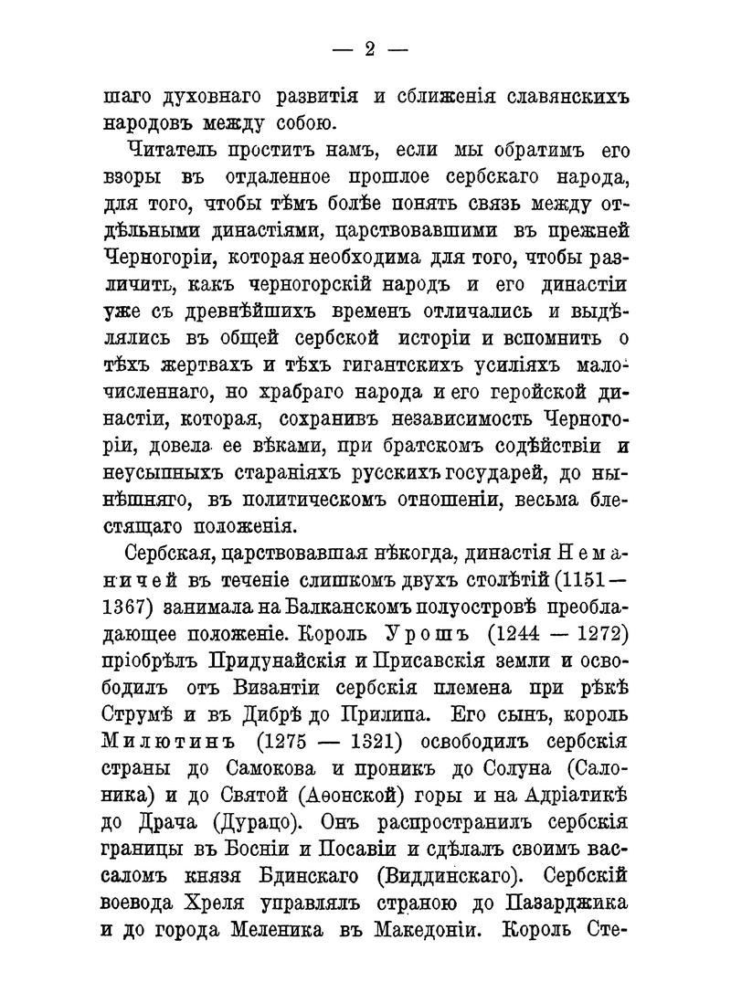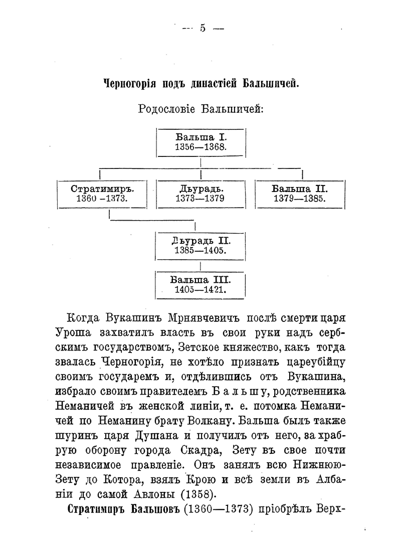 Черногорский народ и его династии с древнейших времён выделялись в общей сербской истории. В книге содержатся краткие сведения о династии Бальшичей (1356 – 1421); династии князей Черноевичей (1423 – 1516); о Черногории, управляемой владыками-митрополитами (1499 – 1695); о царствующей династии Петровичей-Негошей (1697 – 1851); о Черногории под властью светских князей из дома Петровичей-Негошей (с 1851).