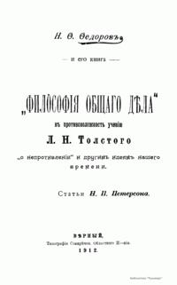 Н.Ф. Фёдоров и его книга "Философия общего дела" в противоположность учению Л.Н. Толстого "о непротивлении" и другим идеям нашего времени