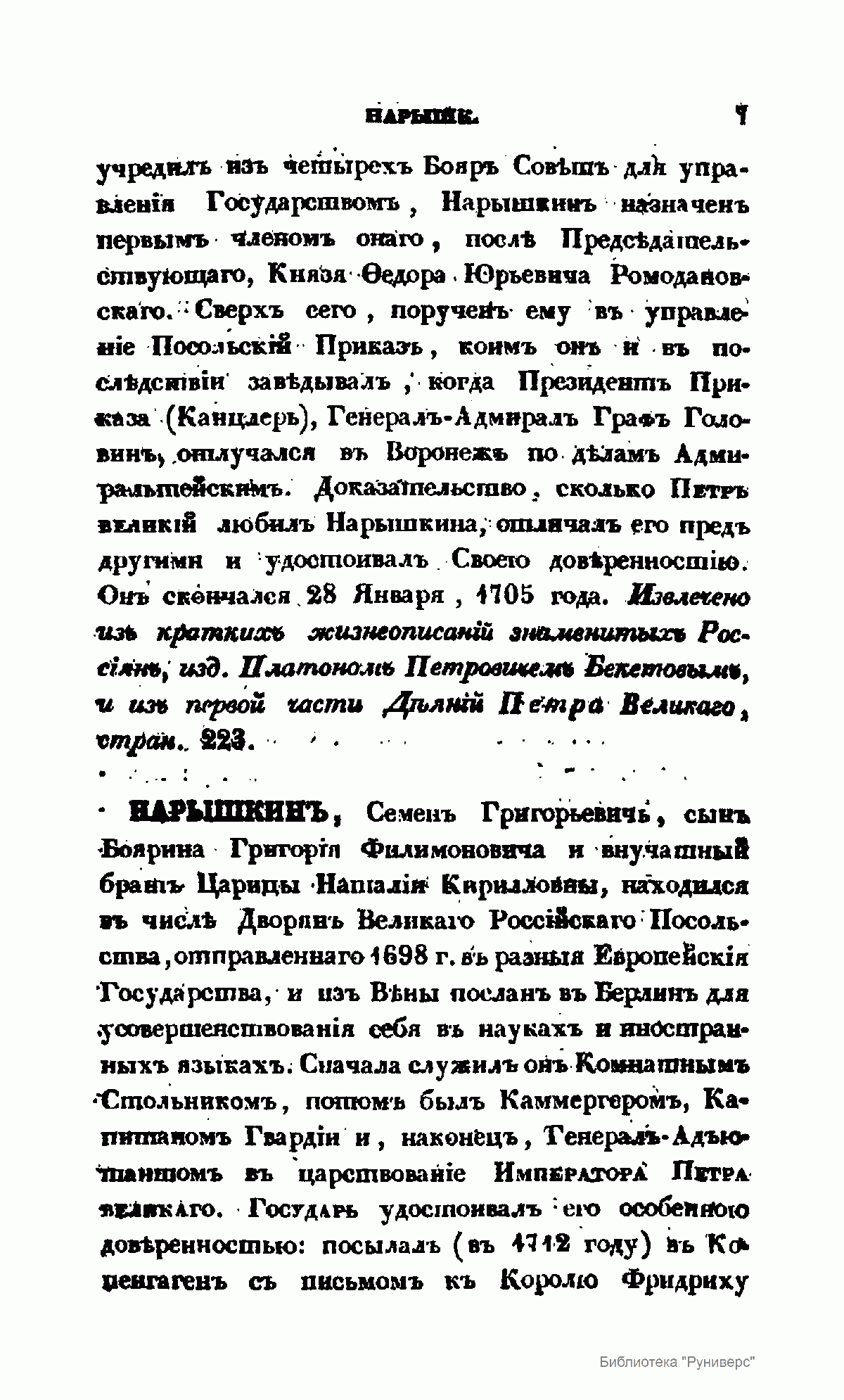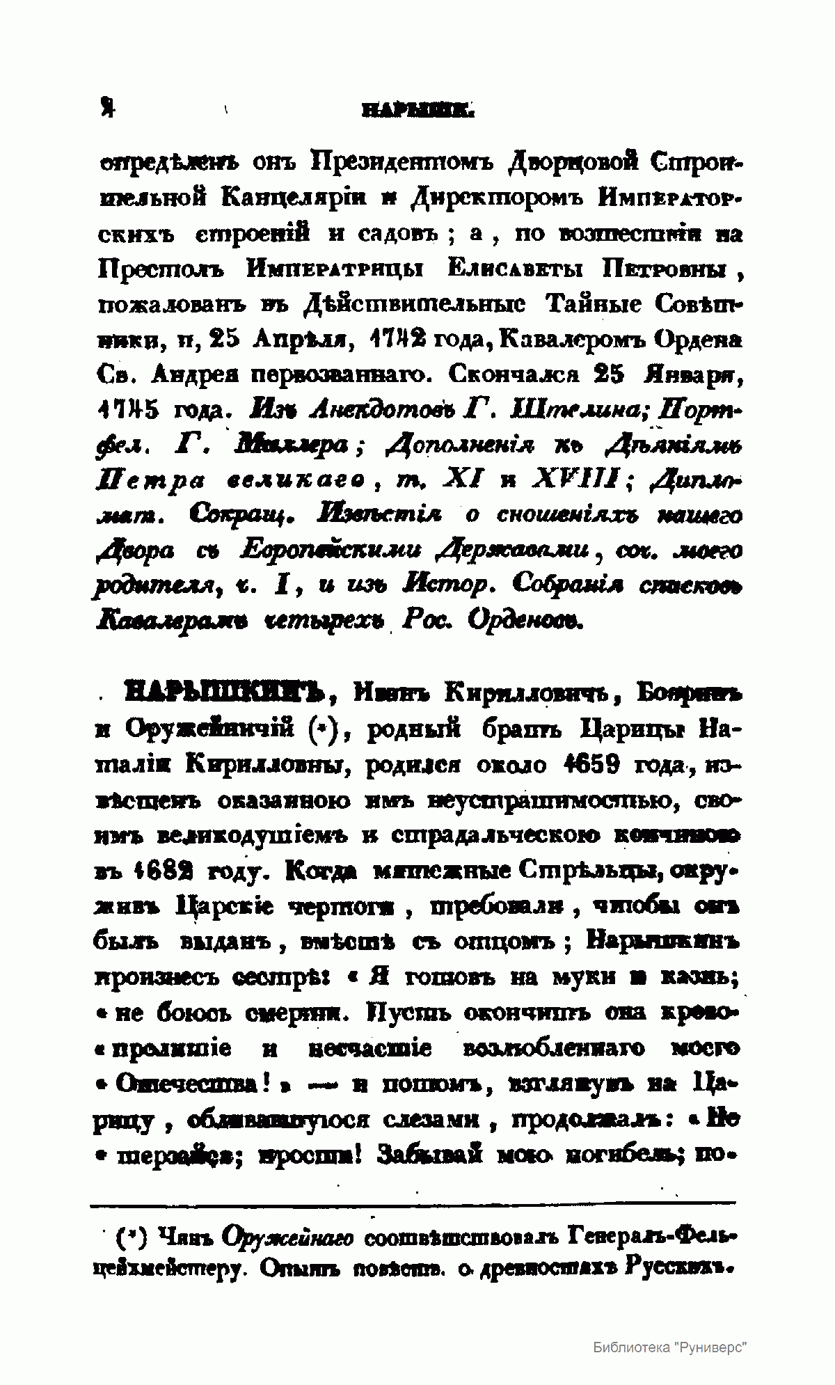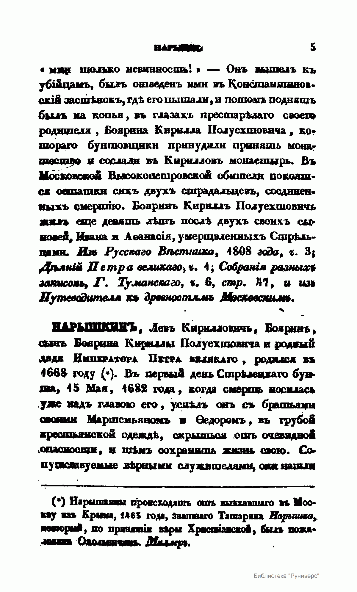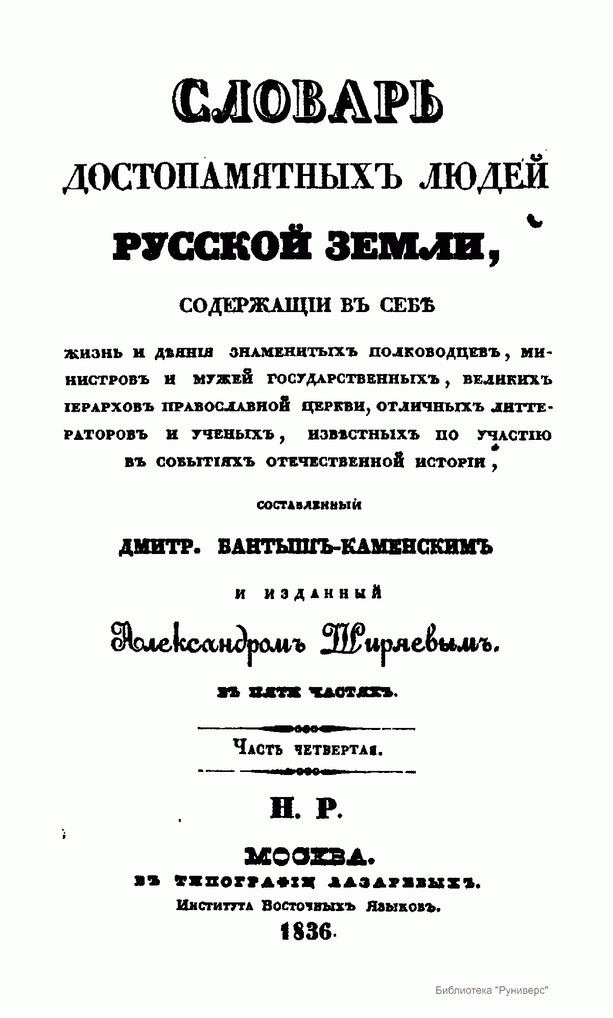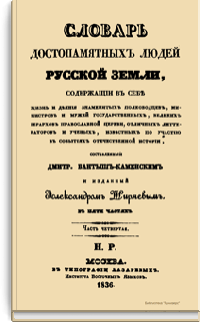 «Словарь достопамятных людей Русской земли…», впервые вышедший в свет в 1836 г. в пяти частях, фактически стал главным трудом видного историка, писателя и археографа николаевской эпохи Д.Н. Бантыш-Каменского. Получив прекрасное домашнее образование, автор последовательно шел по стопам своего отца, известного государственного деятеля, историка и архивиста