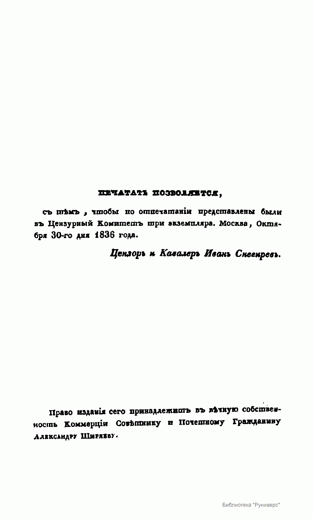 На обороте титульного листа имеется разрешение цензора: "Печатать позволяется с тем, чтобы по отпечатании представлены были в Цензурный Комитет три экземпляра. Москва, Октября 30-го дня 1836 года. Цензор и Кавалер Иван Снегирев".