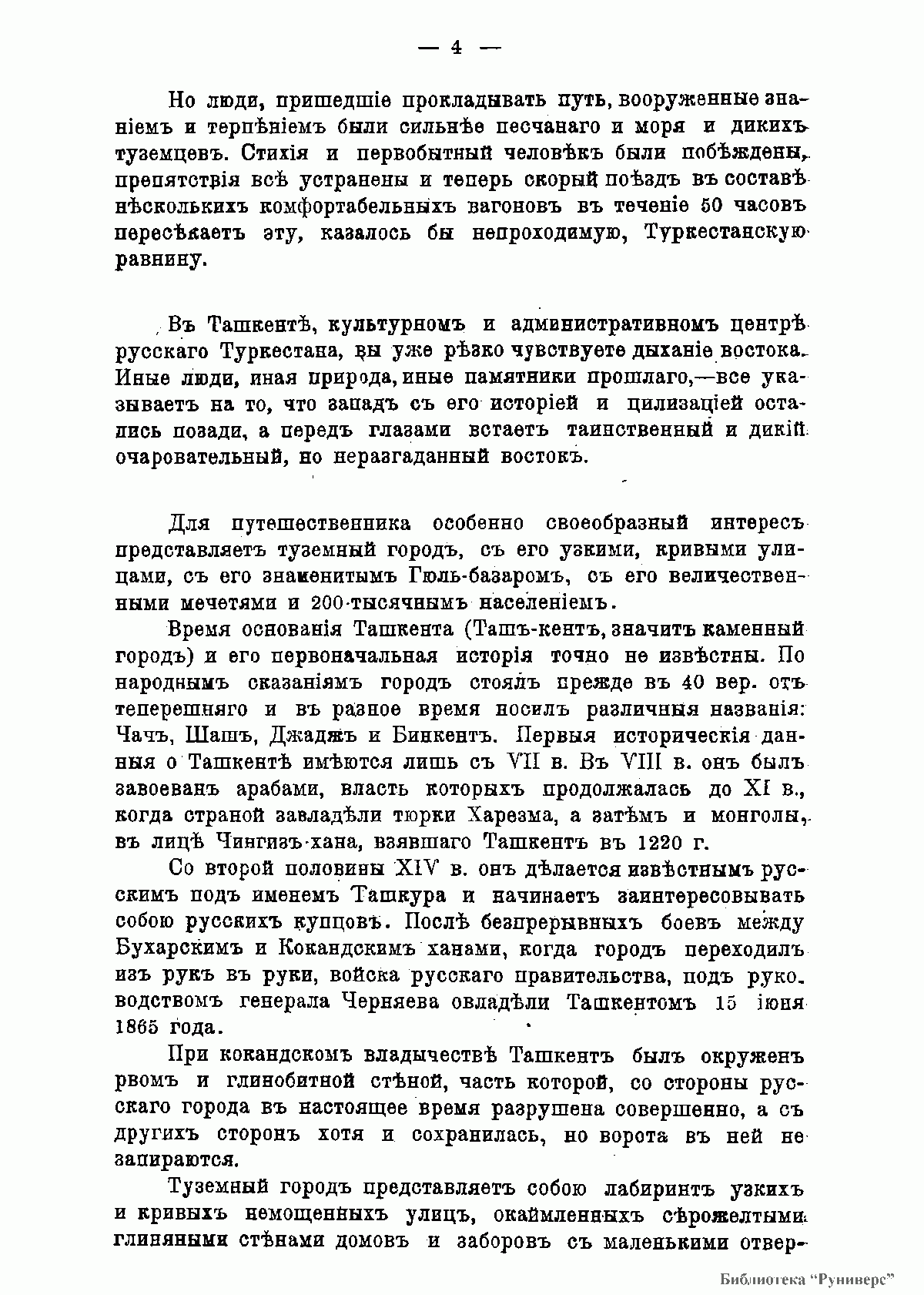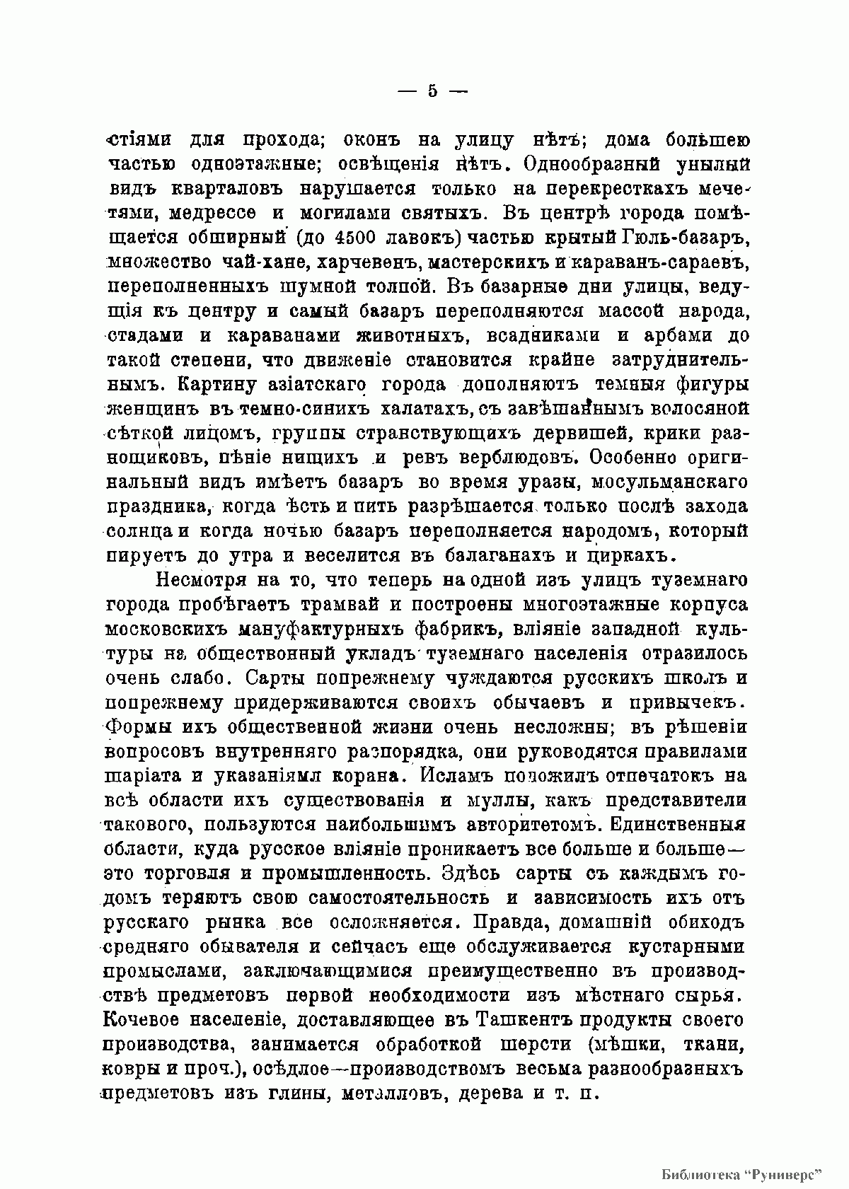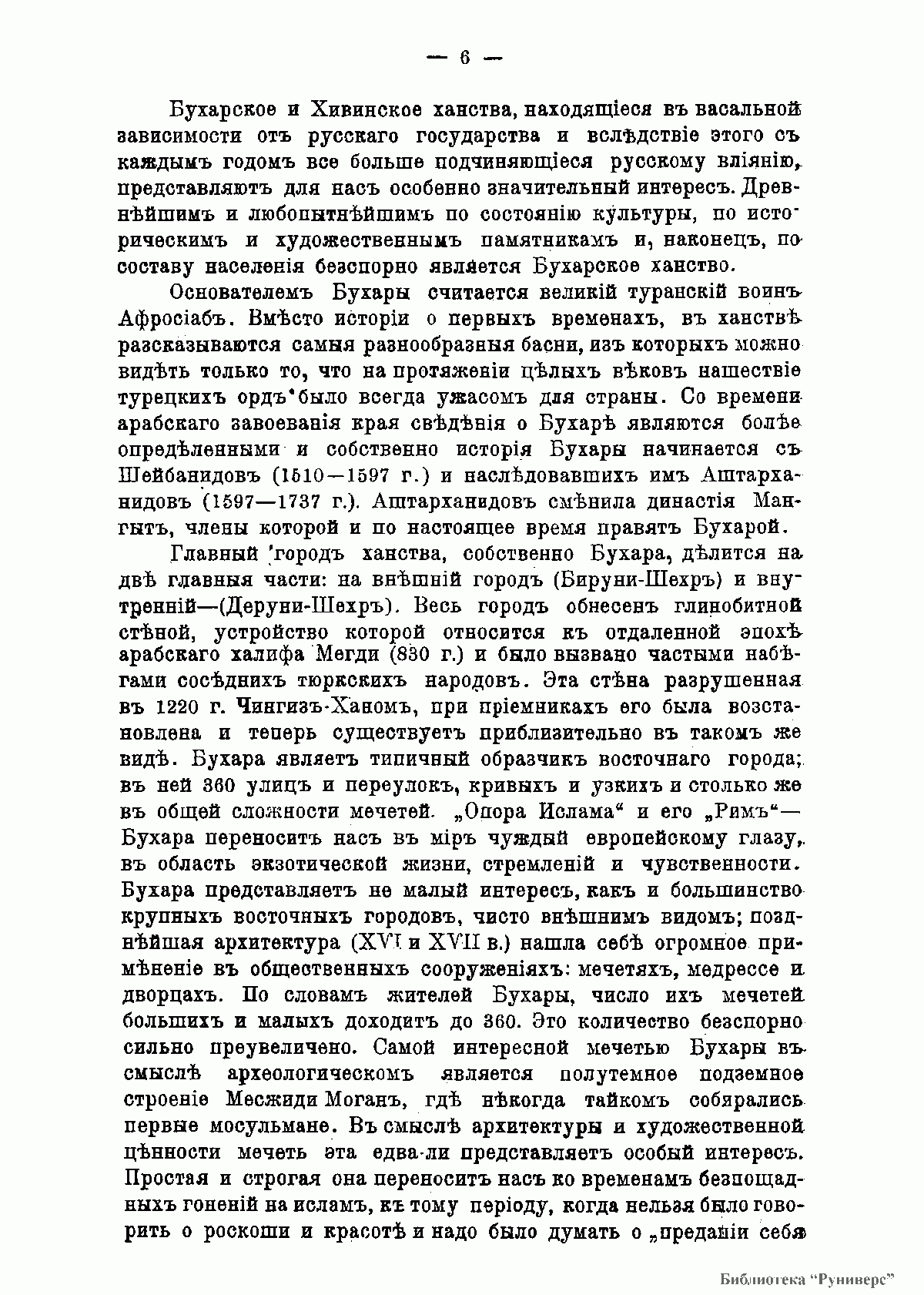 Краткий очерк о культурно-исторических и бытовых традициях народов Центральной Азии, написанный в виде увлекательных путевых заметок, в доступной и популярной форме знакомит читателя с этим удивительным и во многом загадочным для россиян краем. С древнейших времен на обширных пространствах плодородных долин величайших рек Аму-Дарьи и Сыр-Дарьи, в горных ущельях, в пустынях и на степных пастбищах переплетались исторические судьбы многих различных по этническому составу, быту, религии, уровню культурного развития народов, создавших неповторимый геополитический и этнокультурный облик Средней Азии. Вступая друг с другом в жестокую борьбу, эти народы перемешивались, образовывая племенные союзы, сливаясь в могущественные кочевые и оседлые империи, создавали бесценные сокровища науки, искусства, архитектуры, литературы, приходили в упадок, погружались в безвестность и снова возрождались. Эти древние народы и их далекие потомки – узбеки, таджики, туркмены, казахи, каракалпаки и киргизы оказали заметное влияние на всю мировую историю. Особую роль в их судьбе сыграла Россия, сплотив и сформировав на протяжении XVIII–XX вв. уникальный конгломерат традиций и новаций в культуре этого региона. Данная брошюра, выпущенная в свет в роковом для российской государственности 1917 году товариществом «Образование», была рассчитана на массовую читательскую аудиторию и носила учебно-педагогическую и просветительскую направленность. В брошюре описывается дорога к Ташкенту и сам старый Ташкент, вкратце приведена история Бухарского ханства. Красочно описывается городской ландшафт Бухары и его постройки. Дана характеристика и соседнего Хивинского ханства, а также древнейшего города Средней Азии Мерва, руины которого ныне являются памятником Всемирного наследия человечества. Отдельные главы брошюры посвящены описанию искусства Средней Азии, ее керамики, ковроткачеству, тканям и вышивке. Особое внимание обращено к описанию архитектурного богатства Востока, главным образом, памятникам Самарканда. Ценным дополнением к тестовому материалу являются 28 оригинальных иллюстраций, помещенных на отдельных листах.