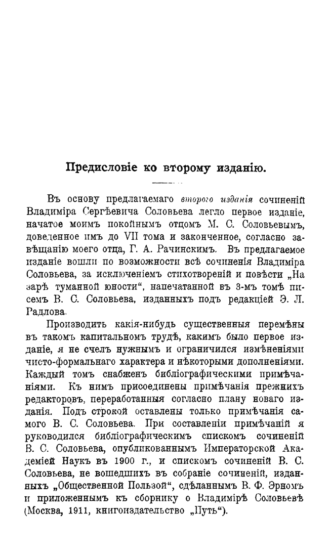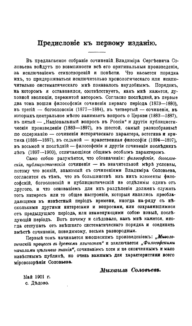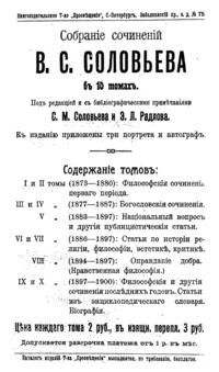 В первые два тома вошли его философские сочинения 1873-1880 гг., в третий – богословские 1877-1884 гг., в четвертом собраны работы, посвященные Церкви 1883-1887 гг., в пятом – публицистические произведения, включая «Национальный вопрос в России», том шестой объединяет критические сочинения, работы по эстетике и труды исторического характера, седьмой том посвящен нравственной философии, а в заключительных томах представлены сочинения последних лет жизни Соловьева.