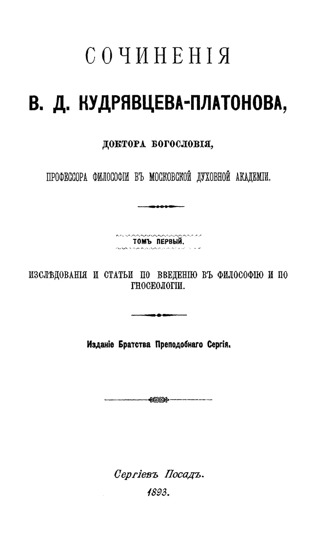 Посмертное издание собрания сочинений видного представителя русского теизма – профессора Московской Духовной академии и Председателя Братства Преподобного Сергия. Несмотря на то, что в истории русской философии Кудрявцев-Платонов не получил известности как основатель оригинальной философской системы, его по праву считают превосходным философским писателем и талантливым выразителем идеи непротиворечивого сочетания философского миросозерцания и христианского учения.