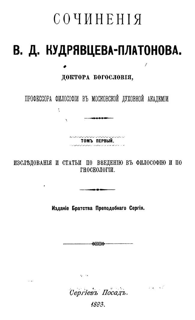 Посмертное издание собрания сочинений видного представителя русского теизма – профессора Московской Духовной академии и Председателя Братства Преподобного Сергия. Несмотря на то, что в истории русской философии Кудрявцев-Платонов не получил известности как основатель оригинальной философской системы, его по праву считают превосходным философским писателем и талантливым выразителем идеи непротиворечивого сочетания философского миросозерцания и христианского учения.