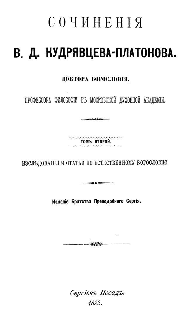 Посмертное издание собрания сочинений видного представителя русского теизма – профессора Московской Духовной академии и Председателя Братства Преподобного Сергия. Несмотря на то, что в истории русской философии Кудрявцев-Платонов не получил известности как основатель оригинальной философской системы, его по праву считают превосходным философским писателем и талантливым выразителем идеи непротиворечивого сочетания философского миросозерцания и христианского учения.