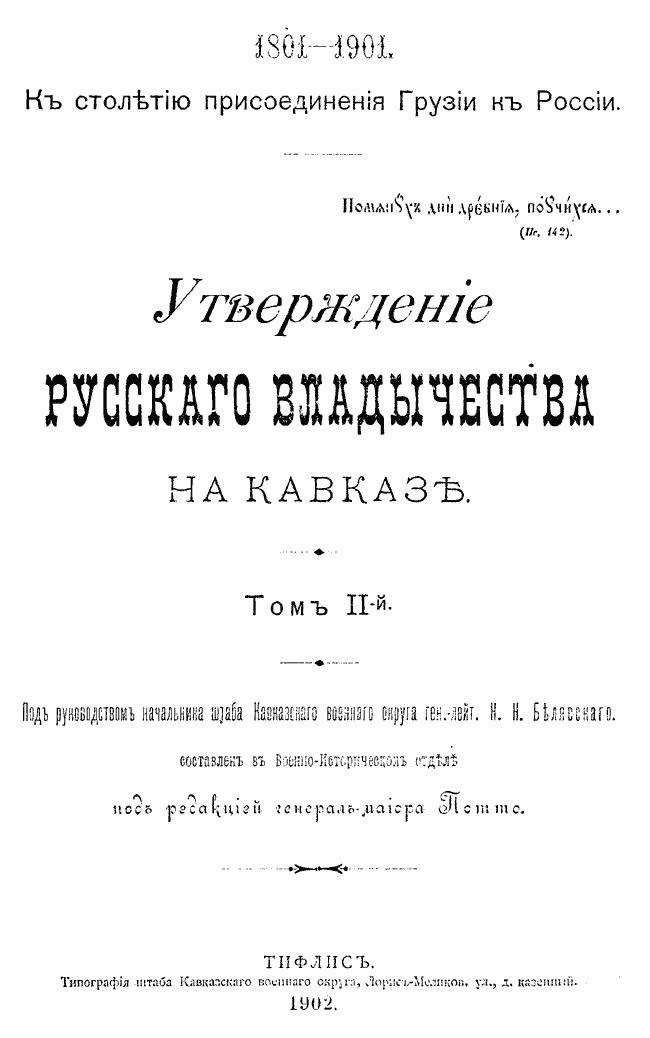 Фундаментальный исторический труд, содержащий историю кавказских войн, а также историю развития гражданского управления Кавказом.