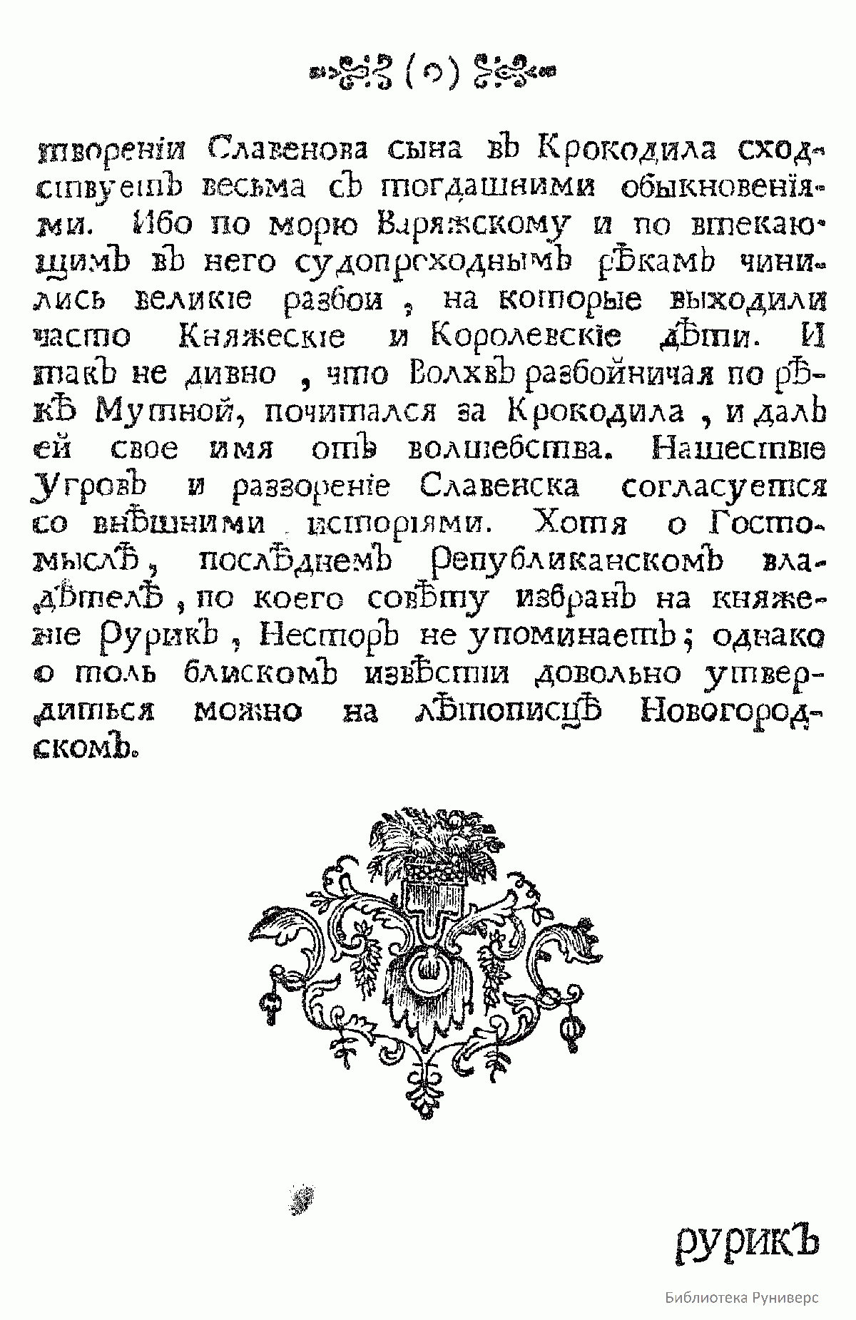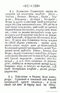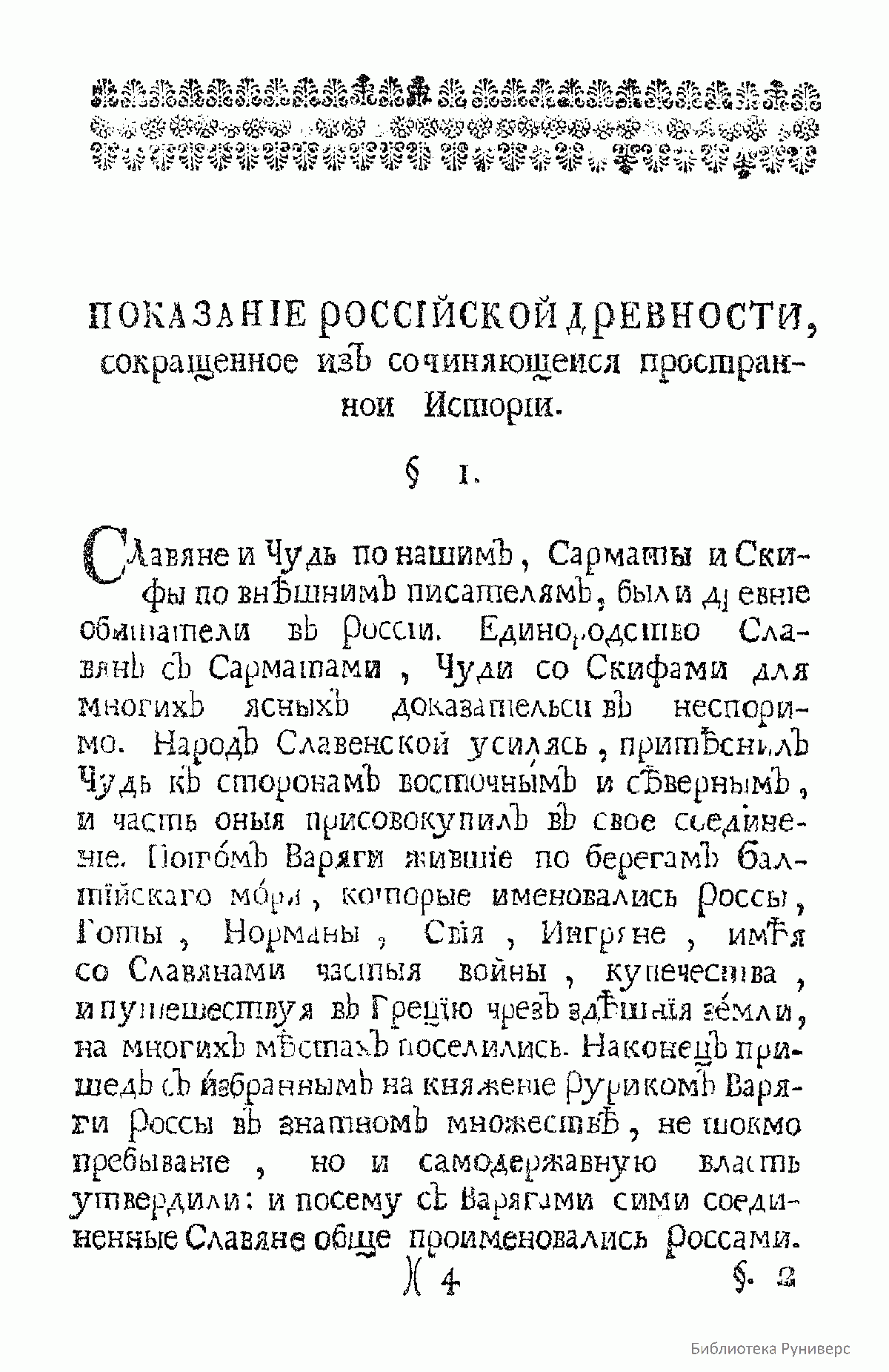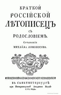 Ломоносов-историк известен значительно меньше, чем великий естествоиспытатель, хотя его исторические сочинения во второй половине XVIII столетия неоднократно переиздавались и имели широкую читательскую аудиторию, переводились на иностранные языки. Историей России М.В. Ломоносов начал заниматься ещё с середины 1740-х годов. Занятия историческими исследованиями Ломоносова, помимо чисто научных воззрений, побудили и политические причины. Он резко выступил с опровержением так называемой “нормандской” (варяжской) концепции происхождения древнерусской государственности. Он считал, что славяне прошли длительный и сложный путь исторического развития еще до появления государства, и этим историческая концепция Ломоносова приходила в очевидное противоречие с мнением его оппонентов о совершенной дикости славян до прихода варягов. Ломоносов считал, «что славянский народ был в нынешних российских пределах еще прежде Рождества Христова, то бесспорно доказать можно”. Сопоставляя данные разных источников, Ломоносов пришел к выводу, что славяне были среди народов, населяющих равнины юго-восточной Европы, по крайней мере, на протяжении тысячелетий до появления варягов. Спустя более ста лет выдающийся российский историк С.М. Соловьев справедливо отмечал, что решения Ломоносова по ряду частных исторических проблем были блистательны по «тогдашним средствам науки». В 1760 году типографией Московского университета был выпущен "Краткий российский летописец с родословием" – первый учебник по отечественной истории, подготовленный М.В. Ломоносовым и представленный в качестве учебной книги, адресованной наследнику престола, будущему императору, шестилетнему Павлу Петровичу. В своем предисловии-посвящении, написанном в форме стихотворной оды, Ломоносов призывает будущего государя: «В младенчестве твоем достойный видим плод. Расти и восходи, крепись к трудам преславным, Со прадедовыми великостию равным, Достигни поздних лет, как может человек. Дополни бог тебе неполный предков век. Гряди по их стопам, вослед Елисавете, – Ты будешь, как они, велик, возлюблен в свете». Краткий справочник по хронологии российской истории от ее начала до Петра Великого был написан в 1759 г., но рукопись не сохранилась. За стихотворным Посвящением великому князю Павлу Петровичу следует краткая глава «Показание российской древности, сокращенное из сочиняющейся пространной истории» (Ломоносов имеет в виду свою «Древнюю Российскую историю»). В ней сжато суммированы взгляды великого ученого на древность и величие славян и чуди и на славянское происхождение варягов-россов. Основной контекст «Краткого российского летописца образует хронологическое перечисление правителей-«государей» Руси и России. Текст этой части разбит на вертикальные колонки, из которых в двух первых дается последовательность поколений от Рюрика и «порядковый номер» правления. В 3-й, наиболее важной и информативной колонке помещен перечень основных событий каждого правления, а в 4-й колонке указывается год начала правления, и наконец, в 5-й – годы правления. В последней колонке указаны годы жизни владетеля. Периодизация русской истории приведена не в самом тексте, а в заголовках третьей колонки. Она подразделяется на Великое княжение Киевское и Новгородское, Великое княжение Московское,