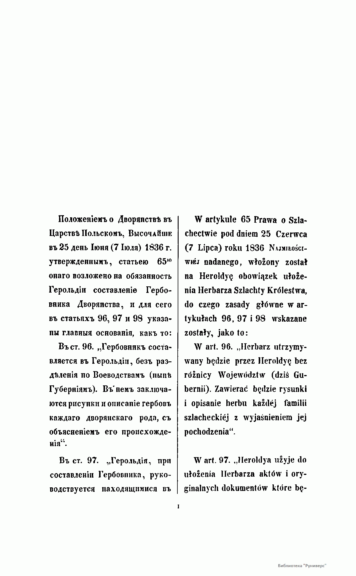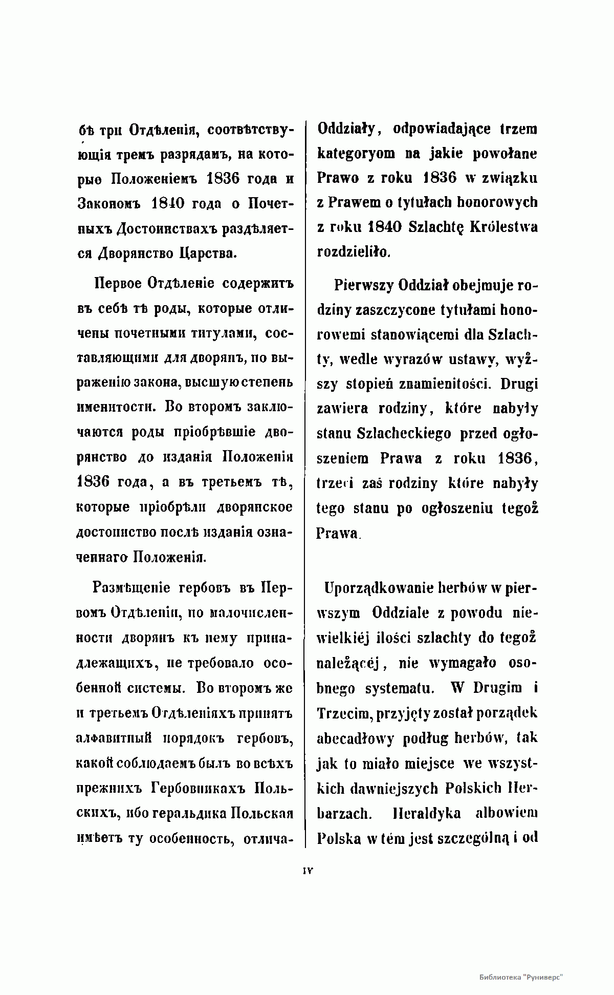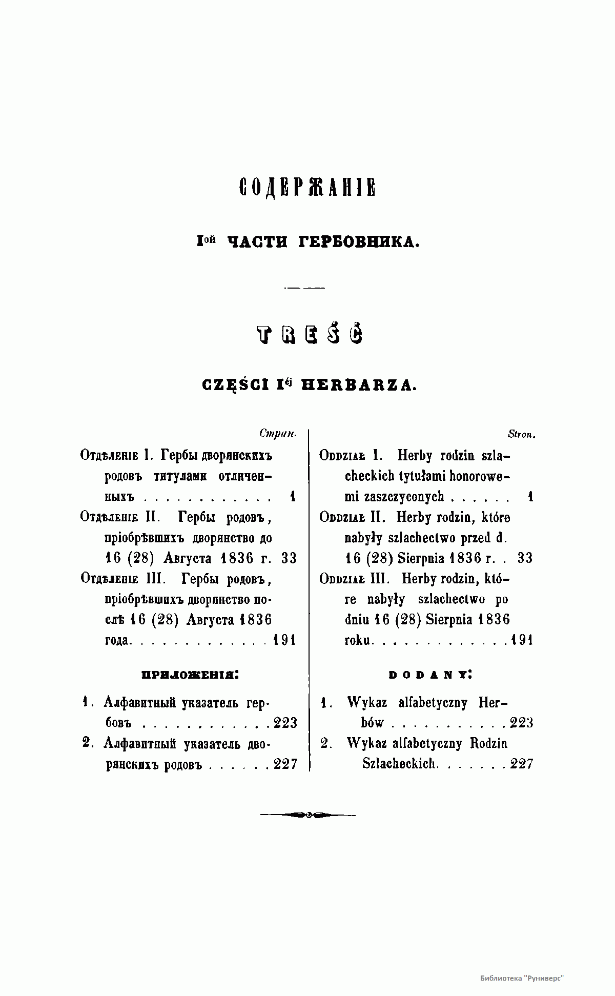 Положением о дворянстве в Царстве Польском, высочайше утвержденном 25 июня 1836 г., а также в соответствии с 65-й статьей этого Положения, составление Гербовника польского дворянства было возложено на Герольдию. В результате кропотливой и длительной работы к 1850 году было разработано и описано 135 гербов, относящихся к 389 польским фамилиям. Все польское дворянство было распределено на три части: титулованные дворянские семьи, фамилии, получившие дворянство до 1836 года и, наконец, причисленные к благородному сословию семьи после 1836 года. Среди польской знати особо выделены два княжеских и свыше ста графских родов. Издание снабжено цветными иллюстрациями гербов и их подробным описанием. Текст описаний опубликован одновременно на русском и польском языках.
