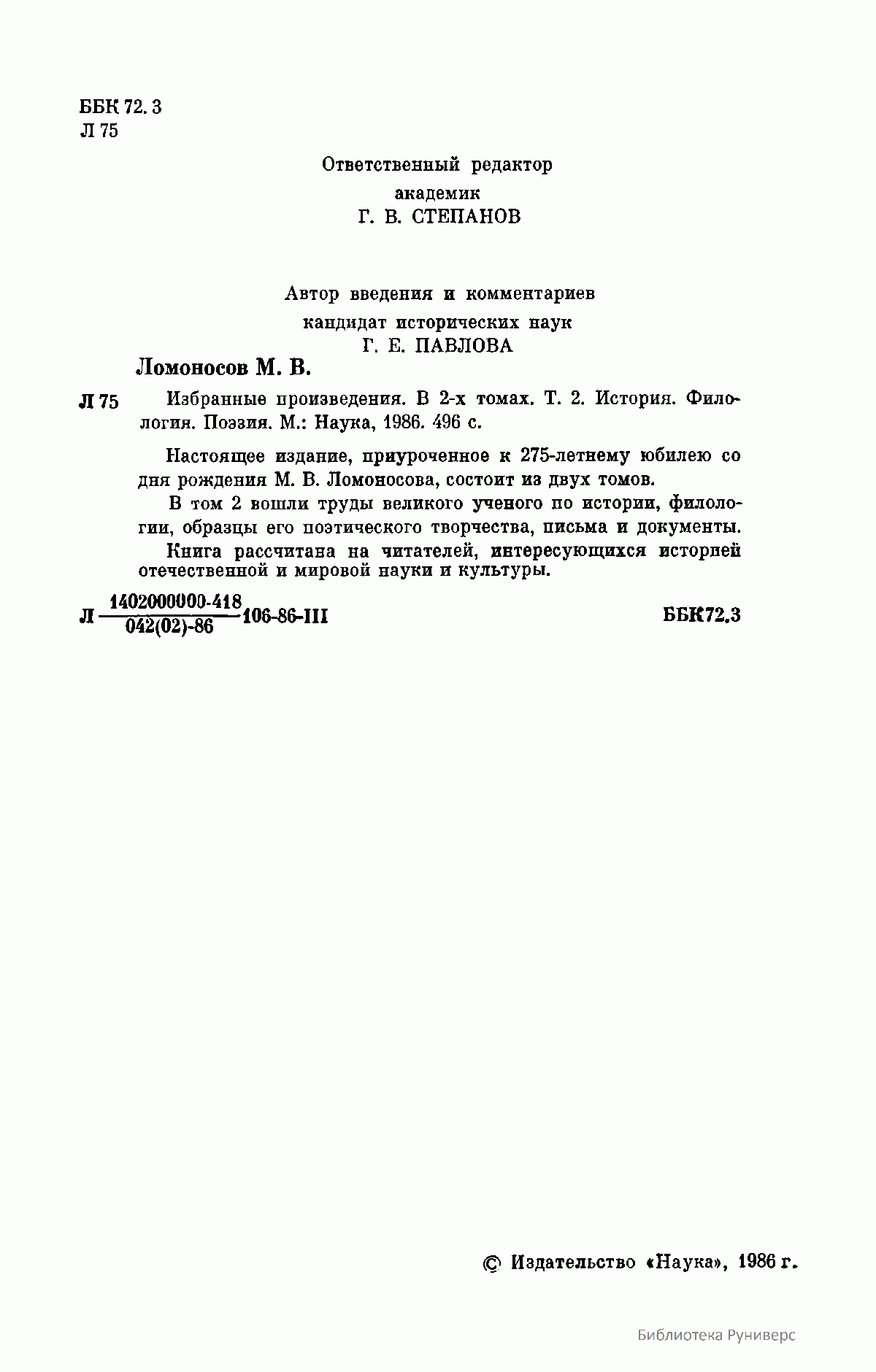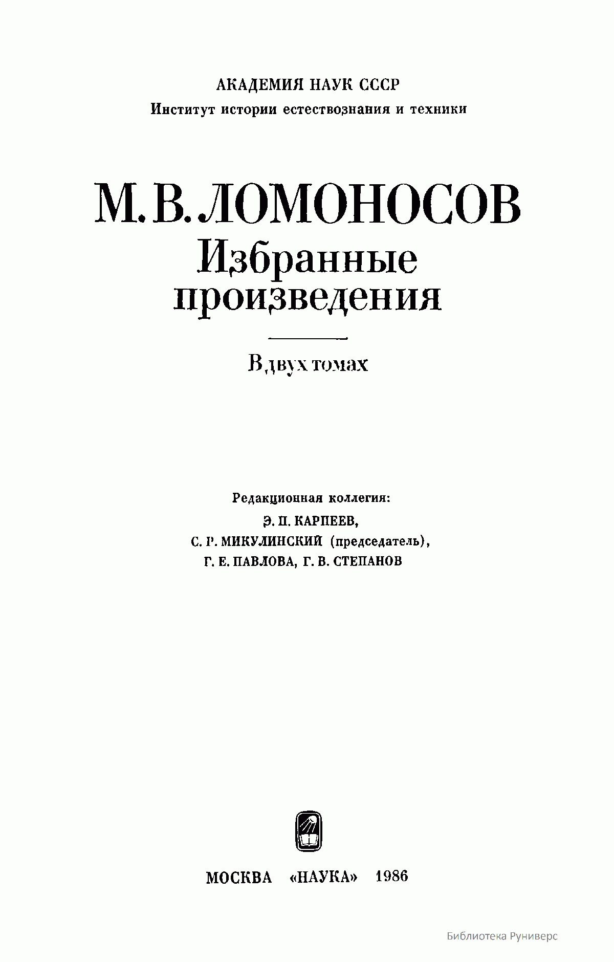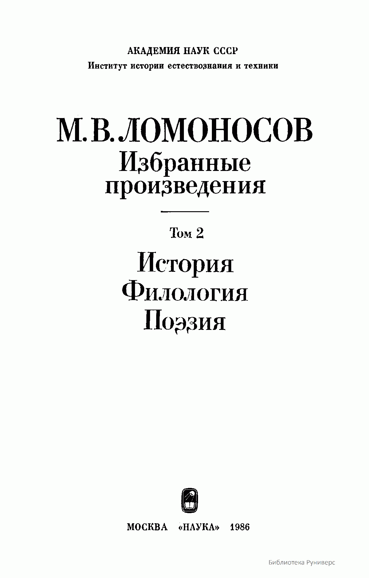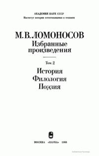 Данное двухтомное собрание избранных произведений великого российского ученого и просветителя М.В. Ломоносова, включающего его основные труды в области естественных наук и философии, а также истории, филологии и поэзии, было приурочено к 275-летию со дня его рождения. Как указывается в предисловии, авторы-составители подготовили к выпуску в свет данное издание таким образом, чтобы наиболее полно и рельефно дать читателю представление об органичном единстве взглядов великого ученого-патриота в кажущихся совершенно различными областях знаний. Именно благодаря энциклопедическим воззрениям Ломоносова и его подлинно национальном мировоззрении в развитии научного творчества, открытия великого ученого-реформатора порой выглядят гениально просто и одновременно взаимосвязано. Взгляды Ломоносова на развитие научных знаний, воспитании всесторонне образованных ученых, обладающих необычайной широтой познаний не только в сфере науки, но и литературы, поэзии и искусства, при этом беззаветно преданных России, и поныне являются актуальными и весьма значимыми для отечественной науки.