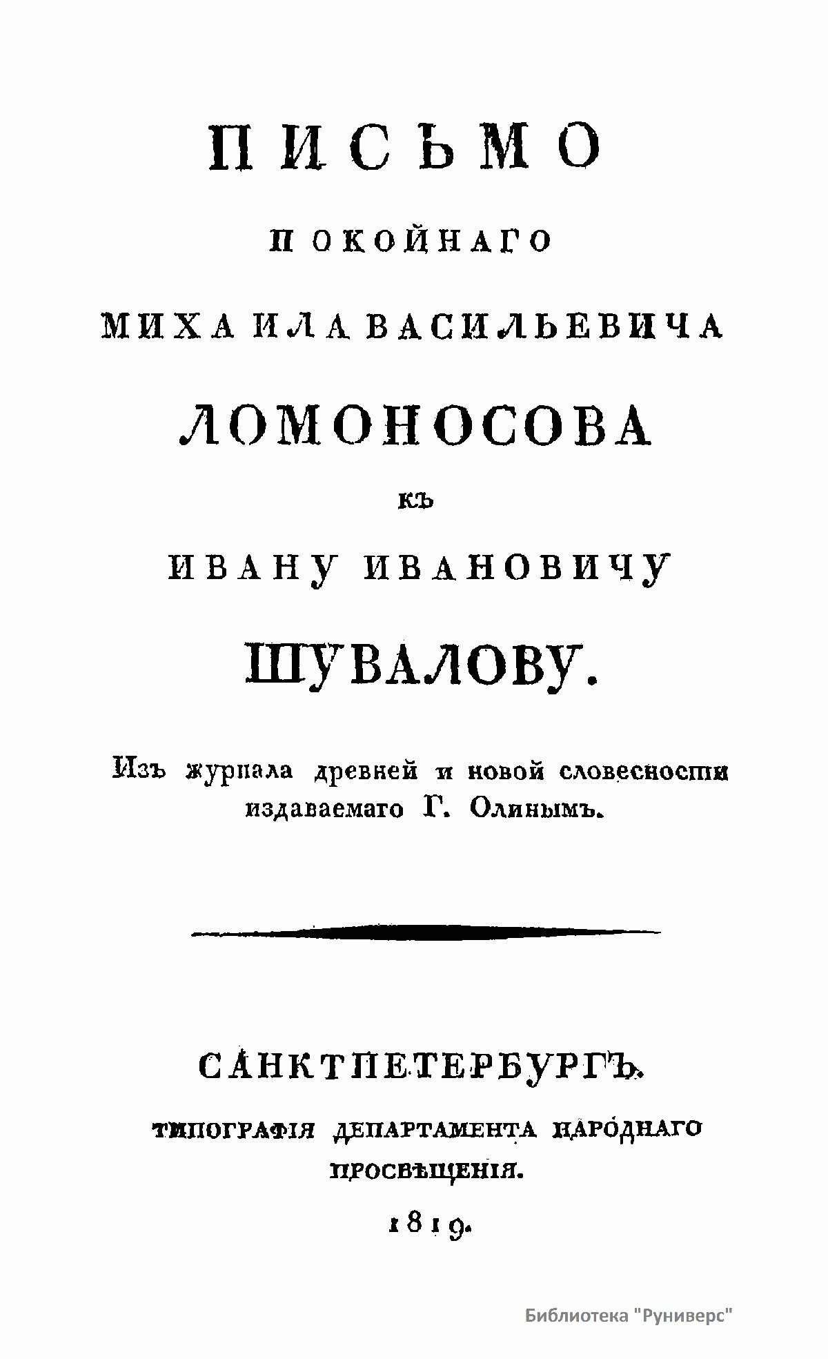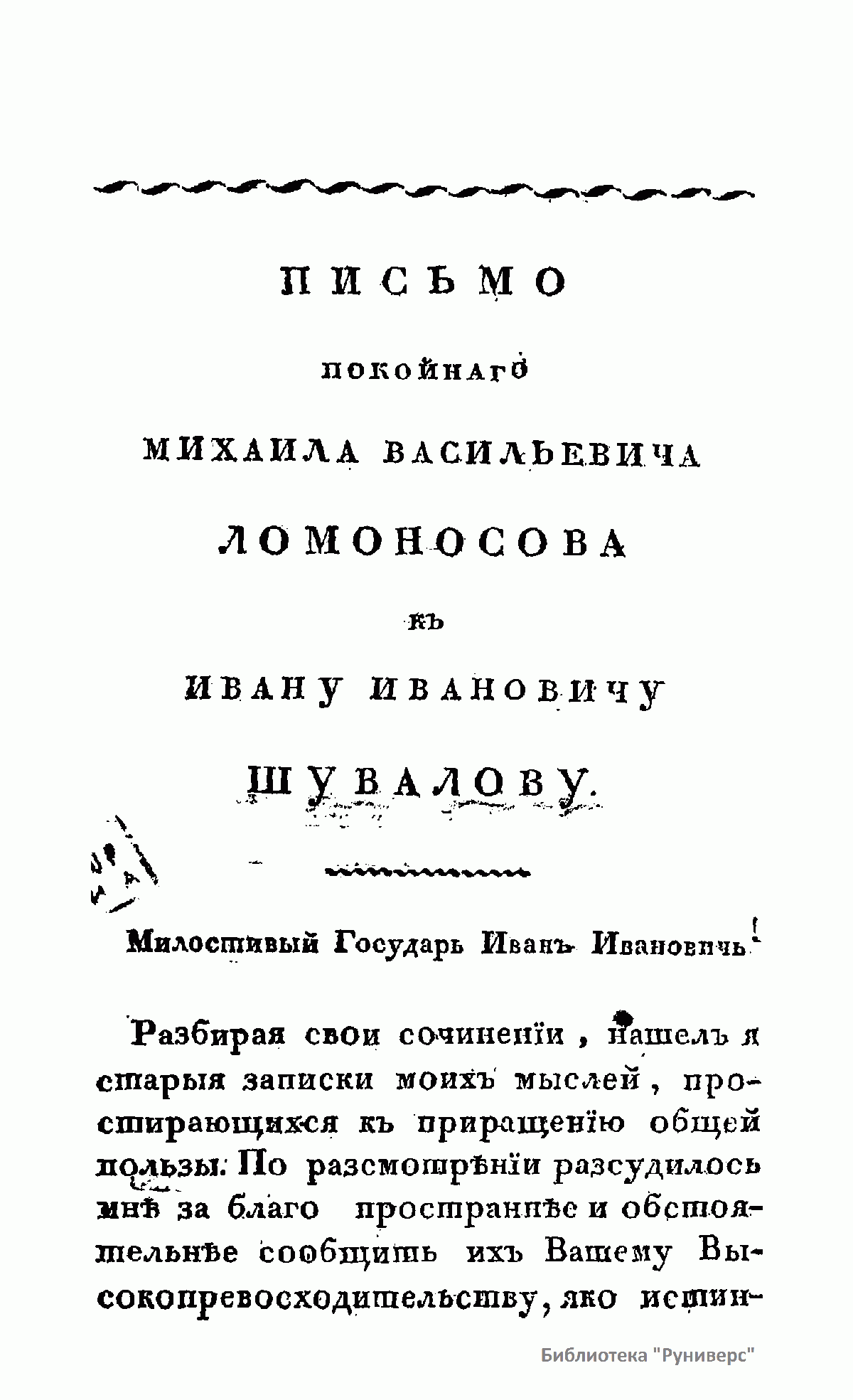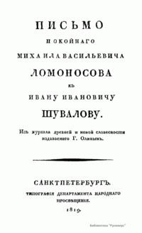 Письмо покойнаго Михаила Васильевича Ломоносова къ Ивану Ивановичу Шувалову