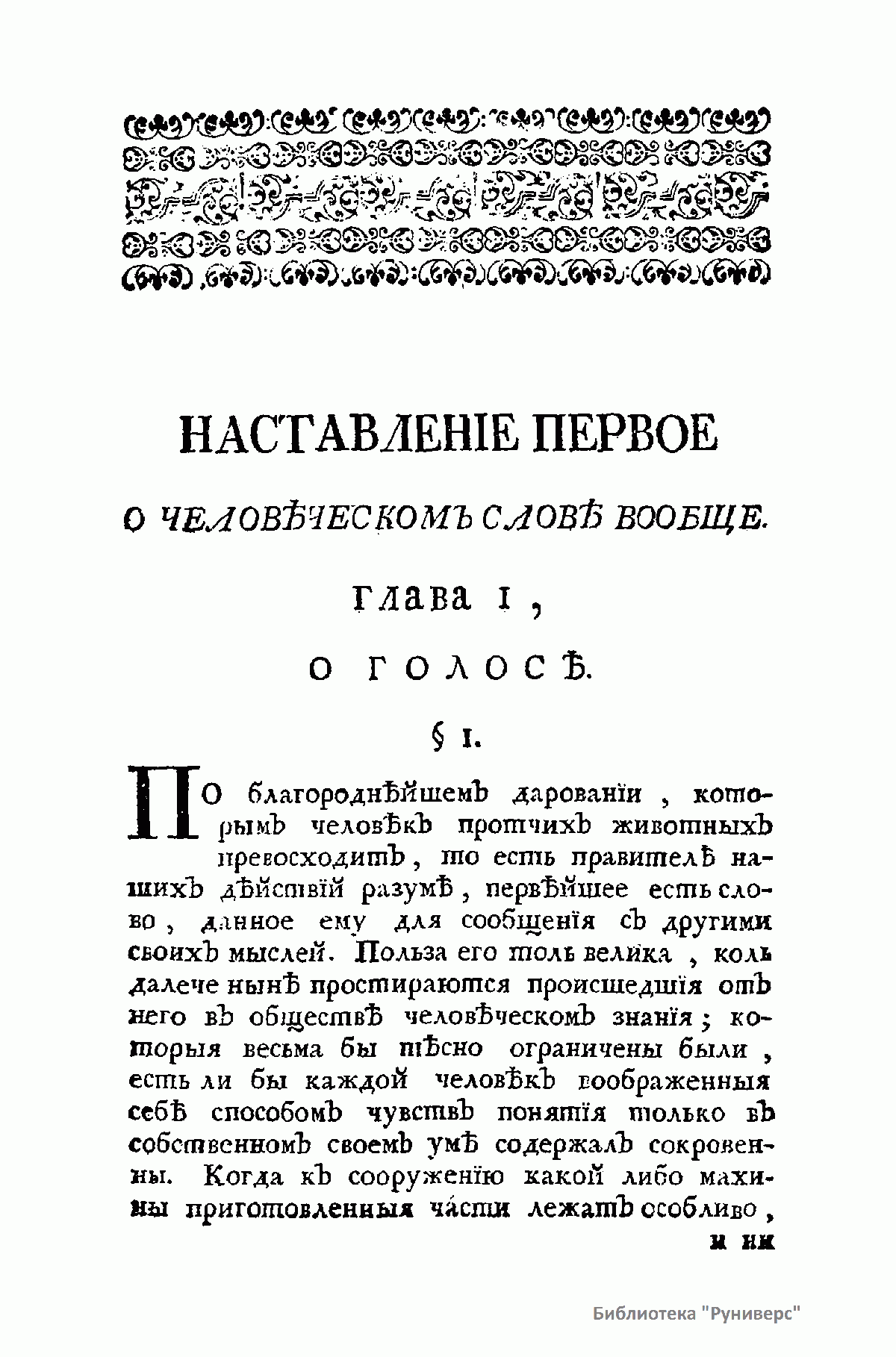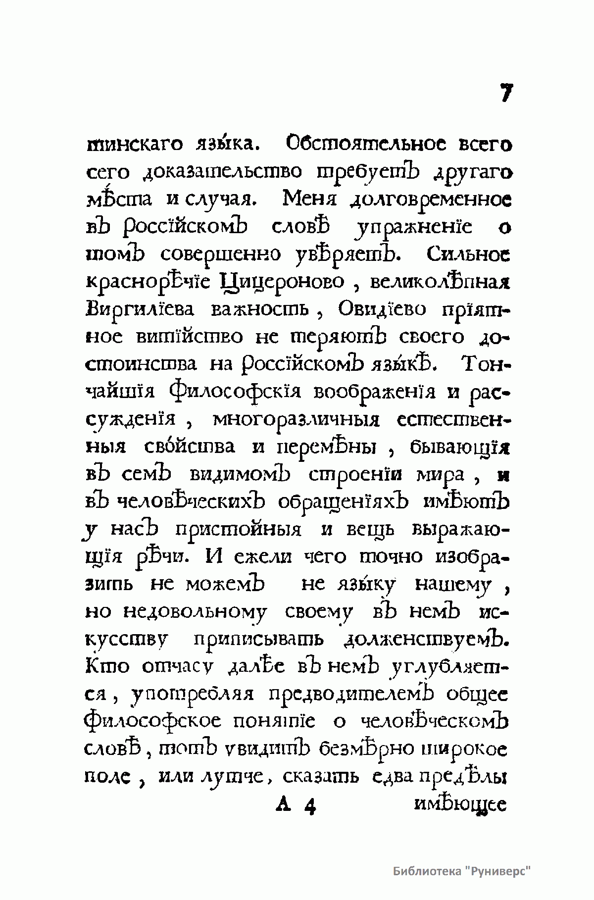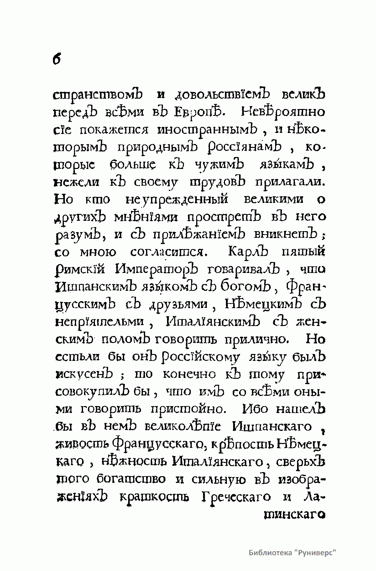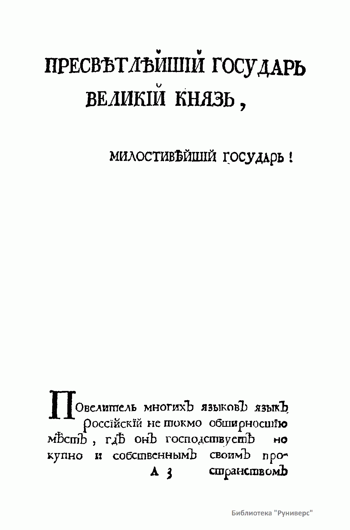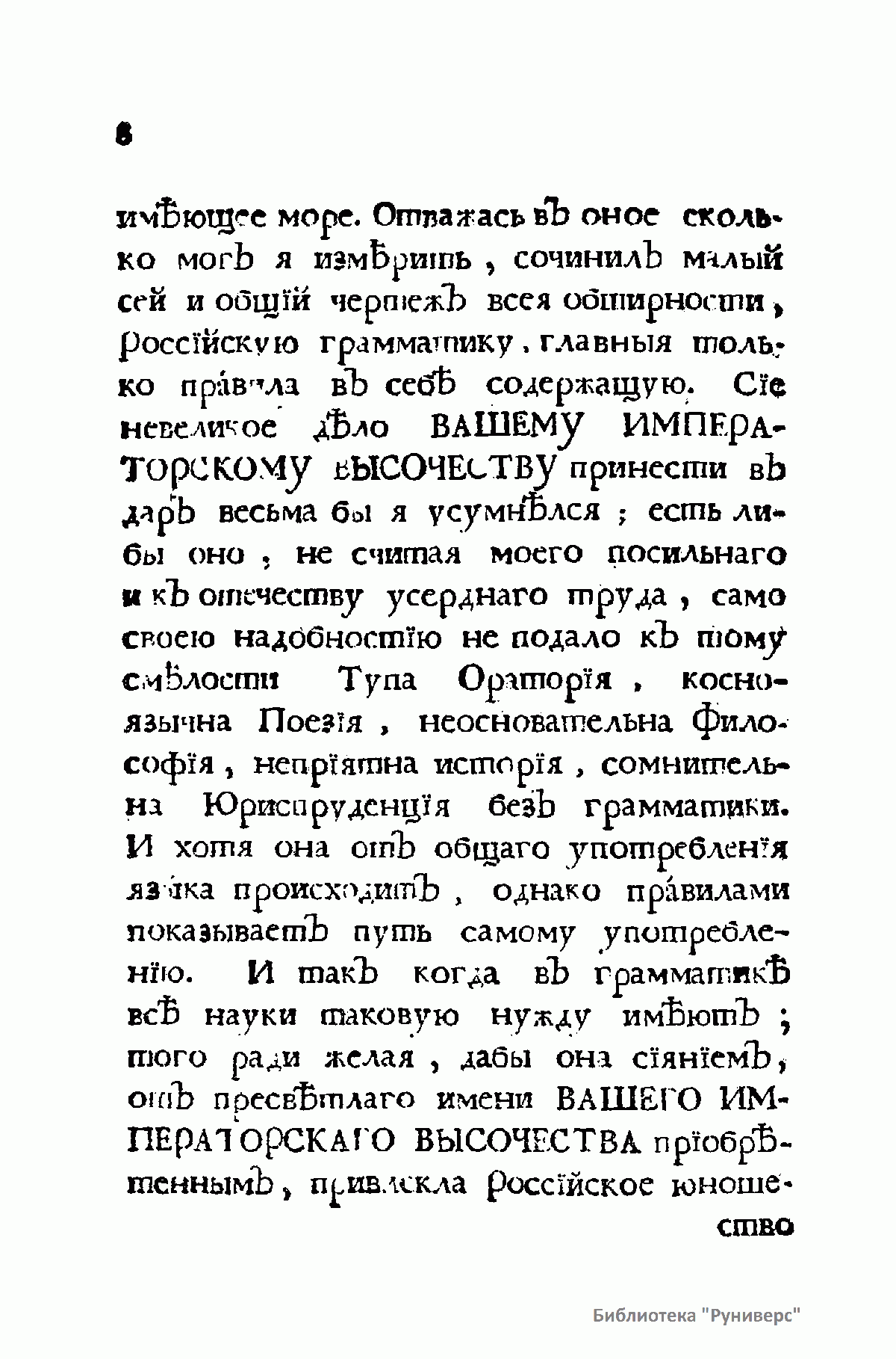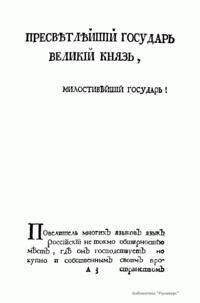 Русская литература и язык XVIII века развивались под влиянием изменений, которые внесли в общественно-политическую и культурную жизнь Империи реформы Петра Великого. У истоков преобразования русского языка и художественной литературы этой эпохи высится исполинская фигура М.В. Ломоносова. Ему принадлежит учение о трех стилях, суть которого заключается в том, что устаревшая система церковно-книжной речи тормозила развитие как литературы, так и общества в целом. Поэтому представленная «Российская грамматика» М. В. Ломоносова является одним из главных сочинений ученого. Фактически Ломоносов явился создателем первой научной русской грамматики, заложившей основы отечественной филологии. При исследовании русского языка ученый-реформатор впервые применил строгие научные приемы и четко систематизировал материал своего учебника. Содержание книги делится на шесть наставлений: о человеческом слове вообще, о чтении и правописании российском, о родах имен и склонениях, о спряжении глаголов, о служебных частях речи, и, наконец, о сочинении частей слова. Первое упоминание о начале работы над «Российской грамматикой» относится к 1749 году. Основная работа приходится на 1754 год, а 20 сентября 1755 г. в первую годовщину рождения сына Петра Федоровича и Екатерины Алексеевны (будущей Екатерины Великой) рукопись «Грамматики» была торжественно поднесена Ломоносовым младенцу великому князю Павлу Петровичу. Это выдающееся произведение российской филологии было отпечатано в январе 1757 г. в Петербурге и затем выдержало подряд пять изданий. В своем авторском предисловии «всенижайший раб Михайло Ломоносов», обращаясь к будущему наследнику престола, которого императрица Елизавета Петровна стремилась видеть на троне, образно отмечал: «Повелитель многих языков язык российский не токмо обширностию мест, где он господствует, но купно и собственным своим пространством и довольствием велик перед всеми в Европе. Карл Пятый, римский император, говаривал, что ишпанским языком с Богом, французским с друзьями, немецким с неприятельми, италиянским с женским полом говорить прилично. Но если бы он российскому языку был искусен; то, конечно, к тому присовокупил бы, что им со всеми оными говорить пристойно ибо нашел бы в нем великолепие ишпанского, живость французского, крепость немецкого, нежность италиянского, сверх того богатство и сильную в изображениях краткость греческого и латинского языка». Ломоносов как подлинный сын эпохи Просвещения, ориентировался на древних авторов и на французские грамматические руководства. Основой же послужила «Грамматика» Мелентия Смотрицкого, откуда был заимствован ряд определений. Однако для того времени в труде Ломоносова было много оригинального. Эта книга впервые проводит резкую грань между языками русским и церковно-славянским, между речью разговорной и «славенщизной». Признавая близкую взаимосвязь обоих языков, Ломоносов устанавливает полную самостоятельность каждого из них и впервые подвергает специальному строго научному изучению законы и формы языка собственно русского. Впервые определенно и точно наметив отношения русского литературного языка к языку церковно-славянскому, с одной стороны, и к языку живой, устной речи, с другой, он положил прочное начало преобразованию русского литературного языка, кот