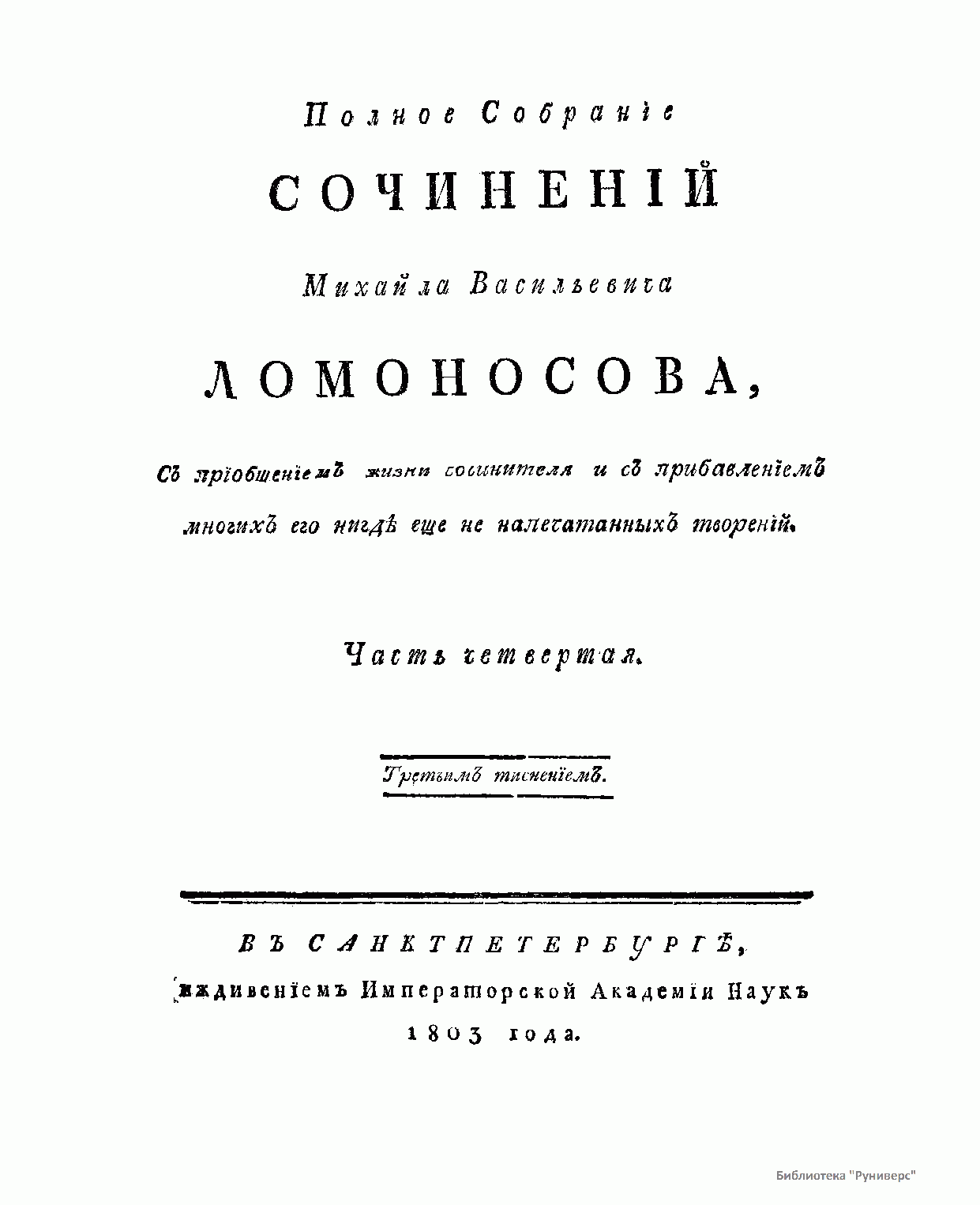 Полное Собранiе сочиненiй Михайла Васильевича Ломоносова, Съ прiобщенiемъ жизни сочинителя и съ прибавленiемъ многихъ его нигдѣ еще не напечатанныхъ творенiй. Часть четвертая