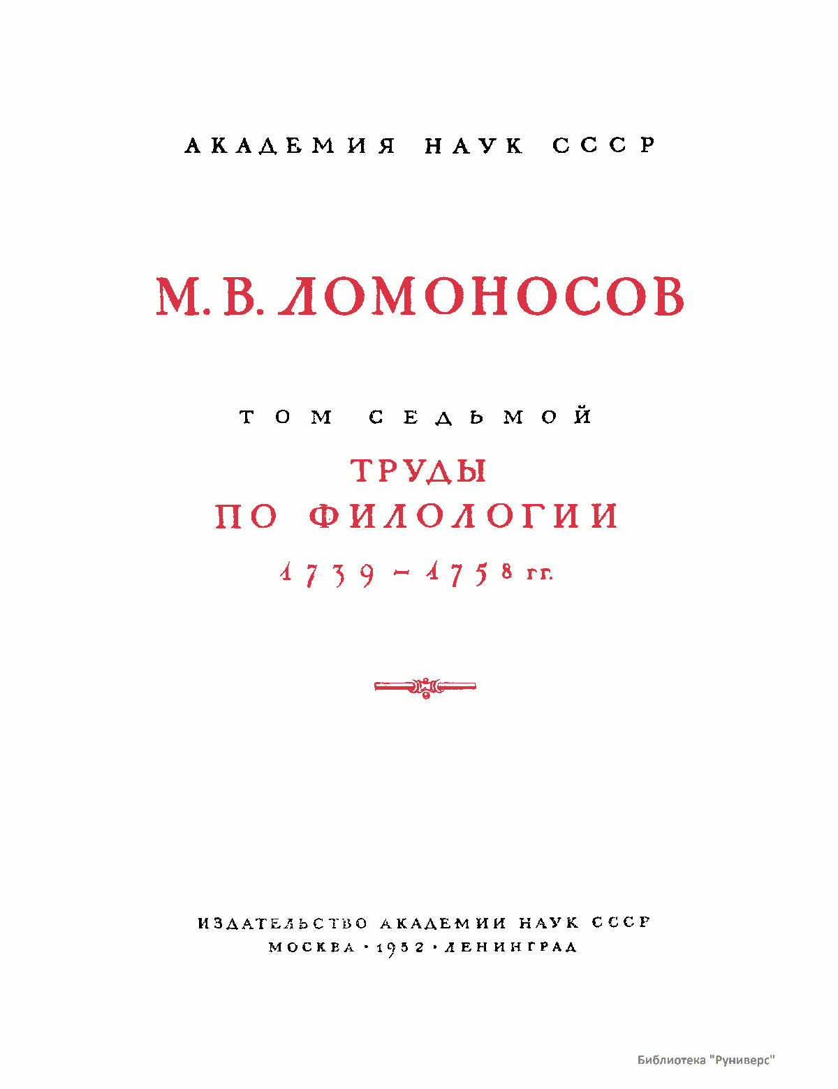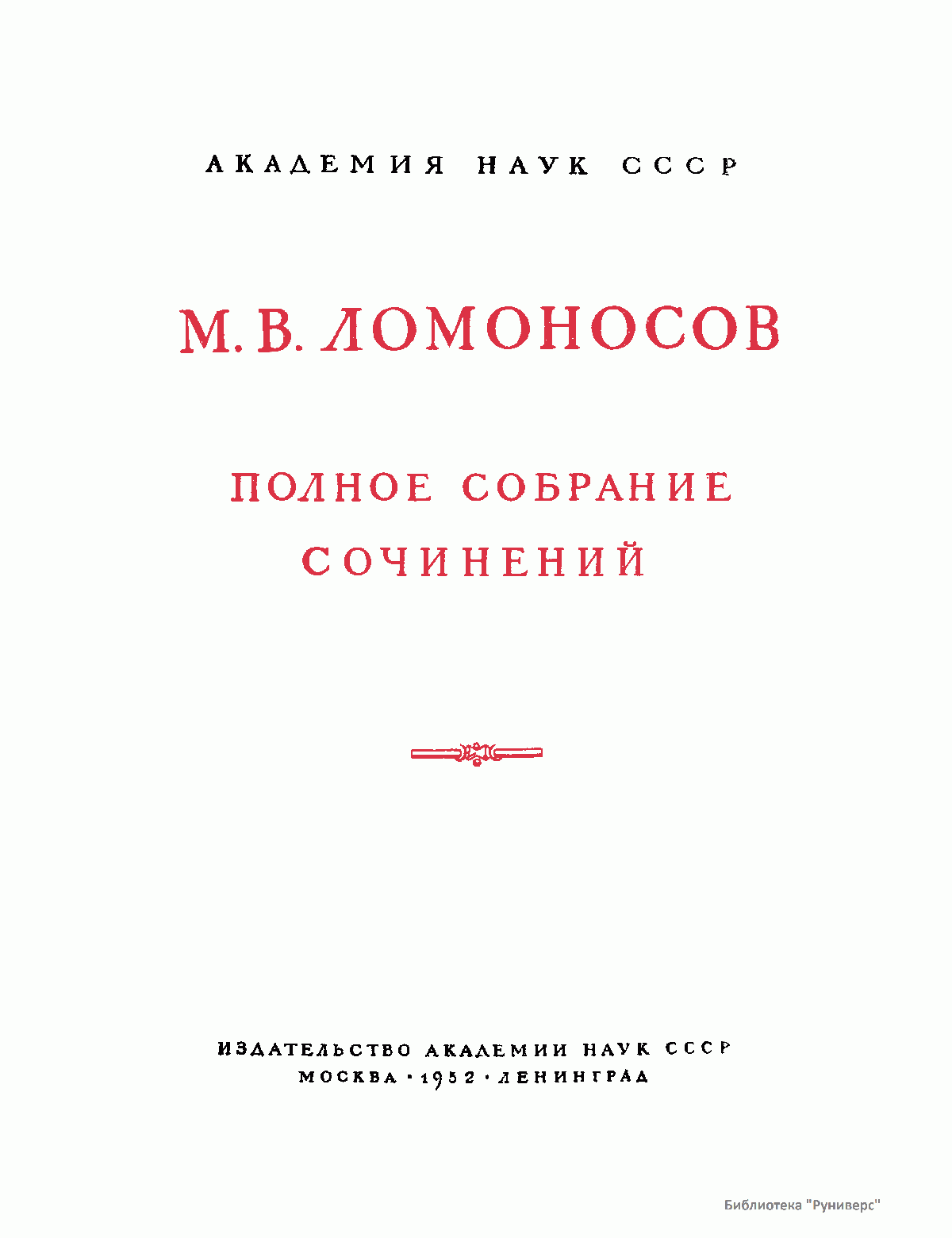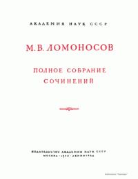Михаил Васильевич Ломоносов – человек необъятных дарований и научной энергии, величайшей деятель культуры XVIII века, лучший продолжатель идей петровского времени. Ломоносов работал в области всех известных в его время наук и почти в каждой сделал замечательные открытия. Он был философом, физиком, химиком, металлургом, географом, биологом, астрономом, филологом одновременно. В этом отношении Ломоносов был последним представителем фаланги великих людей, выдвинутых во всей Европе эпохой Возрождения, людей типа Леонардо да Винчи или Галилея. Белинский так писал о Ломоносове: «Ослепительно и прекрасно было это явление. Оно доказало собой, что человек есть человек во всяком состоянии и во всяком климате, что гений умеет торжествовать над всеми препятствиями, какие ни противопоставит ему враждебная судьба, что, наконец, русский способен ко всему великому и прекрасному». Настоящее издание сочинений Ломоносова наиболее полное из всех. Оно подготовлено на основе большой работы ученых по разысканию, описанию и изучению разнообразного и богатейшего научного наследия Ломоносова. В издание включается несколько сот документов, не вошедших в последнее академическое издание и ранее не опубликованных. В число этих документов входит ряд статей и заметок научного значения, автобиографически документы, переводы и разнообразные служебные бумаги, характеризующие Ломоносова как выдающегося организатора русской науки и просвещения XVIII века. Особо следует отметить документы, относящиеся к деятельности Ломоносова как ученого-экспериментатора. Все публикуемые тексты сверены с первоисточниками – рукописями и прижизненными изданиями. В отдельных случаях, когда ни рукописей, ни прижизненных изданий не сохранилось, текст печатается по наиболее достоверному, критически изученному источнику. Произведения печатаются по новой орфографии с заменой пунктуации Ломоносова современной пунктуацией, но с сохранением, по возможности, всех особенностей, присущих языку Ломоносова. Все тексты, написанные на латинском языке, печатаются одновременно на языке оригинала и в русском переводе. Произведения Ломоносова распределены по разделам его деятельности. Каждому разделу посвящен один том или несколько томов, в зависимости от объема материала. В пределах каждого тома произведения расположены хронологически по времени их написания или публикации. Некоторые отступления от этого принципа сделаны лишь в отдельных случаях, когда это вызывалось необходимостью сохранить органическую связь между однородными произведениями. В отличие от старых изданий сочинений Ломоносова, в которых при распределении материала сначала печатались художественные произведения и филологические труды, в настоящем издании первые тома посвящены научным трудам по физике, химии и другим естественным наукам. В конце каждого тома даются краткие примечания справочного характера к опубликованным в томе работам и указатель личных имен. Настоящее полное собрание сочинений Ломоносова осуществляется Главной редакцией издания при непосредственном участии Комиссии по истории Академии Наук СССР, архива Академии Наук СССР и приглашенных специалистов.