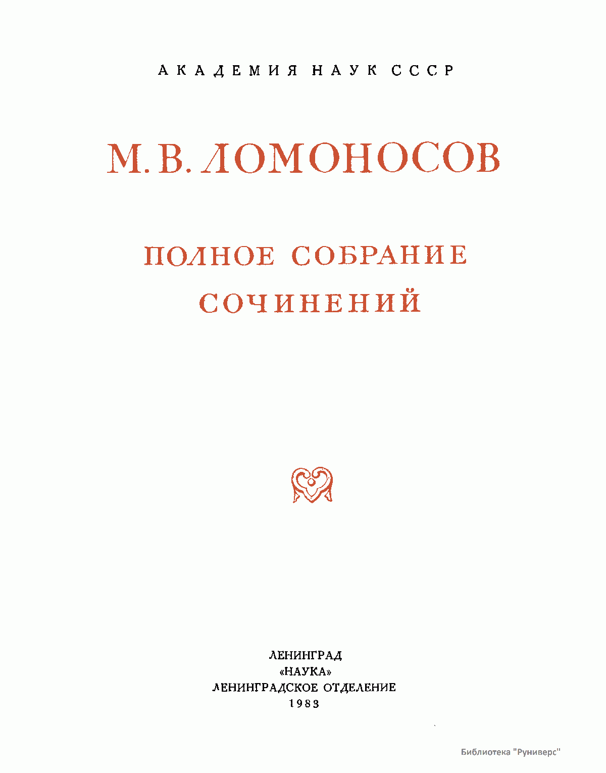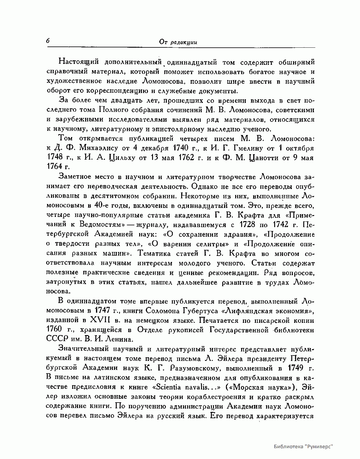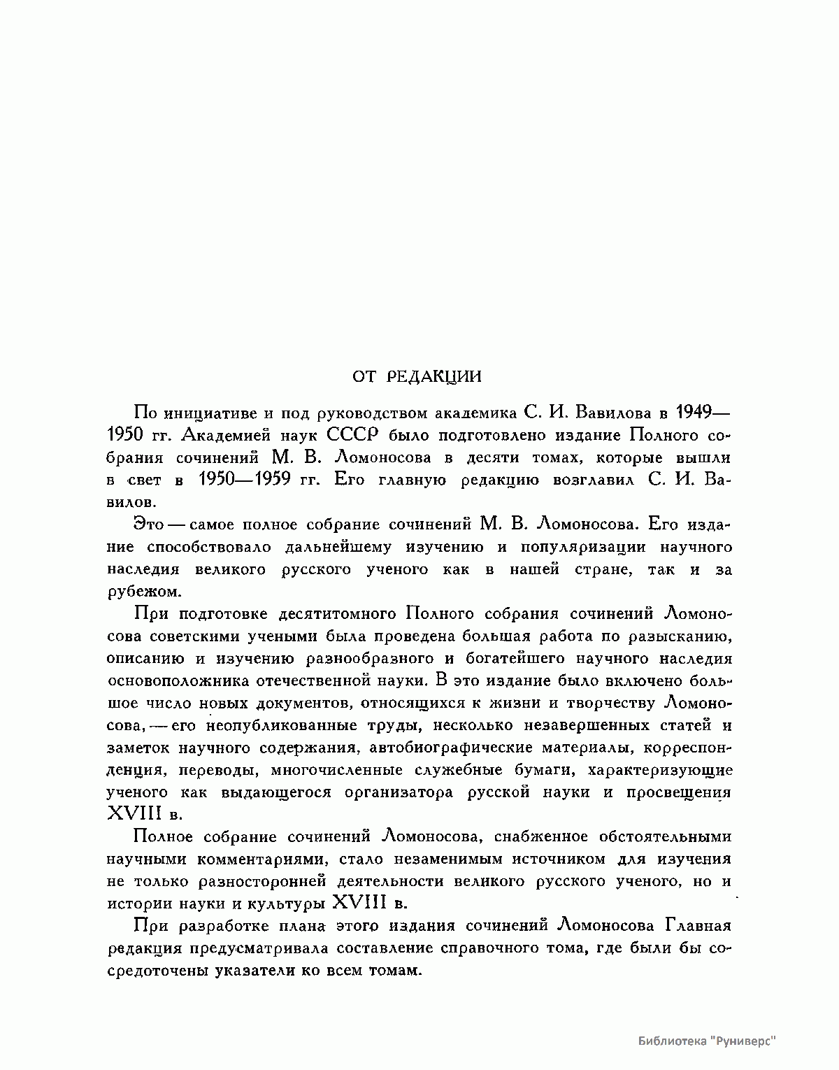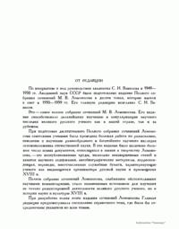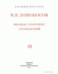 Михаил Васильевич Ломоносов – человек необъятных дарований и научной энергии, величайшей деятель культуры XVIII века, лучший продолжатель идей петровского времени. Ломоносов работал в области всех известных в его время наук и почти в каждой сделал замечательные открытия. Он был философом, физиком, химиком, металлургом, географом, биологом, астрономом, филологом одновременно. В этом отношении Ломоносов был последним представителем фаланги великих людей, выдвинутых во всей Европе эпохой Возрождения, людей типа Леонардо да Винчи или Галилея. Белинский так писал о Ломоносове: «Ослепительно и прекрасно было это явление. Оно доказало собой, что человек есть человек во всяком состоянии и во всяком климате, что гений умеет торжествовать над всеми препятствиями, какие ни противопоставит ему враждебная судьба, что, наконец, русский способен ко всему великому и прекрасному». Настоящее издание сочинений Ломоносова наиболее полное из всех. Оно подготовлено на основе большой работы ученых по разысканию, описанию и изучению разнообразного и богатейшего научного наследия Ломоносова. В издание включается несколько сот документов, не вошедших в последнее академическое издание и ранее не опубликованных. В число этих документов входит ряд статей и заметок научного значения, автобиографически документы, переводы и разнообразные служебные бумаги, характеризующие Ломоносова как выдающегося организатора русской науки и просвещения XVIII века. Особо следует отметить документы, относящиеся к деятельности Ломоносова как ученого-экспериментатора. Все публикуемые тексты сверены с первоисточниками – рукописями и прижизненными изданиями. В отдельных случаях, когда ни рукописей, ни прижизненных изданий не сохранилось, текст печатается по наиболее достоверному, критически изученному источнику. Произведения печатаются по новой орфографии с заменой пунктуации Ломоносова современной пунктуацией, но с сохранением, по возможности, всех особенностей, присущих языку Ломоносова. Все тексты, написанные на латинском языке, печатаются одновременно на языке оригинала и в русском переводе. Произведения Ломоносова распределены по разделам его деятельности. Каждому разделу посвящен один том или несколько томов, в зависимости от объема материала. В пределах каждого тома произведения расположены хронологически по времени их написания или публикации. Некоторые отступления от этого принципа сделаны лишь в отдельных случаях, когда это вызывалось необходимостью сохранить органическую связь между однородными произведениями. В отличие от старых изданий сочинений Ломоносова, в которых при распределении материала сначала печатались художественные произведения и филологические труды, в настоящем издании первые тома посвящены научным трудам по физике, химии и другим естественным наукам. В конце каждого тома даются краткие примечания справочного характера к опубликованным в томе работам и указатель личных имен. Настоящее полное собрание сочинений Ломоносова осуществляется Главной редакцией издания при непосредственном участии Комиссии по истории Академии Наук СССР, архива Академии Наук СССР и приглашенных специалистов.