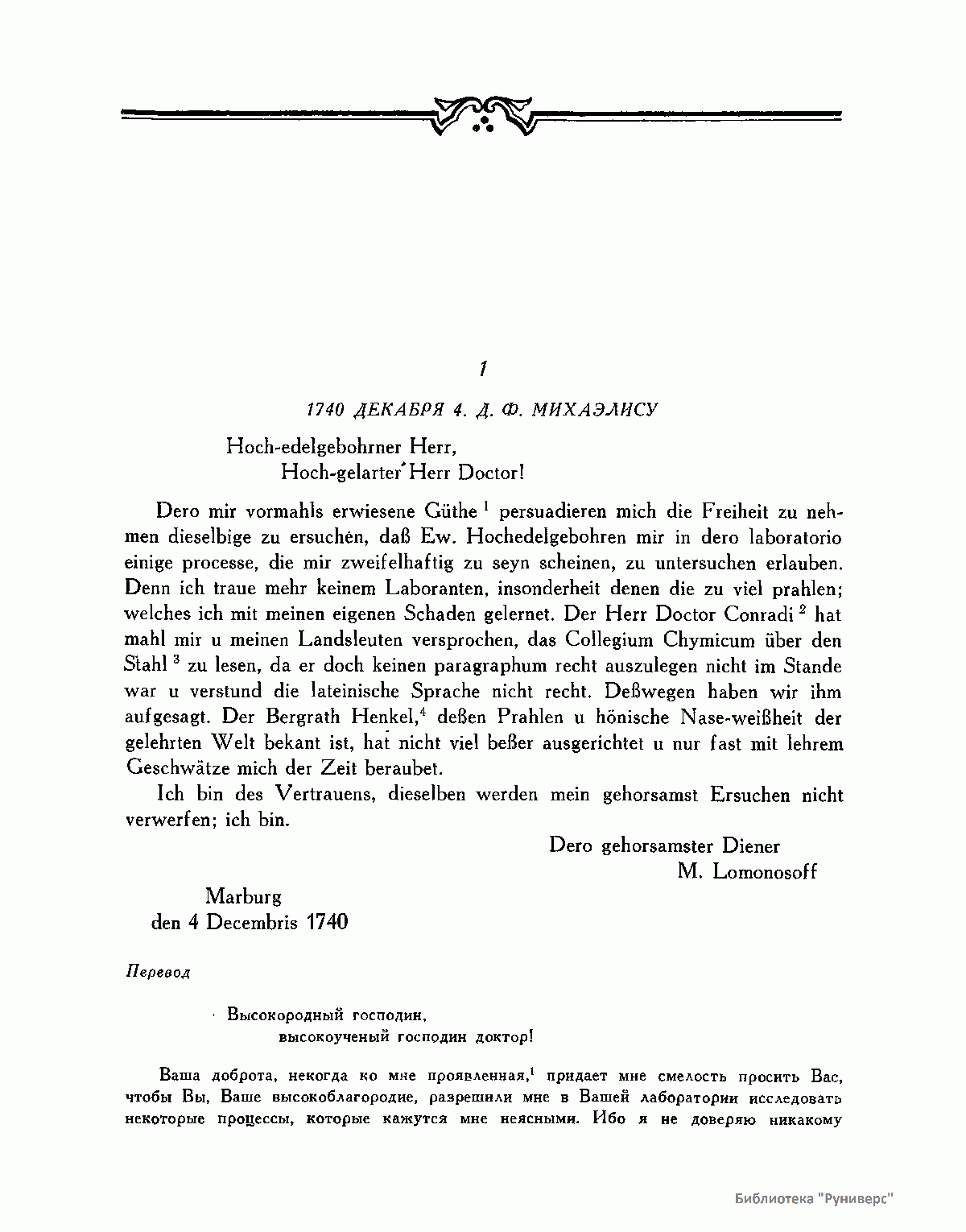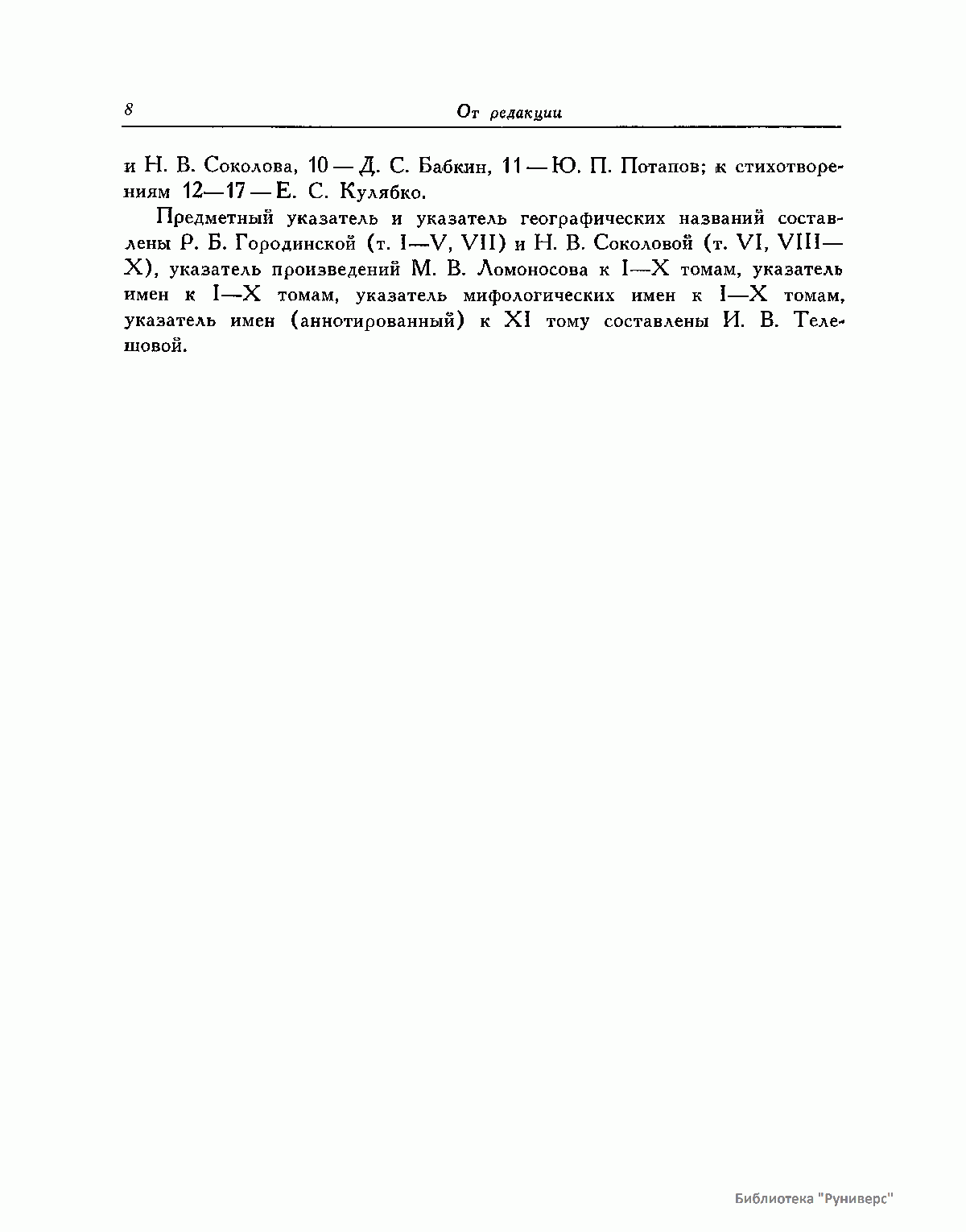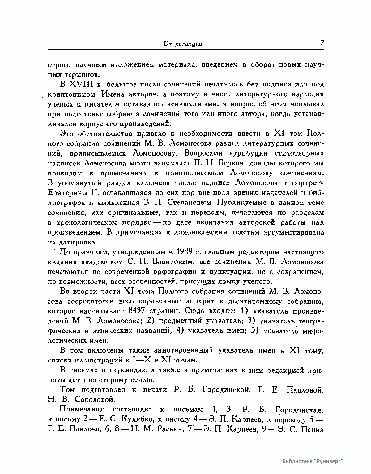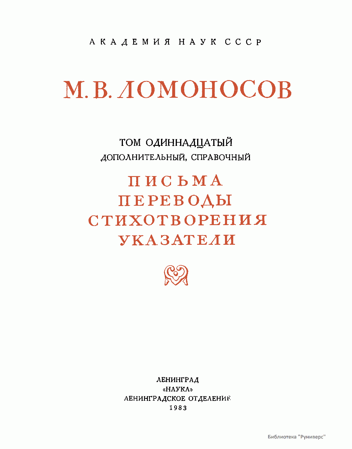Михаил Васильевич Ломоносов – человек необъятных дарований и научной энергии, величайшей деятель культуры XVIII века, лучший продолжатель идей петровского времени. Ломоносов работал в области всех известных в его время наук и почти в каждой сделал замечательные открытия. Он был философом, физиком, химиком, металлургом, географом, биологом, астрономом, филологом одновременно. В этом отношении Ломоносов был последним представителем фаланги великих людей, выдвинутых во всей Европе эпохой Возрождения, людей типа Леонардо да Винчи или Галилея. Белинский так писал о Ломоносове: «Ослепительно и прекрасно было это явление. Оно доказало собой, что человек есть человек во всяком состоянии и во всяком климате, что гений умеет торжествовать над всеми препятствиями, какие ни противопоставит ему враждебная судьба, что, наконец, русский способен ко всему великому и прекрасному». Настоящее издание сочинений Ломоносова наиболее полное из всех. Оно подготовлено на основе большой работы ученых по разысканию, описанию и изучению разнообразного и богатейшего научного наследия Ломоносова. В издание включается несколько сот документов, не вошедших в последнее академическое издание и ранее не опубликованных. В число этих документов входит ряд статей и заметок научного значения, автобиографически документы, переводы и разнообразные служебные бумаги, характеризующие Ломоносова как выдающегося организатора русской науки и просвещения XVIII века. Особо следует отметить документы, относящиеся к деятельности Ломоносова как ученого-экспериментатора. Все публикуемые тексты сверены с первоисточниками – рукописями и прижизненными изданиями. В отдельных случаях, когда ни рукописей, ни прижизненных изданий не сохранилось, текст печатается по наиболее достоверному, критически изученному источнику. Произведения печатаются по новой орфографии с заменой пунктуации Ломоносова современной пунктуацией, но с сохранением, по возможности, всех особенностей, присущих языку Ломоносова. Все тексты, написанные на латинском языке, печатаются одновременно на языке оригинала и в русском переводе. Произведения Ломоносова распределены по разделам его деятельности. Каждому разделу посвящен один том или несколько томов, в зависимости от объема материала. В пределах каждого тома произведения расположены хронологически по времени их написания или публикации. Некоторые отступления от этого принципа сделаны лишь в отдельных случаях, когда это вызывалось необходимостью сохранить органическую связь между однородными произведениями. В отличие от старых изданий сочинений Ломоносова, в которых при распределении материала сначала печатались художественные произведения и филологические труды, в настоящем издании первые тома посвящены научным трудам по физике, химии и другим естественным наукам. В конце каждого тома даются краткие примечания справочного характера к опубликованным в томе работам и указатель личных имен. Настоящее полное собрание сочинений Ломоносова осуществляется Главной редакцией издания при непосредственном участии Комиссии по истории Академии Наук СССР, архива Академии Наук СССР и приглашенных специалистов.