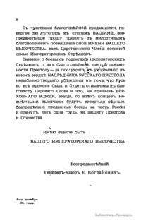 Исторический очерк, представляющий краткое популярное описание основных этапов создания и развития Лейб-гвардии стрелкового императорской фамилии полка и батальона принадлежит перу видного общественного деятеля последних трех царствований генералу Евгению Васильевичу Богдановичу, который долгие годы, вплоть до своей кончины, состоял почетным членом в этой элитной части. Инициатором создания этой уникальной по статусу воинской части, которая должна была стать образцом для всей российской армии, выступил сам император Николай I. Незадолго до своей смерти, 25 октября 1854 года, в начале Крымской войны, он повелел сформировать на время военных действий из числа крестьян призывных возрастов императорских уделов Стрелковый полк Императорской Фамилии. Менее чем через год полк был сформирован, затем был причислен к гвардейскому корпусу на правах молодой гвардии, а 1 октября 1856 года на мирное время он был уже расформирован. Офицеры и нижние чины поступили на формирование лейб-гвардии стрелкового Императорской Фамилии батальона, который был расквартирован в Гатчине. Само название батальона предполагало зачисление в списки батальона всех великих князей. В гатчинский период существования батальона в его списки были действительно зачислены почти все члены императорского дома. В дальнейшем в августе 1870 года батальон был отчислен в состав вновь сформированной Гвардейской стрелковой бригады под командованием великого князя Владимира Александровича, а через год был переименован в лейб-гвардии 4-й стрелковый Императорской Фамилии батальон. В период русско-турецкой войны 1877-1878 гг. личный состав батальона участвовал в боевых действиях, получив в награду георгиевское знамя «За отличие в Турецкую войну». Краткий очерк этой придворной воинской части, написанный Богдановичем в традиционном для него верноподданническом духе, освещает основные вехи её истории. В приложения к основному тексту автор приводит подробнейшие списки почетных членов батальона, а также списочный состав всех офицеров, проходивших службу в этой части.