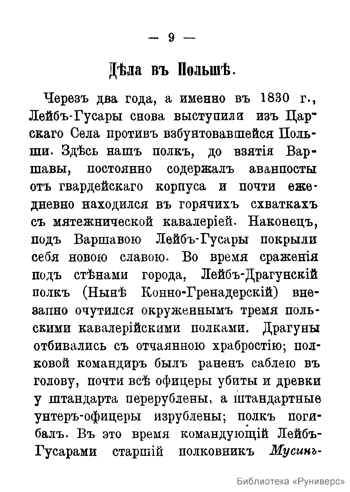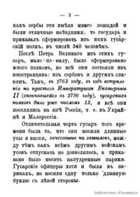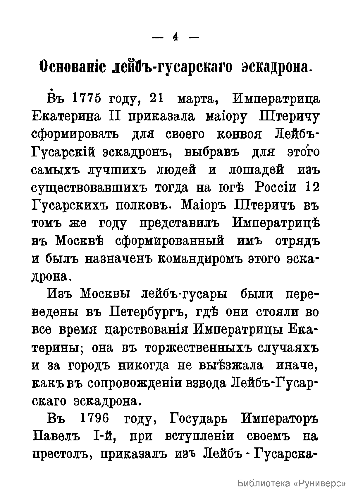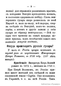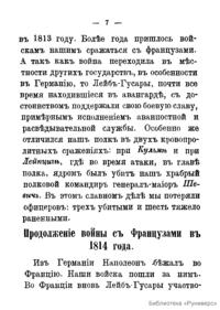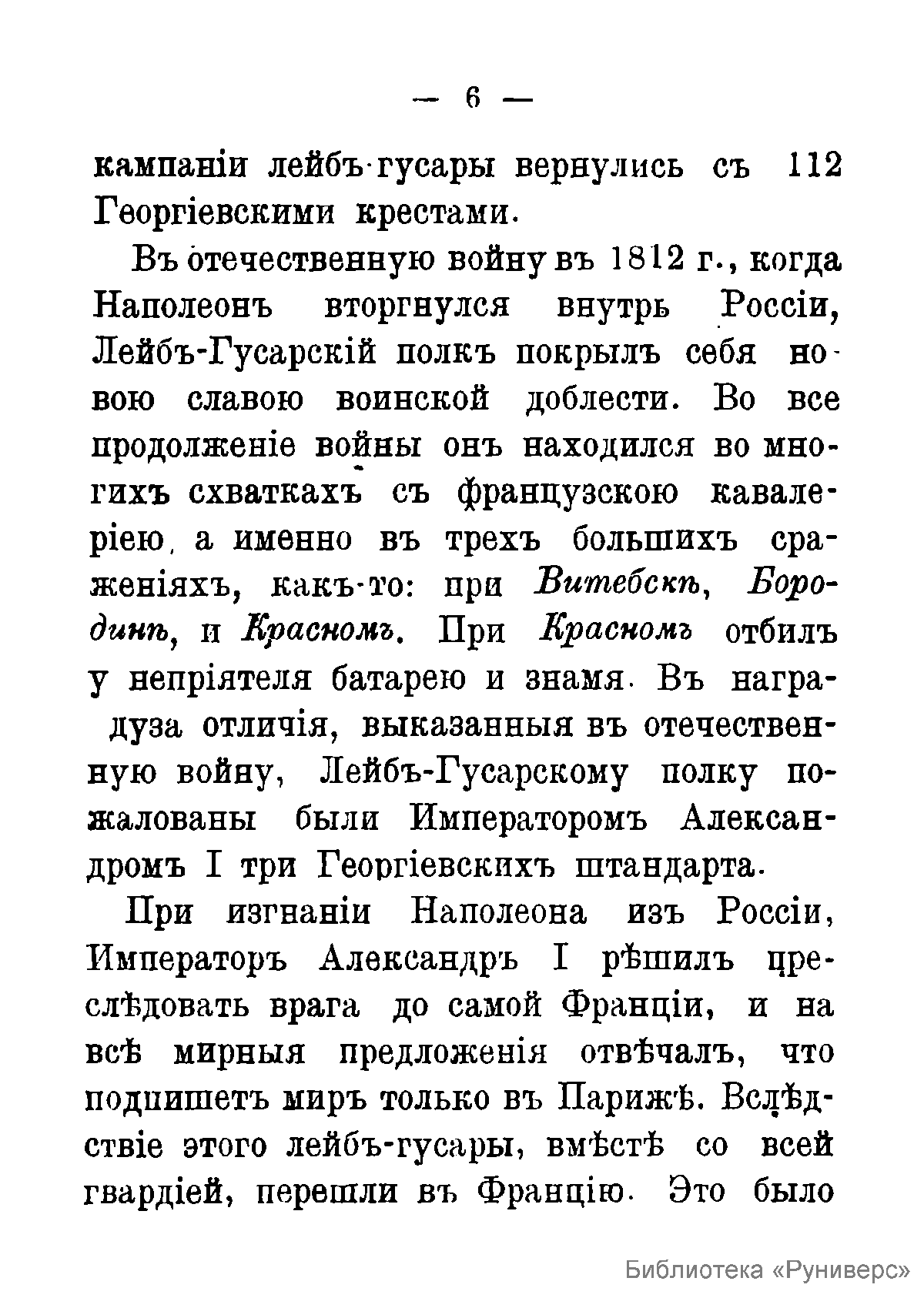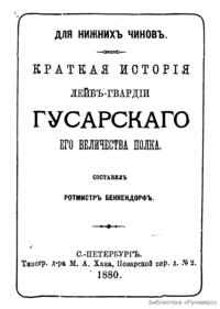 Краткое пособие по полковой истории составлено для нижних чинов одним из офицеров полка ротмистром П.К. Бенкендорфом. Само слово «гусар» венгерского происхождения. Так в XV веке в Венгрии называли вооруженных всадников, участвовавших в борьбе с завоевателями-турками. В России это слово как определение для конных частей получило распространение с XVII века. В 1772 г. императрица Екатерина II приказала князю Г.А. Потемкину сформировать для службы при дворе лейб-гусарский эскадрон и две казачьи конвойные команды. Эскадрон гусар был составлен из Чёрного, Жёлтого, Сербского и Валашского гусарских полков и пополнялся вольноопределяющимися из дворян, лучшими представителями армейских полков и иностранцами красивой наружности и высокого роста. В 1775 г. майор Штерич представил императрице в Москве сформированный им отряд и был назначен командиром этого эскадрона. В 1796 г. при Павле I из лейб-гусарского эскадрона, казачьих конвойных команд и находившихся в составе гусарского полка и казачьего эскадрона был сформирован сводный лейб-гусарский казачий полк. Тогда же гусарским эскадронам было указано именоваться лейб-гусарским полком; а казачьи эскадроны были отделены и составили особый лейб-гвардии казачий полк. Вскоре Павел Петрович перевел полк в Царское Село и Павловск, а первому эскадрону приказал именоваться эскадроном Его Величества. Таким образом, полк вел свою историю от лейб-гвардии Гусарского эскадрона (1775 год) и гатчинского гусарского полка. Все эти годы лейб-гусары несли караульную службу при императорских дворцах, а боевое крещение приняли в 1805 году при битве при Аустерлице. В отличие от армейских гусарских полков, лейб-гвардии Гусарский полк состоял не из 10, а из 5 эскадронов. Полк особо отличился при Фридланде, где против тяжелой кавалерии французов генерала Н. Латур-Мобура действовала русская легкая кавалерия. Особый героизм проявил лейб-эскадрон гусар под командованием полковника П.П. Загряжского, спасшего от разгрома отступавшую пехоту русской армии. Полк лейб-гвардии гусар потерял в этом сражении убитыми 52 нижних чина и 88 строевых лошадей. За смелость, проявленную в бою, орден Святого Георгия 4-й степени получили: полковники Тутолмин и Загряжский, ротмистры Трощинский и князь Абамелек, штабс-ротмистры князь Багратион и граф Салтыков, а всего георгиевскими крестами было удостоено 112 гусар. В начале Отечественной войны 1812 г. 4 эскадрона полка действовали на главном направлении в составе 1-й Западной армии в 1-м кавалерийском корпусе генерал-лейтенанта Ф.П. Уварова, а запасной эскадрон находился на Петербургском направлении в корпусе генерал-лейтенанта П.Х Витгенштейна. Командовал гвардейскими гусарами полковник Н. Я. Мандрыка, а после его ранения под Витебском полк возглавил полковник князь Д.С. Абомелик. В июле 1812 г. генерал-лейтенанту А.И. Остерману-Толстому было приказано идти с корпусом на Островно. В его авангарде находился и лейб-гвардии Гусарский полк, который столкнулся у Островны с двумя кавалерийскими корпусами и пехотными колоннами под общим командованием Мюрата. При Бородине Лейб-гвардии гусарский полк, согласно боевому расписанию, состоял во 2-й бригаде 1-го резервного кавалерийского корпуса генерал-лейтенанта Ф.П. Уварова. Гвардейские гусары участвовали в рейде кавалерии Ф.П. Уварова и М.И. Платова. Полк пр