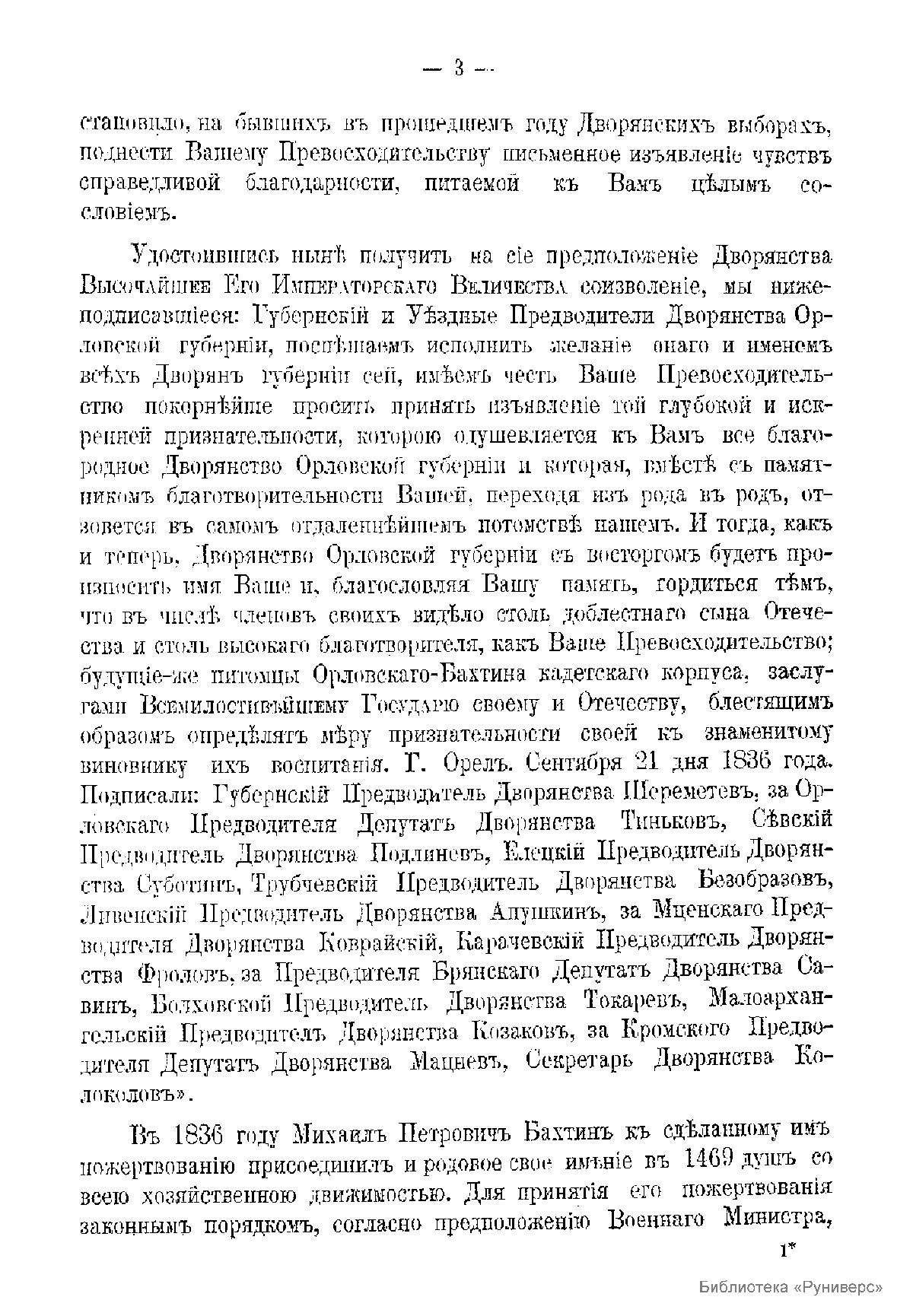 Очерк истории Орловского Бахтина кадетского корпуса был подготовлен в связи с празднованием 50-летия с момента его основания. Автором очерка является известный общественный деятель эпохи реформ Александра II, один из ближайших сотрудников военного министра графа Д.А. Милютина, генерал от артиллерии Матвей Степанович Лалаев, выходец из армянского рода, посвятивший долгие годы жизни организации военного образования в России. Перу этого известного военного ученого принадлежит также двухтомный капитальный труд по истории русских военно-учебных заведений «Исторический очерк военно-учебных заведений, подведомственных Главному их Управлению. От основания в России военных школ до исхода первого двадцатипятилетия благополучного царствования государя императора Александра Николаевича: 1700 – 1880.», изданный в Петербурге в 1880 г. Кадетские корпуса в России, помимо столичного Первого «шляхетского» кадетского корпуса были также организованы и за пределами Санкт-Петербурга, из губернских дворянских училищ, подготавливавших дворянских отпрысков к государственной службе. В 1830 г. было издано «Положение о губернских кадетских корпусах». К этому времени усилился приток денежных средств от провинциального дворянства, к которому еще в 1801 г. обратился Александр I с призывом оказать помощь в создании учебных заведений для детей дворян. В этом же году был составлен проект учреждения для центральных «средних» губерний России кадетского корпуса в г. Туле, где уже существовало Дворянское военное училище, основанное Александром I. Но в 1835 году, один из богатейших брянских и орловских помещиков бездетный полковник в отставке Михаил Петрович Бахтин, бывший командиром Псковского драгунского полка, пожертвовал на учреждение кадетского корпуса в городе Орле капитал в 1.500.000 рублей ассигнациями и имения с 2700 душ крестьян. Император Николай I, принял это пожертвование, повелел новый корпус наименовать «корпусом Бахтина», произвёл Бахтина в чин генерал-майора с зачислением на службу и пожаловал ему орден святого Владимира 2-й степени. В честь щедрого жертвователя была выбита большая золотая медаль с рельефным его изображением и надписью на обороте: «За благотворение юношеству 1836». Впоследствии Бахтин пожертвовал на корпус ещё капитал в 140 тысяч рублей ассигнациями. Затем, по ходатайству Бахтина, его родовое имение было приобретено в казну, и вырученную сумму он передал, по особому акту, Орловскому же кадетскому корпусу. Бахтин скончался 27 января 1838 года, не дожив до открытия кадетского корпуса. На его могиле в селе Барышье Брянского уезда, рядом с построенной им церковью Козьмы и Домиана, был установлен весьма примечательный памятник, увенчанный крестом с фигурой ратника ополчения, на пьедестале выбит текст о пожертвованиях для корпуса. 1 сентября 1837 г. состоялась торжественная церемония закладки основного здания Орловского кадетского корпуса, происходило это в присутствии наследника престола цесаревича – будущего императора Александра II, в то время путешествовавшего по России. 19 декабря 1843 г. корпус был освящен и открыт, и это стало большим событием для города. Четырехэтажное здание корпуса в плане представляло собой букву "Н", являлось самым крупным и красивым в городе, имело в себе церковь, посвященную Архистратигу Михаилу. Еще в мае 1843 г. п