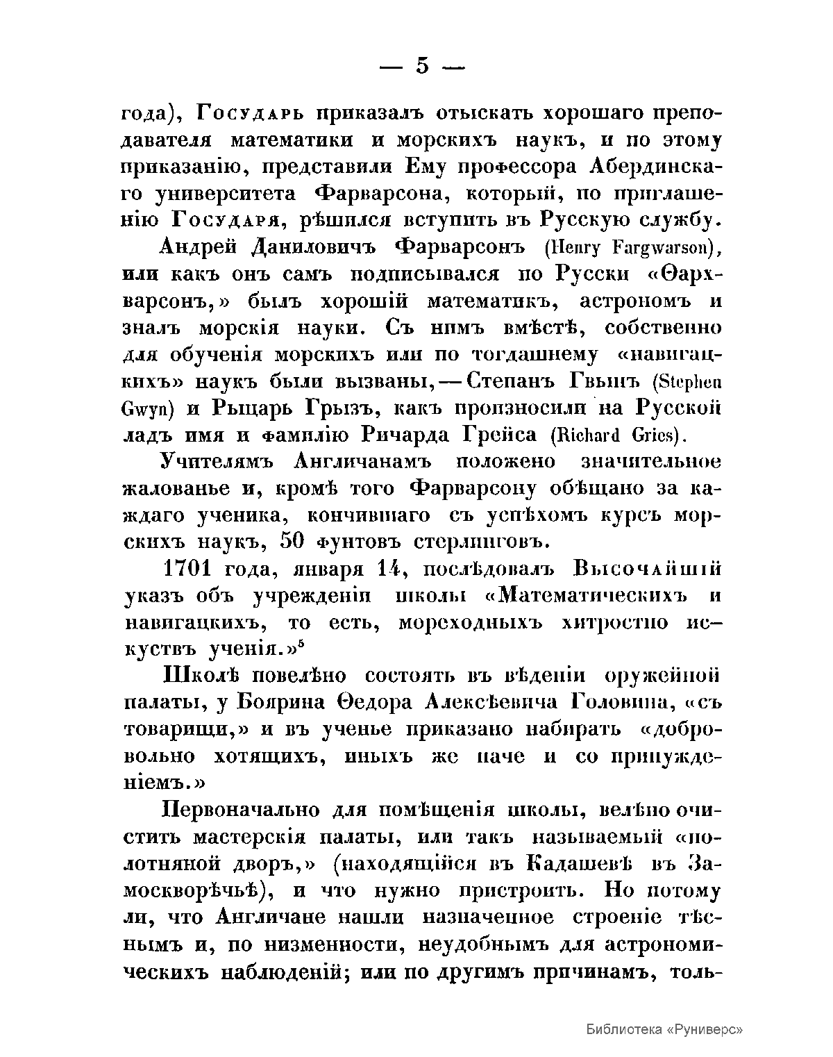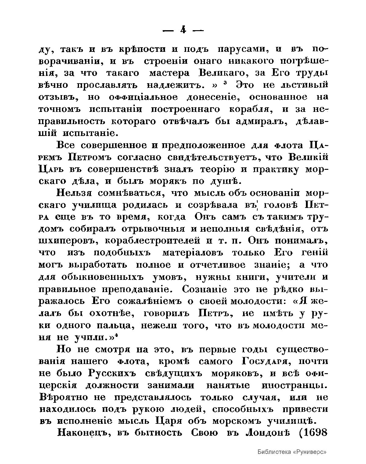 Данное издание является одним из первых исследований по истории военно-морского флота России, выходящее далеко за рамки описания только этого военно-учебного заведения и принадлежит перу выдающегося отечественного историографа Ф.Ф. Веселаго. Он сам закончил Морской корпус в 1834 году и, как один из лучших выпускников-мичманов, был зачислен для продолжения образования в Офицерский класс, в котором и был оставлен для дальнейшего прохождения службы. После того, как в 1852 году «Очерк истории Морского кадетского корпуса с приложением списка воспитанников за 100 лет» вышел в свет, Ф.Ф. Веселаго заслуженно удостоился за это произведение Демидовской премии Императорской Академии Наук и «высочайшего назначения» заняться обрабатыванием собранных им материалов по истории русского флота. Позднее, в 1860-е гг. Веселаго, заняв должность воспитателя будущего генерал-адмирала флота великого князя Алексея Александровича, фактически руководил составлением истории Российского флота при Морском министерстве, продолжив титаническую научно-исследовательскую работу, начатую С.И. Елагиным, безвременно ушедшим из жизни. В 1869 году он был избран членом Морского ученого комитета, а с 1873 года назначен председателем Комиссии по разбору, описанию и изданию дел архива Морского министерства за период до 1805 года; приступив к углубленным исследованиям отечественной военно-морской истории. Им впервые были опубликованы уникальные материалы, подтверждающие передовой и самостоятельный путь развития российского военно-морского искусства. В своих работах он подробно описывал морские бои и сражения, введя в научный оборот множество ранее неизвестных исторических фактов и значительно расширив источниковую базу исследований по этой тематике. Юбилейное издание, подробно описывающее основные вехи создания и развития Морского кадетского корпуса за столетие, предшественниками которого являлась знаменитая петровская «Навигацкая школа», расположенная в Сухаревой башне в Москве, а затем Морская академия или Академия морской гвардии. Фактически же Морской Шляхетный кадетский корпус как элитное военно-морское учебное заведение, расположенное в новом здании (бывшем дворце Миниха) на Васильевском Острове в Санкт-Петербурге, был учрежден в царствование императрицы Елизаветы Петровны 15 декабря 1752 года. Вновь образованное военно-учебное заведение объединило под одной крышей упраздненные Московскую навигацкую школу, Морскую академию (морской гвардии), гардемаринскую роту и морскую артиллерийскую школу. В очерке, в основном с использованием материалов из журналов Адмиралтейств-коллегии, подробно повествуется об организации и деятельности Навигацкой школы, личном участии Петра Великого в обучении ее воспитанников, подробно описаны расписания занятий и учебный план для первых русских военных моряков, роль первого российского императора и последующих монархов в создании морского офицерского корпуса России. Особенно тепло рассказано о последнем по тому времени периоду истории Морского кадетского корпуса, деятельности его директоров, прежде всего, адмирала И.Л. Голенищева-Кутузова, отдавшего 40 лет своей службы руководству корпусом. Накануне Отечественной войны, в 1811 году сначала инспектором, а с 1827 года и вплоть до своей кончины – директором Морского ка