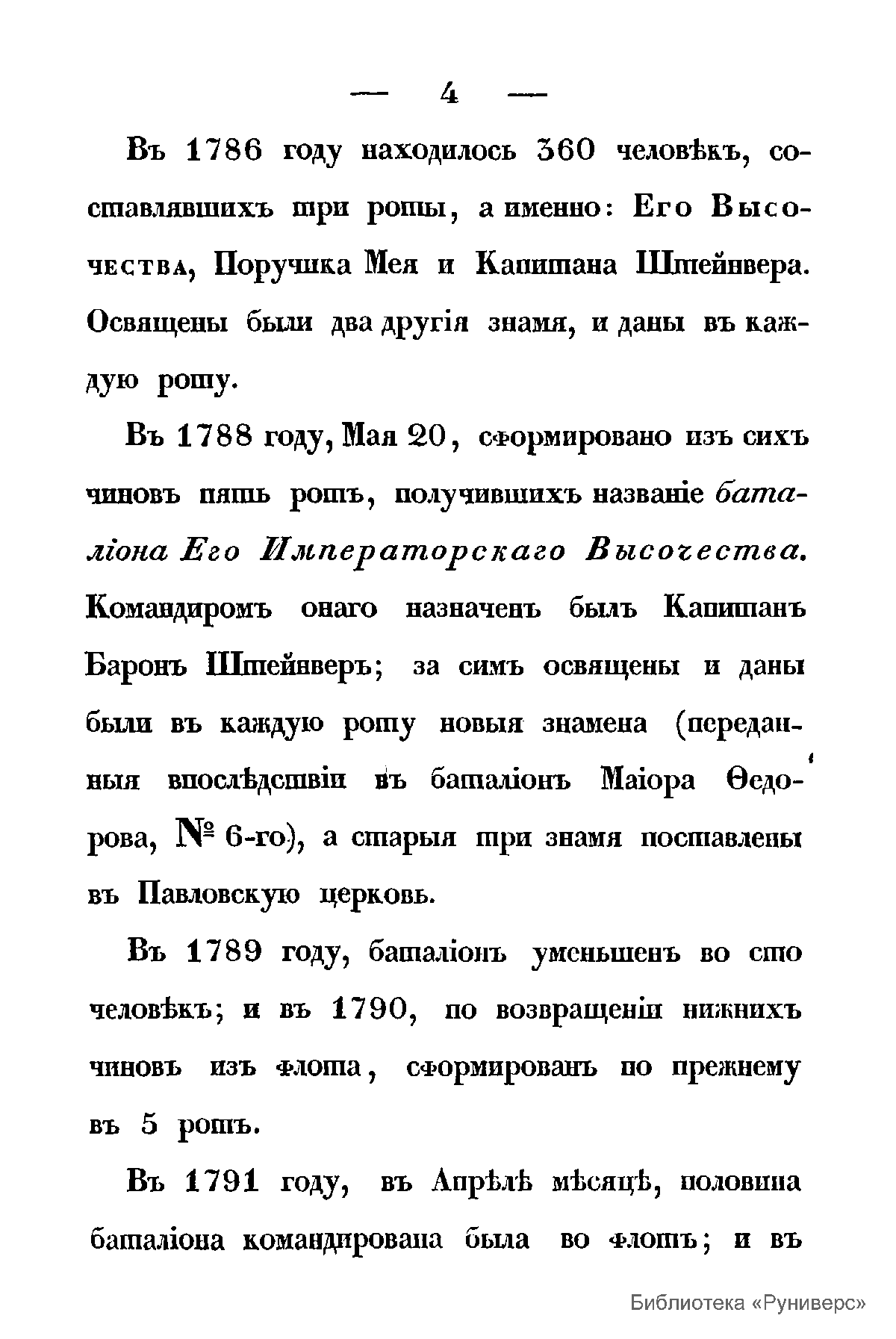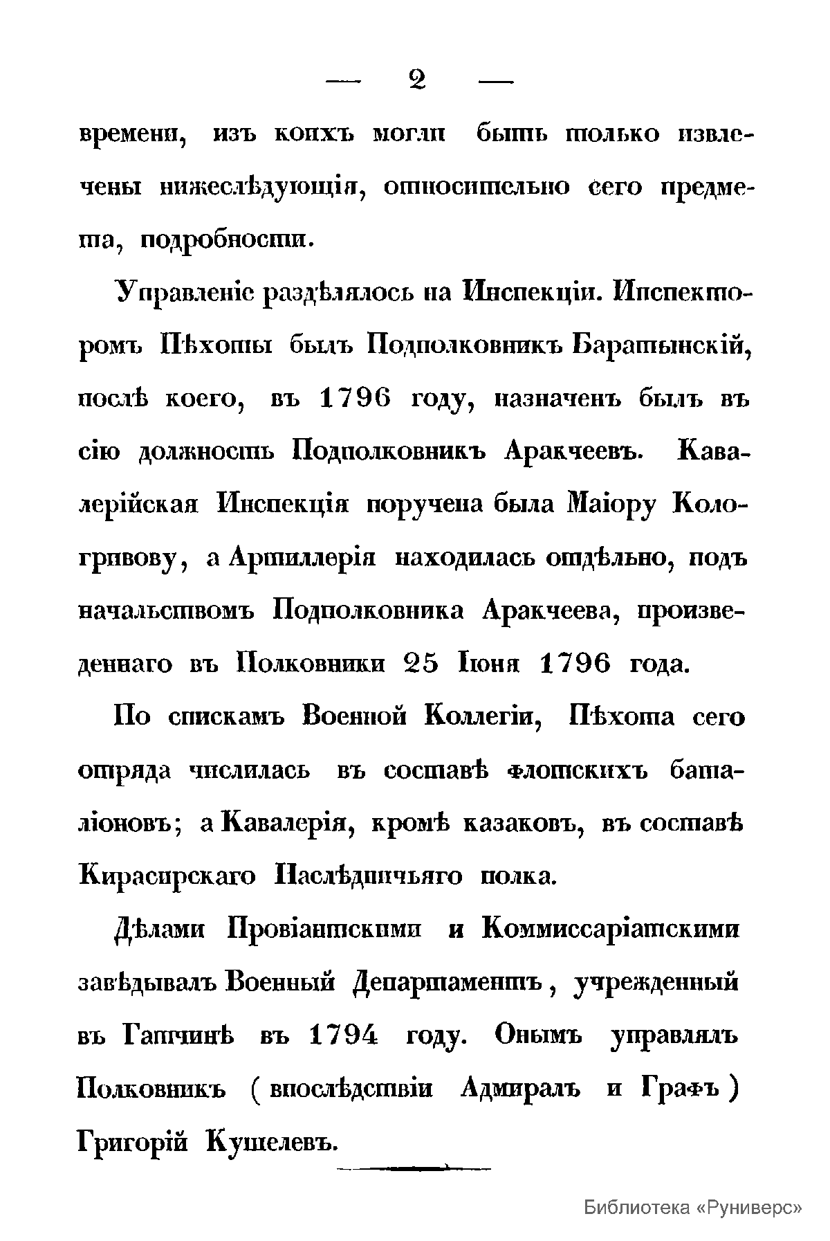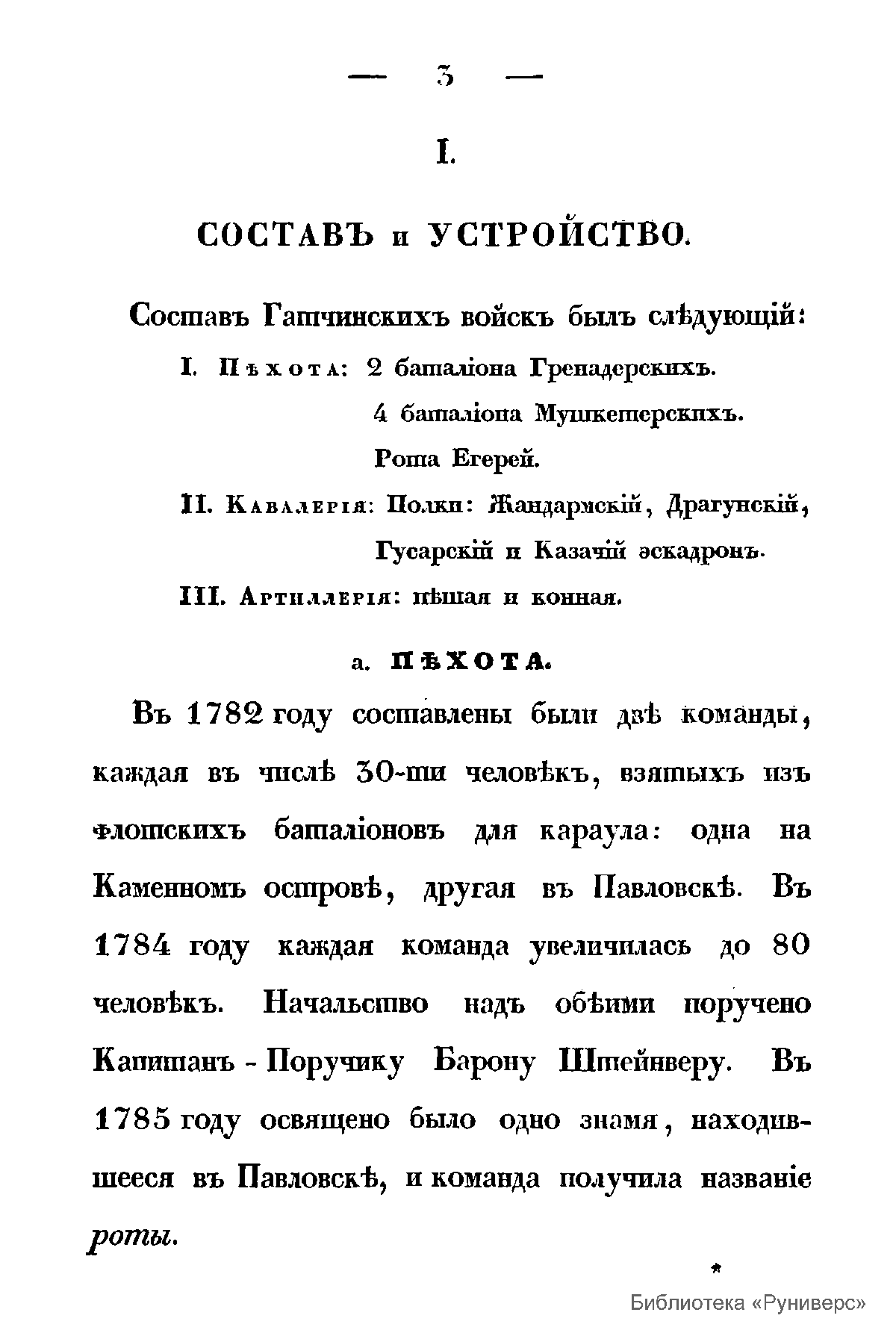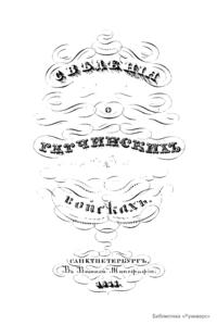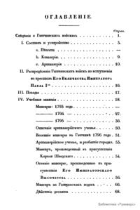 Данное издание 1835 г. посвящено «гатчинским войскам» - особому контингенту войск, расположенному в Гатчине и Павловске и состоявшем в 1786 – 1795 гг. в непосредственном подчинении наследнику российского престола Великого Князя Павла Петровича, будущего императора Павла I. С вступлением его на престол Павел «гатчинские войска» вошли в состав гвардии. В книге изложена информация о составе и устройстве «гатчинских войск», их участии в походах и маневрах, форме одежды. Также даны списки шефов и командиров, списки офицеров «гатчинских войск».