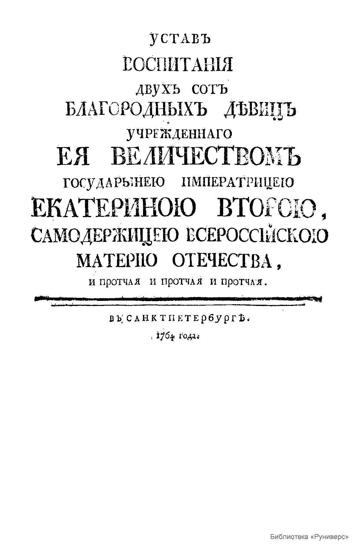 Уставъ воспитанiя двухъ сотъ благородныхъ дѣвицъ учрежденнаго Ея Величествомъ Государынею Императрицею Екатериною Второю, Самодержицею Всероссiйскою Матерiю Отечества, и протчая и протчая и протчая
