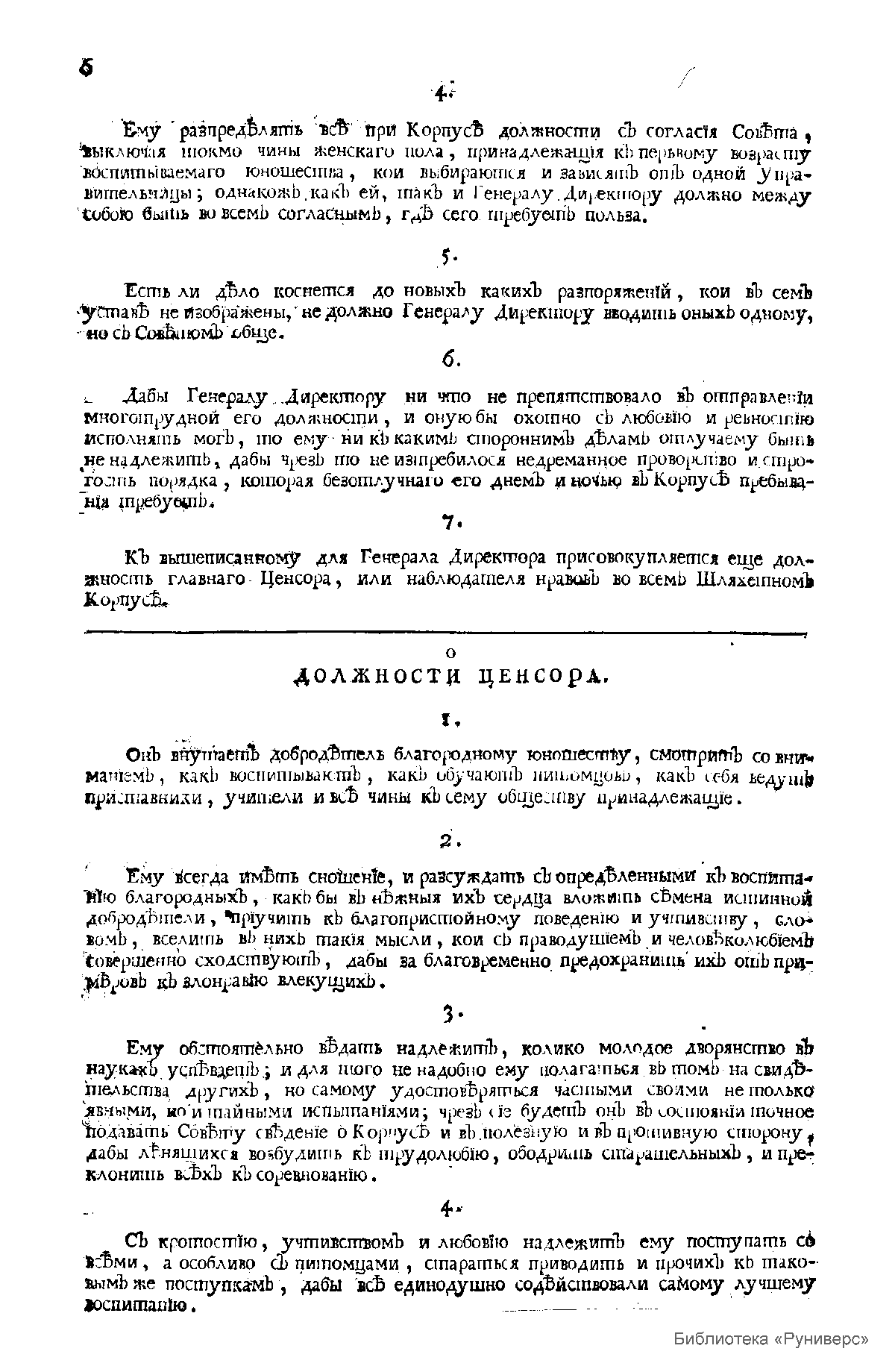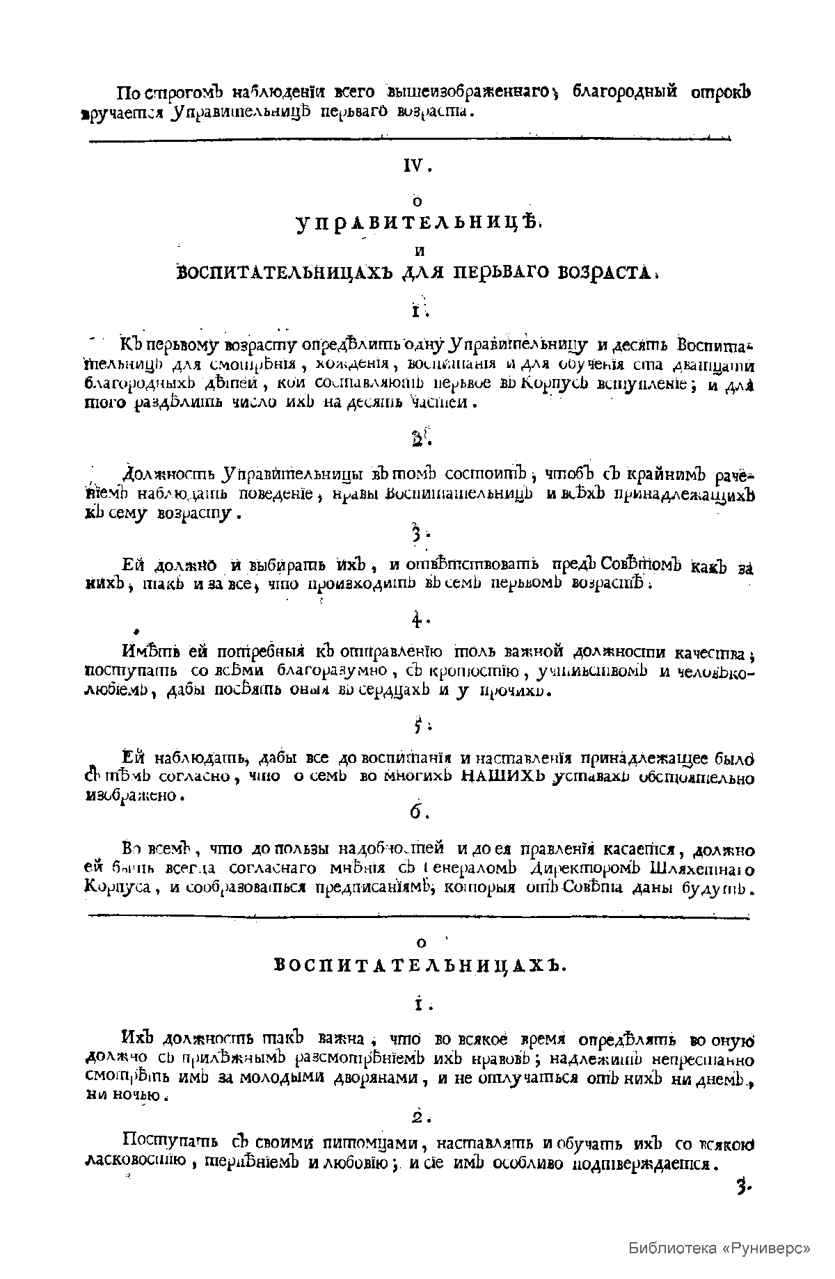 Вниманию читателей представлено первое издание Устава Императорского сухопутного шляхетного кадетского корпуса (под разными названиями – 1732 – 1918 гг.), который было составлен в 1766 г. его шефом, генералом-поручиком И.И. Бецким. Устав вводил 5 возрастов, каждый состоял из 5 отделений, где обучались и дворянские дети, и гимназисты - то есть дети разночинцев. Из гимназистов предполагалось готовить преподавателей для корпуса. Дворяне и разночинцы должны были воспитываться и обучаться на равных правах. Этим Бецкой намеревался сблизить представителей молодого поколения различных сословий и исключить в будущем разногласий между ними. Устав кадетского корпуса устанавливал основы не только профессионального обучения, но и нравственного воспитания кадетов, что отвечало принципам Эпохи Просвещения.