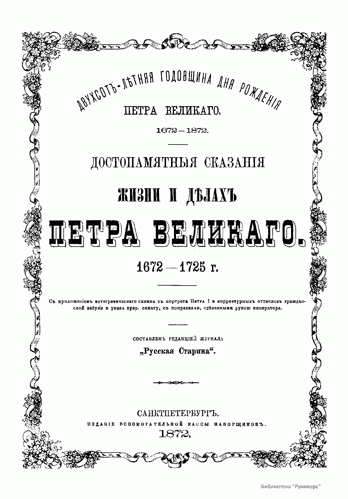 Двухсотъ-лѣтняя годовщина дня рожденiя Петра Великаго. 1672-1872. Достопамятныя сказанiя жизни и дѣлахъ Петра Великаго 1672-1725 г.