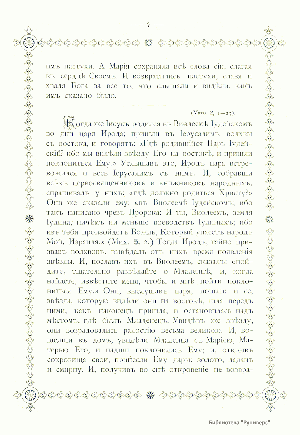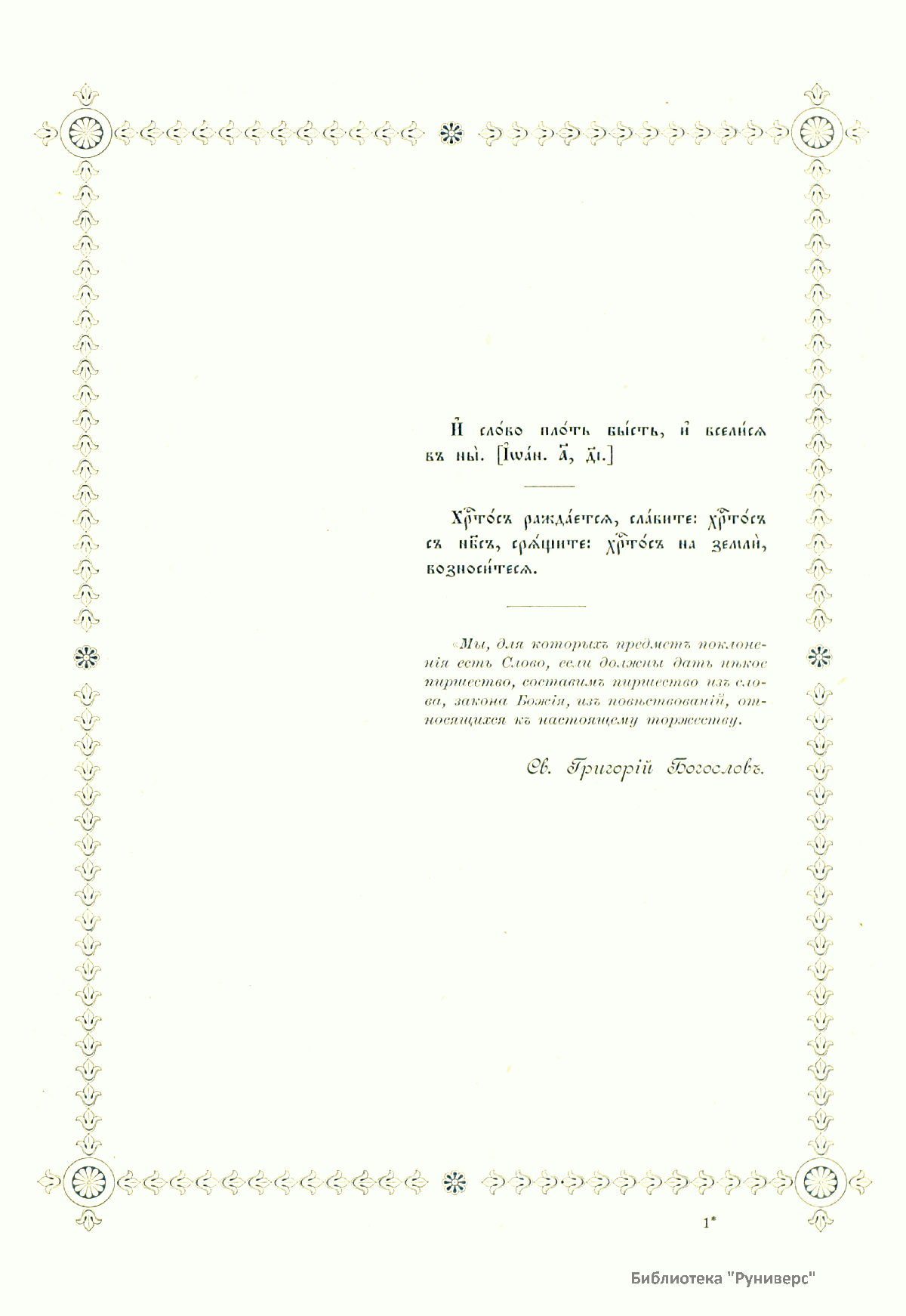 Рождество Христово – один из главных христианских праздников, установленных, согласно церковному вероучению, в честь рождения Христа. Отмечается 25 декабря (в одних странах по новому стилю, в других – по старому, что соответствует 7 января нового стиля). Праздничное издание Московской Синодальной типографии представляет собой сборник текстов на Рождество Христово. Это рассказы из Евангелия, Четий-Миней, слова Григория Богослова, Филарета – митрополита Московского, Макария – митрополита Московского, сочинения Иеронима – архиепископа Холмско-Варшавского, беседы Иннокентия – архиепископа Херсонского. В сборник включена праздничная церковная служба на церковнославянском языке с примечаниями и нотным приложением песнопений.