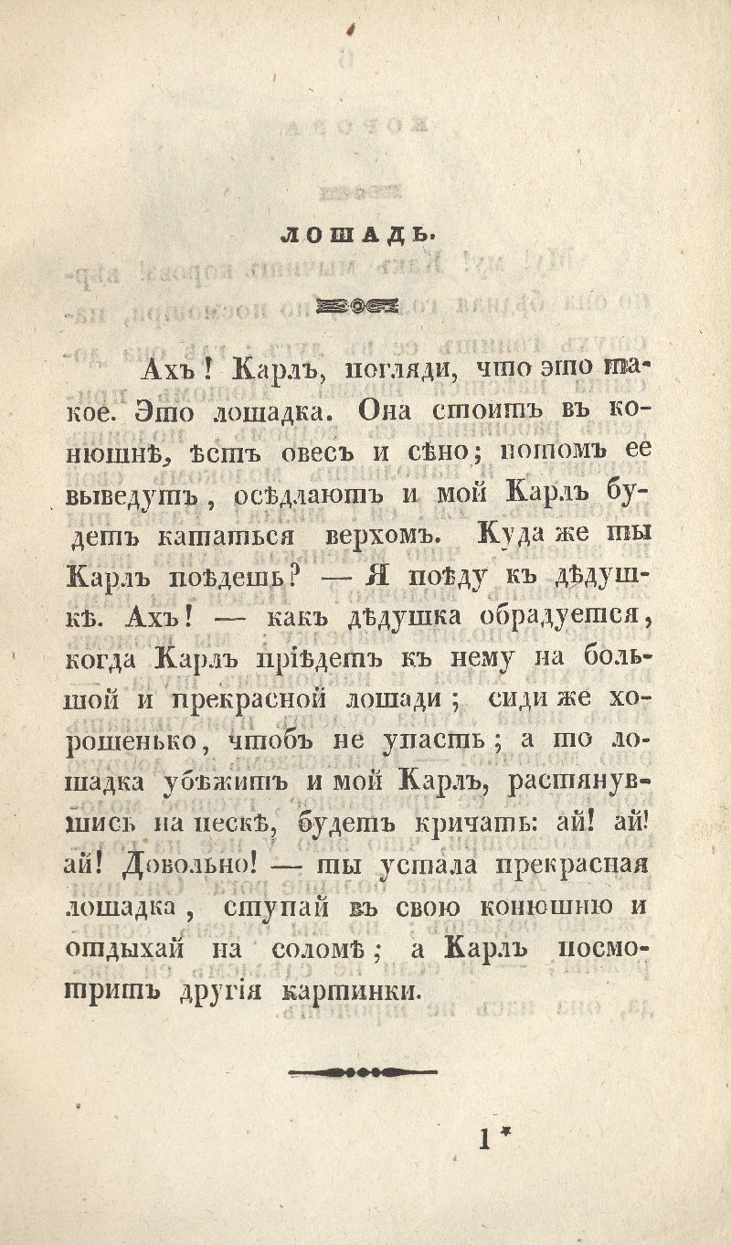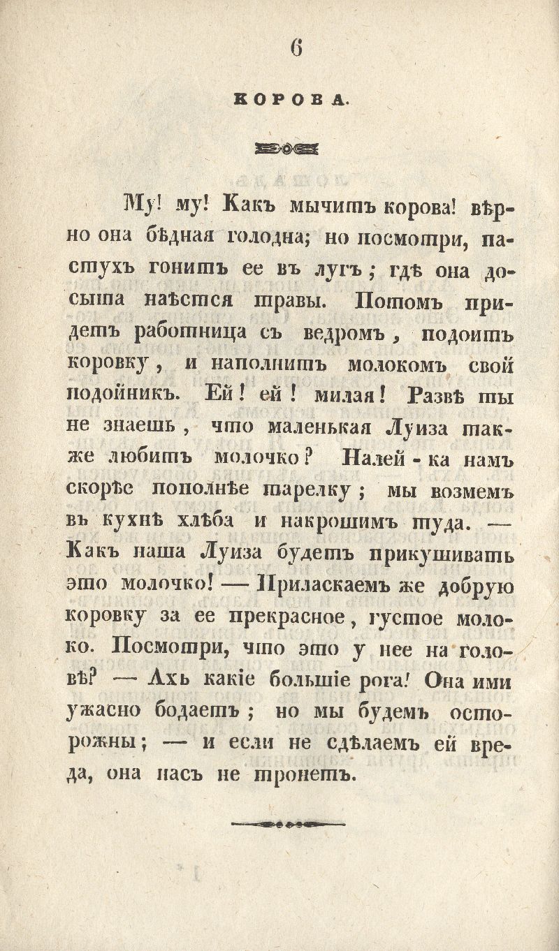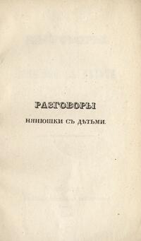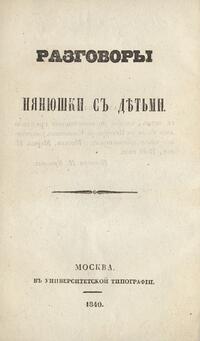 Издание «Разговоры нянюшки с детьми» – типичный пример познавательной литературы для детей второй половины XIX века. Такого рода книги охотно издавала Университетская типография. «Разговоры нянюшки...» – это десять небольших рассказов: «Корова», «Овца», «Петух», «Птица» и др., которые знакомят детей в основном с представителями животного мира, с их повадками и образом жизни. Все рассказы объединены героями – маленькими детьми: мальчиком Карлом и девочкой Луизой. Каждый рассказ сопровождает иллюстрация. Автор называет на обложке изображения «виньетками», но это – полноценные иллюстрации, призванные наиболее правдиво и точно изобразить предмет каждого рассказа няни.