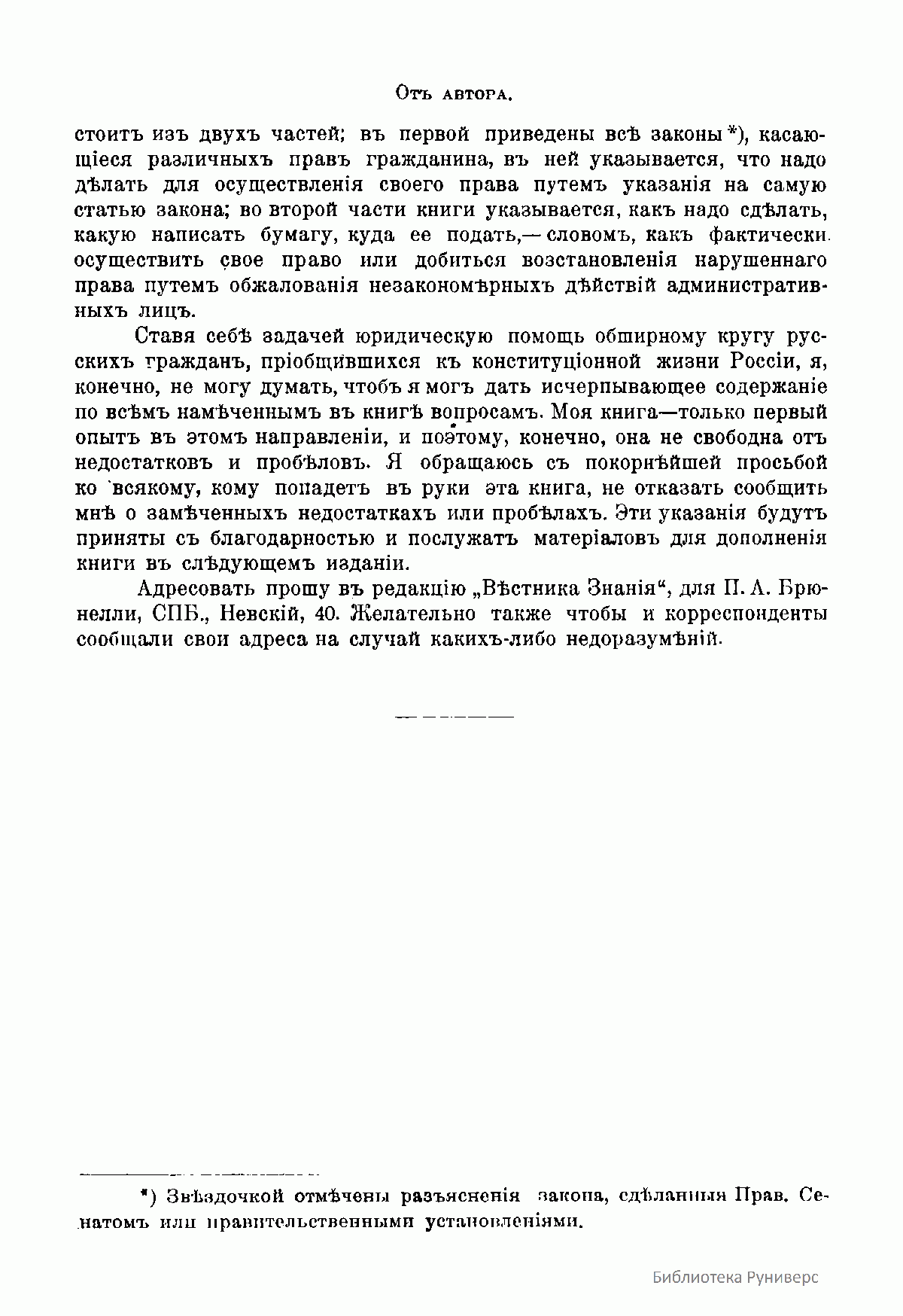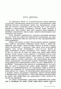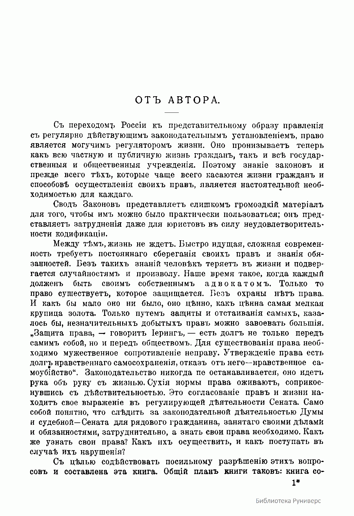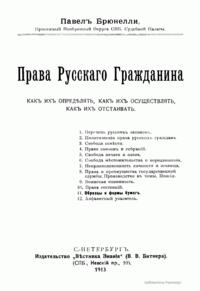 С переходом России к представительному образу правления с регулярно действующим законодательным установлением, право является могучим регулятором жизни. Оно пронизывает теперь как всю частную и публичную жизнь граждан, так и все государственные и общественные учреждения. Поэтому знанием законов и, прежде всего, тех, которые чаще касаются жизни граждан и способов осуществления своих прав, является настоятельной необходимостью для каждого. Законодательство никогда не останавливается, оно идет рука об руку с действительностью. Сухие нормы права оживают, соприкоснувшись с действительностью. Это согласование прав и жизни находит свое выражение в регулирующей деятельности Сената. Само собой понятно, что следить за законодательной деятельностью Думы и судебной – Сената для рядового гражданина, занятого своими делами и обязанностями, затруднительно, а знать свои права необходимо. Как же узнать свои права? Как их осуществить, и как поступать в случае их нарушения? С целью содействия посильному разрешению этих вопросов и составлена эта книга. Общий план книги таков: книга состоит из двух частей. В первой – приведены все законы, касающиеся различных прав гражданина, в ней указывается, что надо делать для осуществления своего права путем указания на саму статью закона. Во второй части книги указывается, как надо сделать, какую написать бумагу, куда ее подать, – словом, как фактически осуществить свое право или добиться восстановления нарушенного права путем обжалования незакономерных действий административных лиц.
