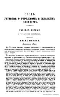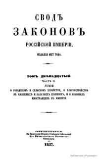 Сводъ законовъ Россiйской имперiи. Томъ двѣнадцатый. Часть II. Уставы о городскомъ и сельскомъ хозяйствѣ, о благоустройствѣ въ казенныхъ и казачьихъ селенiяхъ, и о колонiяхъ иностранцевъ въ имперiи