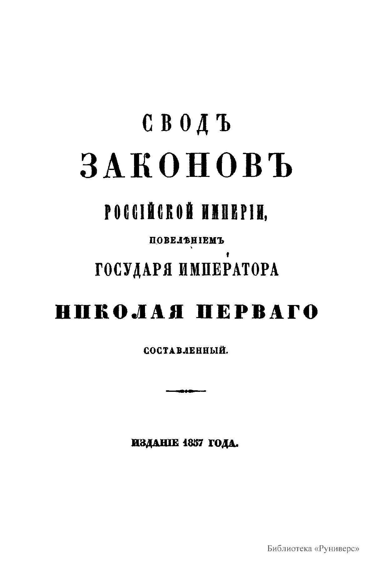 Свод законов Российской империи— официальное собрание расположенных в тематическом порядке действующих законодательных актов Российской империи, созданное при Николае I. Впервые он был напечатан в 1832 году. Манифестом 31 января 1833 года Свод законов был объявлен действующим источником права с 1 января 1835 года. Первое издание 1832 года и последующие 1842-го и 1857 года состояли из пятнадцати томов. После 1857 года Свод законов полностью не переиздавался, а выходили лишь отдельные тома. В качестве отдельного – 16-го тома в 1885 году вышли Судебные уставы. Между изданиями Свода законов выходили ежегодные и сводные (за несколько лет) «Продолжения» Свода законов с указанием на упраздненные и измененные статьи. В своде законов собраны все реально действовавшие в определенный момент времени законы по тем или иным проблемам права, это справочник для юристов. Отбор законодательного материала для включения в Свод производился на основе Полного собрания законов (первое Полное собрание законов, появившееся в 1830 году, состояло из 45 томов, содержащих 30 920 актов и 6 томов приложений). Собрание законов – это в большой степени историческое издание. По нему можно изучать развитие, направление правительственной мысли в стране. Это летопись отечественного законотворчества. Изучая страницу за страницей эту летопись, мы можем узнать, что в тот или иной момент истории являлось злобой дня.