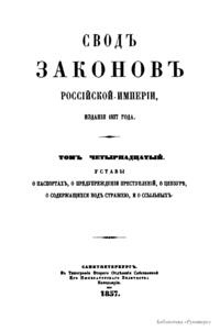 Свод законов Российской империи. Том четырнадцатый. Уставы о паспортах, о предупреждении преступлений, о цензуре, о содержащихся под стражею, и о ссыльных