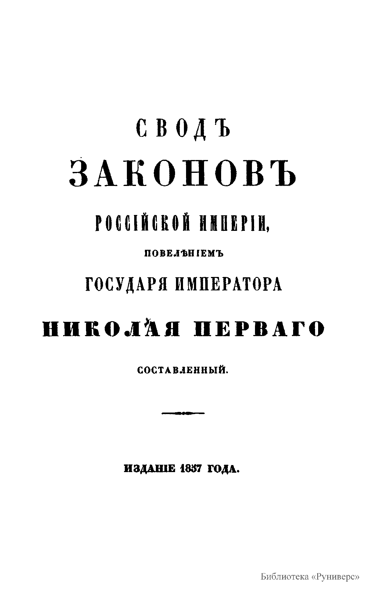 Свод законов Российской империи— официальное собрание расположенных в тематическом порядке действующих законодательных актов Российской империи, созданное при Николае I. Впервые он был напечатан в 1832 году. Манифестом 31 января 1833 года Свод законов был объявлен действующим источником права с 1 января 1835 года. Первое издание 1832 года и последующие 1842-го и 1857 года состояли из пятнадцати томов. После 1857 года Свод законов полностью не переиздавался, а выходили лишь отдельные тома. В качестве отдельного – 16-го тома в 1885 году вышли Судебные уставы. Между изданиями Свода законов выходили ежегодные и сводные (за несколько лет) «Продолжения» Свода законов с указанием на упраздненные и измененные статьи. В своде законов собраны все реально действовавшие в определенный момент времени законы по тем или иным проблемам права, это справочник для юристов. Отбор законодательного материала для включения в Свод производился на основе Полного собрания законов (первое Полное собрание законов, появившееся в 1830 году, состояло из 45 томов, содержащих 30 920 актов и 6 томов приложений). Собрание законов – это в большой степени историческое издание. По нему можно изучать развитие, направление правительственной мысли в стране. Это летопись отечественного законотворчества. Изучая страницу за страницей эту летопись, мы можем узнать, что в тот или иной момент истории являлось злобой дня.