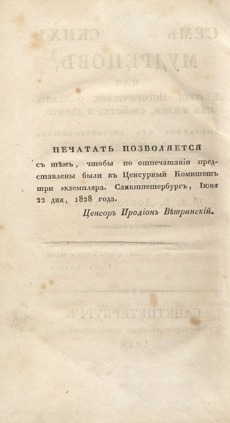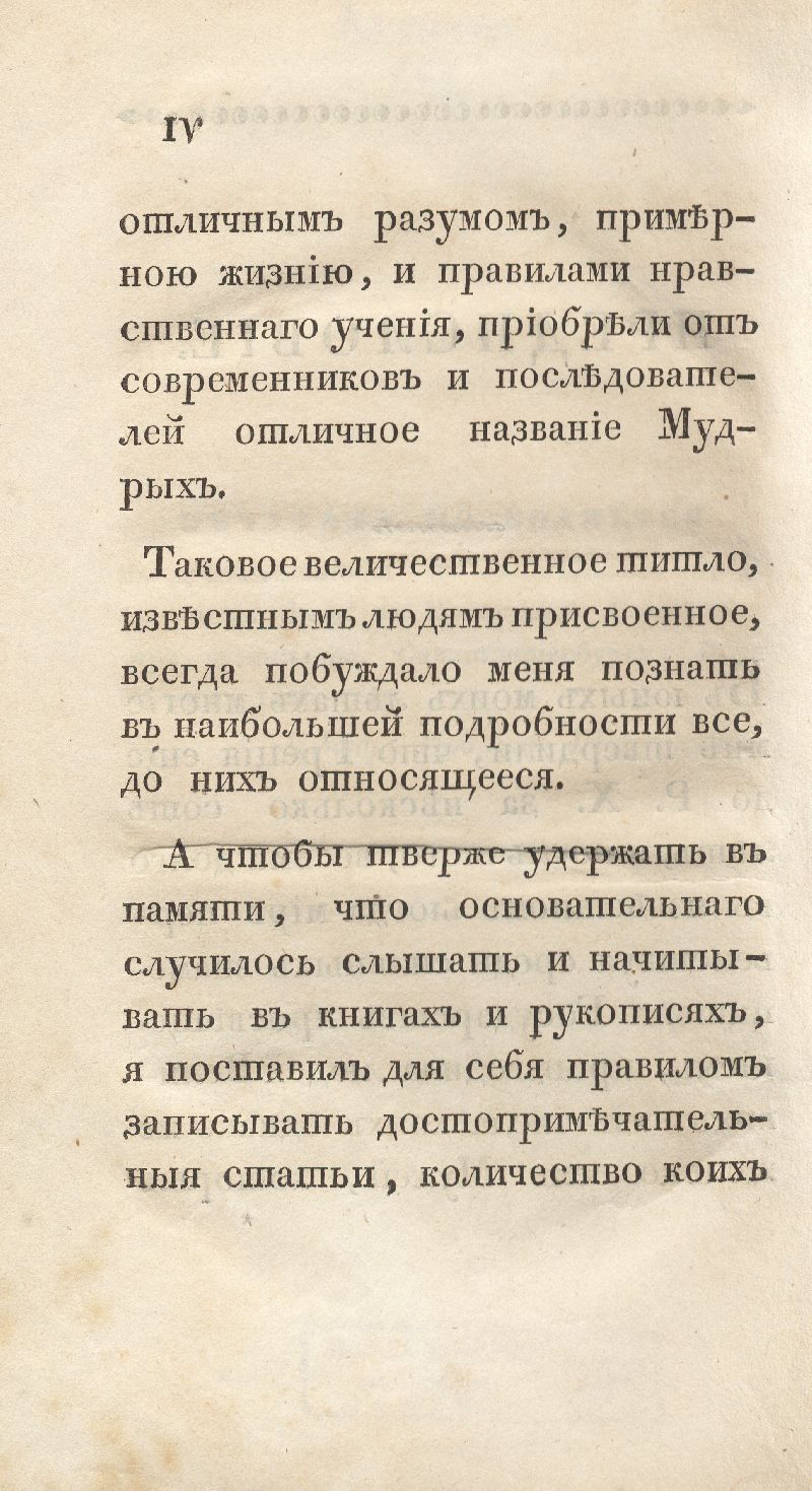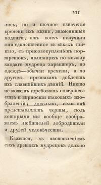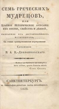Издание «Семь греческих мудрецов, или Краткое историческое описание их жизни, свойств и деяний...», как явствует из «Предисловия» автора, «доселе на отечественном языке издаваемо не было». И это действительно так. Автор пишет, что «нравственные и исторические книги» желаемы многими, а это значит, что читатель той эпохи испытывал недостаток в такого рода чтении. Выбрав из истории Греции семь мужей, которые удостоились «названия Мудрых», автор сложил для юного читателя небольшую книгу из семи рассказов. Каждый включал в себя известные изречения каждого из семи мудрецов, краткую биографию с указанием подвигов и приложением портретов, которые, несомненно, были условными.