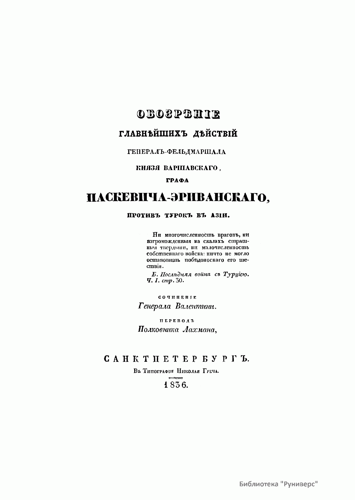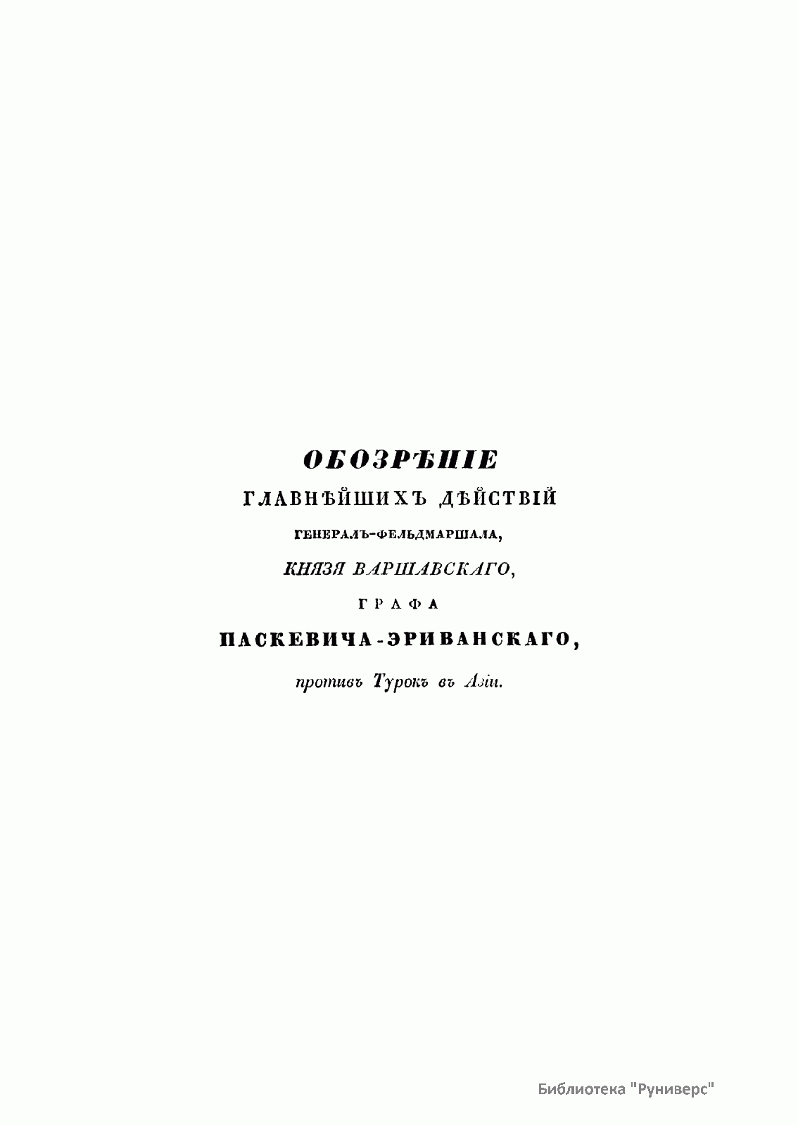 Обозрѣние главнѣйшихъ дѣйствiй генералъ-фельдмаршала князя Варшавскаго, графа Паскевича-Эриванскаго, противъ турокъ въ Азiи