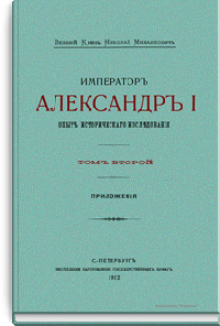 Великий князь Николай Михайлович – автор многих исторических трудов, посвященных эпохе Александра I и наполеоновских войн. «Император Александр I. Опыт исторического исследования» в двух томах (на французском языке. СПб., 1912. 2-е изд., 1914) – наиболее фундаментальный из них. Несмотря на обилие исторической литературы об эпохе Александра I, эта книга явилась новым словом в науке. Новизна ее состояла в том, что Николай Михайлович использовал много ранее недоступных материалов, хранящихся в секретных государственных архивах, на пользование которыми мог дать разрешение только император. Ему такое разрешение давалось. Естественно, доступ к закрытым архивам позволил по-иному проанализировать те или иные обстоятельства жизни Александра I. Также и все другие исследования александровской эпохи писались им с подобным изучением архивов и открыли много новых исторических фактов. В предисловии к изданию автор говорит о том, что стремился дать опыт исторического исследования характера и деятельности Александра Павловича не только как государя и повелителя земли русской, но и как человека. Кроме того, автор заявляет о своей беспристрастности: «…Мы даем материалы, которыми будущие русские историки могут воспользоваться. Не нам также решать вопрос, возвеличит или понизит предлагаемое исследование образ монарха». Первый том охватывает период с 1801 по 1825 год, содержит приложения и 46 иллюстраций. Во втором томе находятся различные документы и письма.