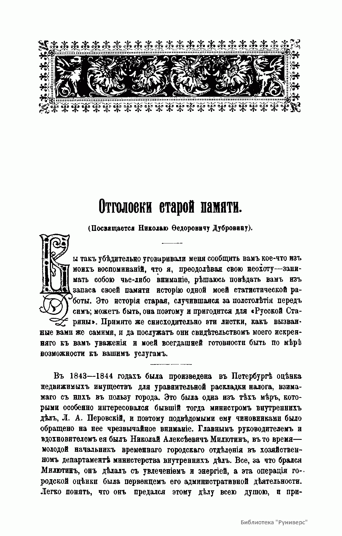 Крупным вкладом в журнал явились записки и дневник А. В. Никитенко (1888-1892), а также записки Н. И. Пирогова (1884-1885, 1887).