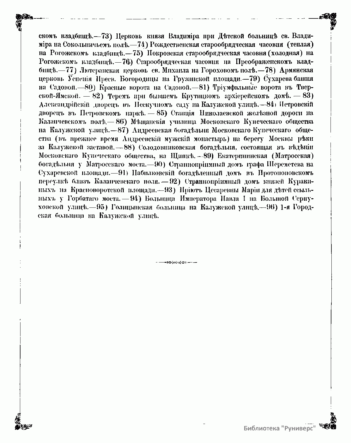 Цель настоящего издания сохранить на память будущему вида существовавших во второй половине девятнадцатого века в Москве храмов, не касаясь при этом того, какое значение они имеют в отношении историческом, археологическом или архитектурном. Местоположение большинства храмов было неудобно для фотографической съемки, поэтому автору не удалось сделать все снимки в одинаковом относительно действительности размере. Издание разделено на четыре части. 1. Кремль и Китай-город – 33 изображения. 2. Белый город – 59 изображений. 3. Земляной город в двух отделениях: а) его часть по левую сторону Москвы-реки – 72 изображения, б) часть Замоскворецкая – 36 изображений. 4. Местность за Земляным городом – 73 изображения. Приложенный к каждой части текст составляет оглавление.