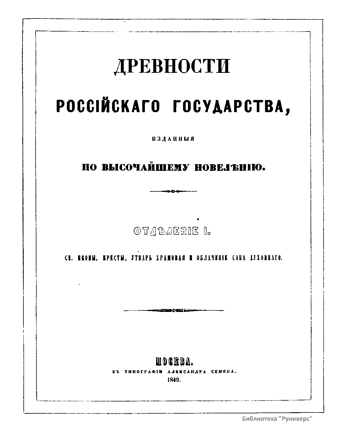 Авторы настоящего издания считают, что время охранения памятников России настало со вступления на престол Императора Николая I. Повелевая хранить памятники и остатки русских древностей, он приказал все, что заслуживает внимание и составляет материал истории, отчетливо срисовать, описать и издать. Император повелел учредить в Москве Комитет издания древностей Российского государства. Первый отдел огромного и великолепного издания «Древности Российского государства» состоит из 500 большого формата рисунков, распределенных по своему содержанию на шесть частей с соответствующим описанием. Первая часть «Древностей» заключает в себе священные памятники: а) образа и кресты, замечательные в историческом и художественном отношении, б) храмовую утварь разных времен, в) облачения духовного сана. Вторая часть содержит древний царский чин, или священное облачение русских великих князей и царей при поставлении на царство. В третьей части представлена древняя броня и оружие. Четвертую часть составляют древние великокняжеские, царские, боярские и местные народные одежды в изображениях и портретах. В пятой части можно увидеть древнюю царскую столовую утварь. Шестая часть состоит из памятников древнего русского зодчества.