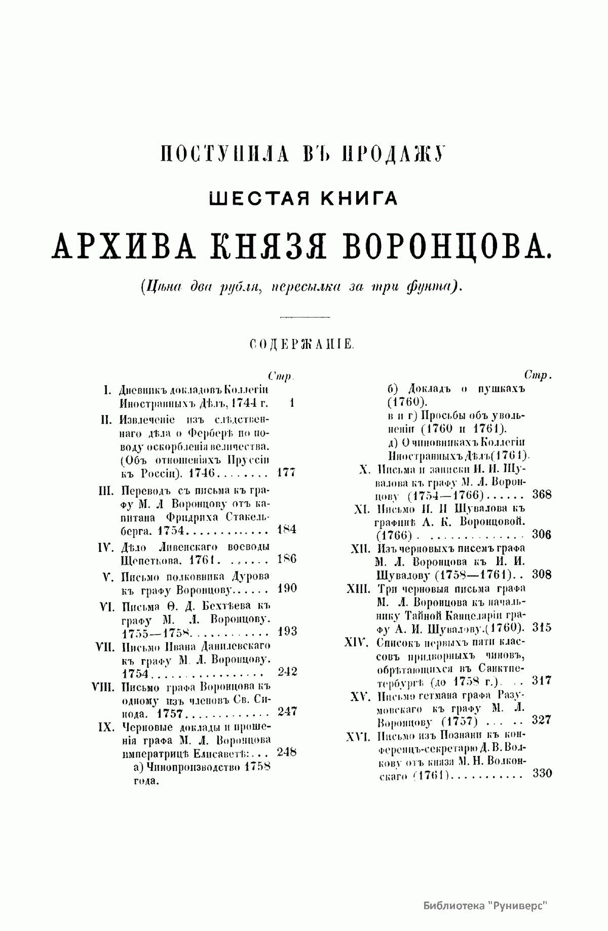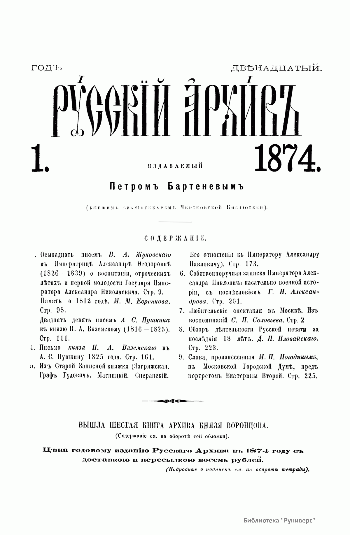 «Русский архив» — ежемесячный историко-литературный журнал, издававшийся в Москве с 1863 по 1917 год. Создателем и продолжительные годы редактором журнала был П. И. Бартенев – историк, археограф, библиограф. Этот журнал называли «живой картиной былого», поскольку он содержал преимущественно публикации неизданных мемуарных, эпистолярных, литературно-художественных и ведомственных документальных материалов, освещавших культурную и политическую историю России в XVIII и XIX вв. По числу опубликованных источников «Русский архив» стоит на первом месте среди русских исторических журналов.