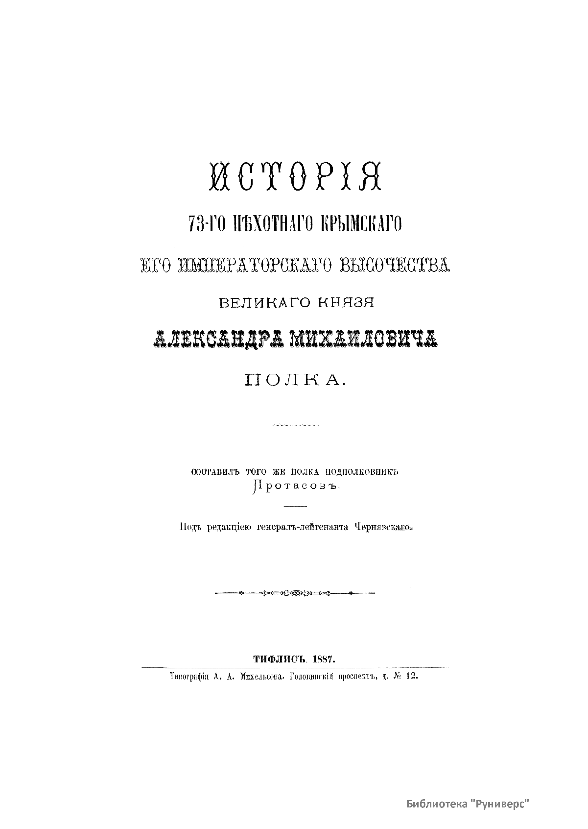 Исторiя 73-го пѣхотнаго крымскаго Его Императорскаго Высочества Великаго Князя Александра Михайловича полка