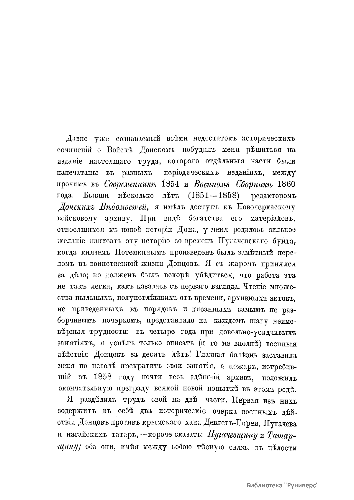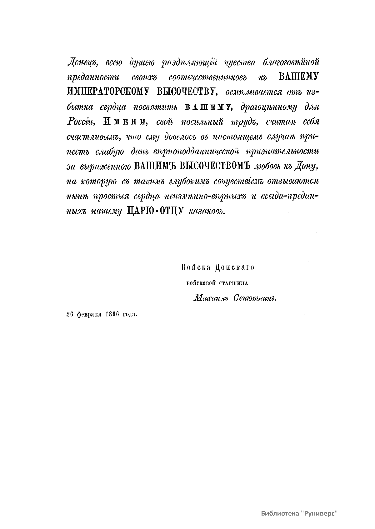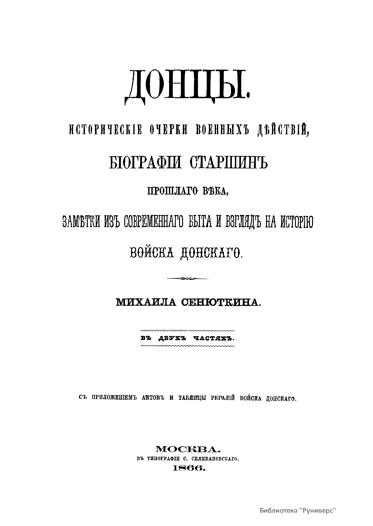 Книга включает в себя исторические очерки военных действий, заметки о быте, факты из истории войска Донского. Этот литературный труд многих лет вышел в канун 1870 г., празднования трехсотлетия войска Донского. Первая часть издания содержит два исторических очерка военных действий донцев против крымского хана Девлет-Гирея и Пугачева. Во второй части напечатаны биографии донских старшин и заметки из современного быта, в виде эпилога автор помещает свой взгляд на историю войска Донского, а в приложениях — таблицу регалий и важнейшие акты, относящиеся к эпохе. Сенюткин Михаил Христофорович (1825–1879) — журналист, редактор «Донских войсковых ведомостей». Основал неофициальный отдел в этой газете, где помещал статьи и материалы по истории Дона. Публиковался в столичных журналах «Современник» и «Военный сборник».